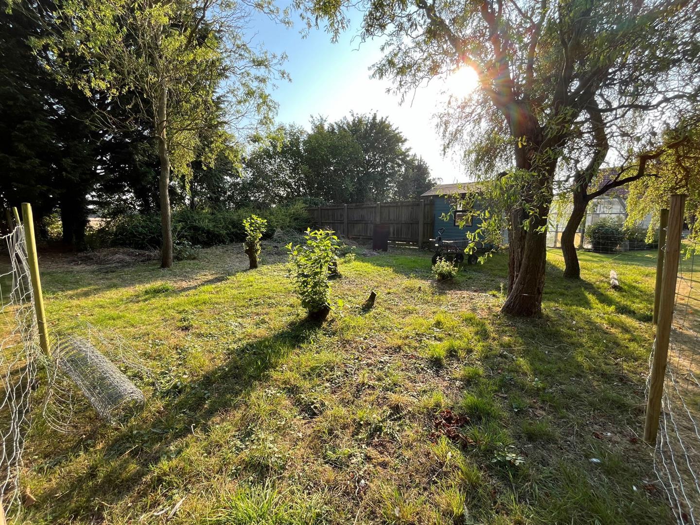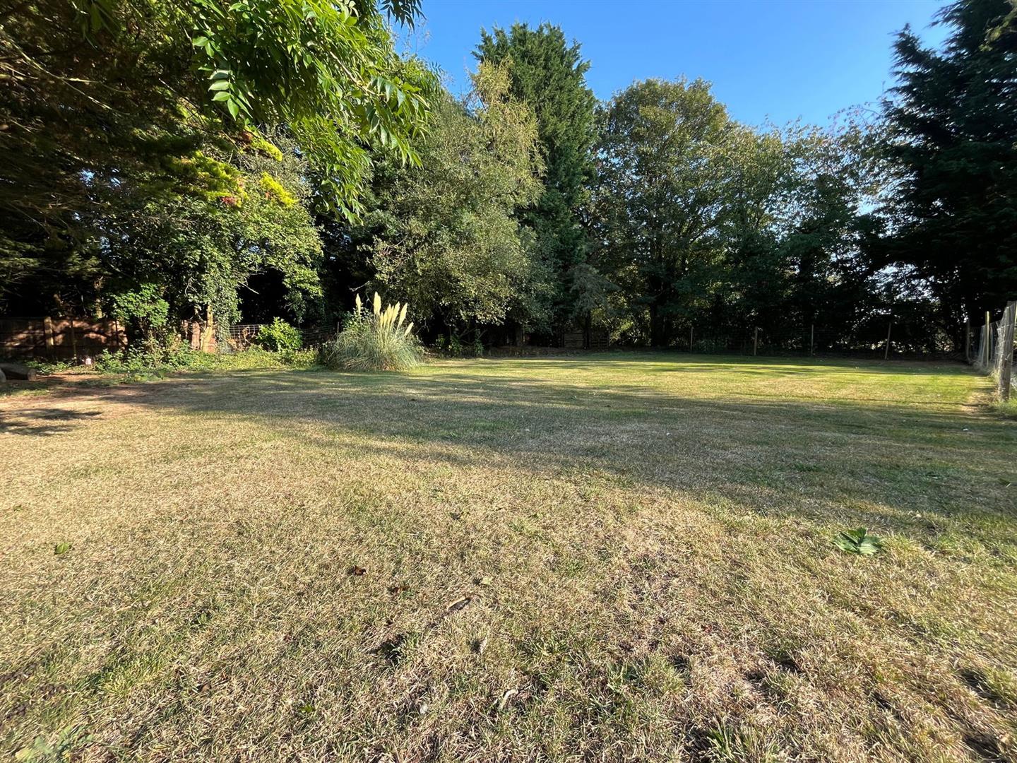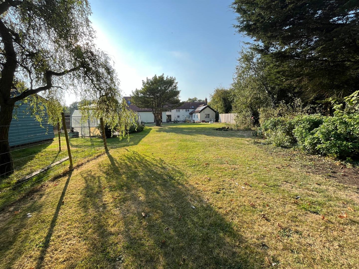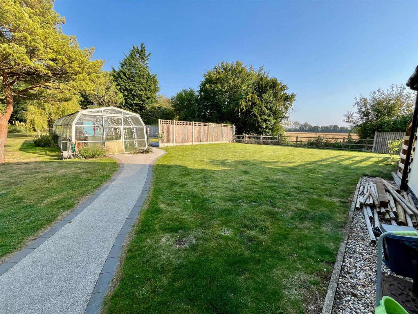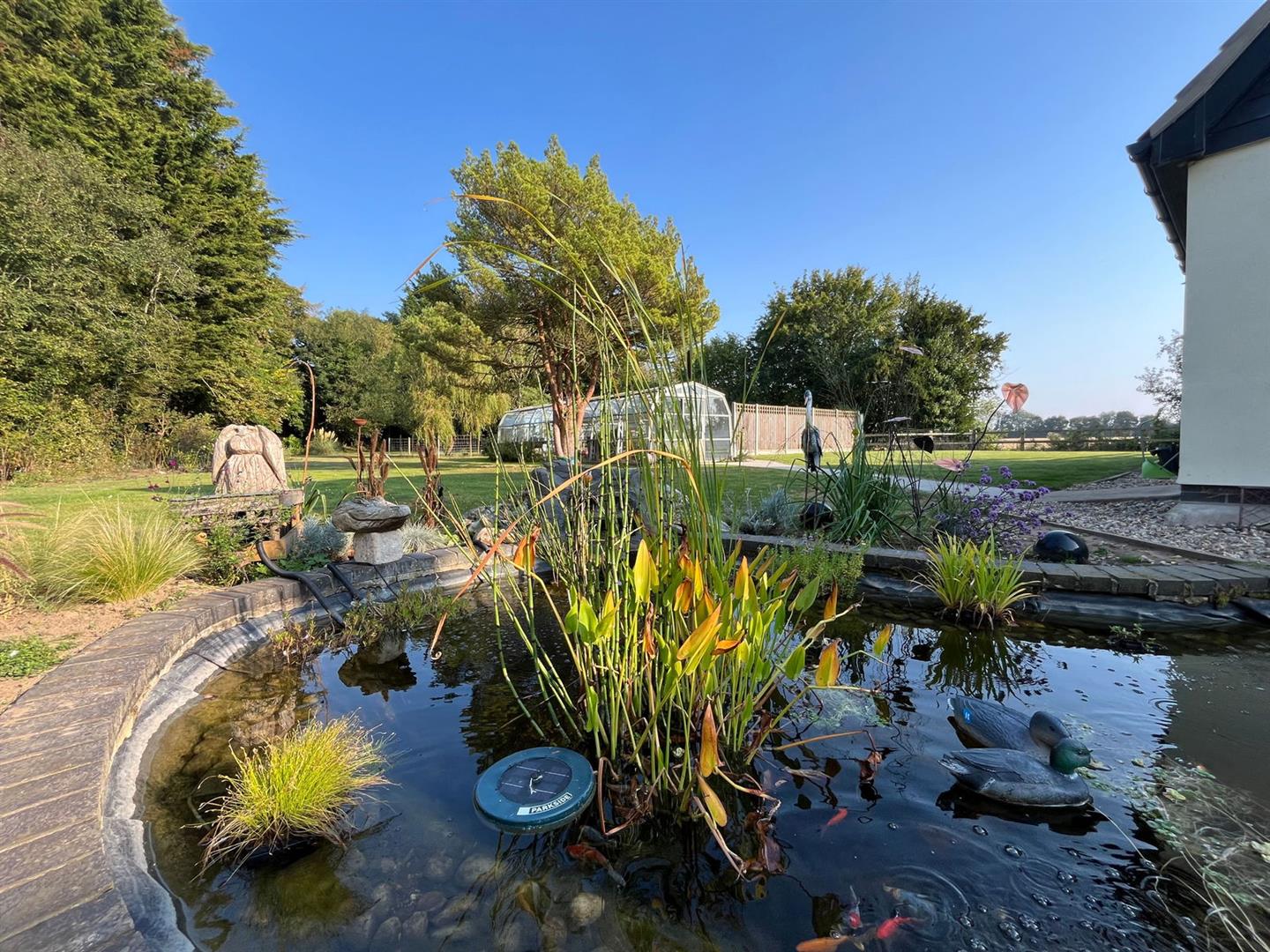 One section features a formal garden with a serene pond, offering beautiful views over the adjacent open fields. Another area is dedicated to fruit trees, while a large glasshouse and a fenced section make an ideal space for a vegetable plot. The boundaries of the garden are lined with mature trees, enhancing the sense of seclusion and tranquility, making this outdoor space perfect for relaxation and enjoying nature.