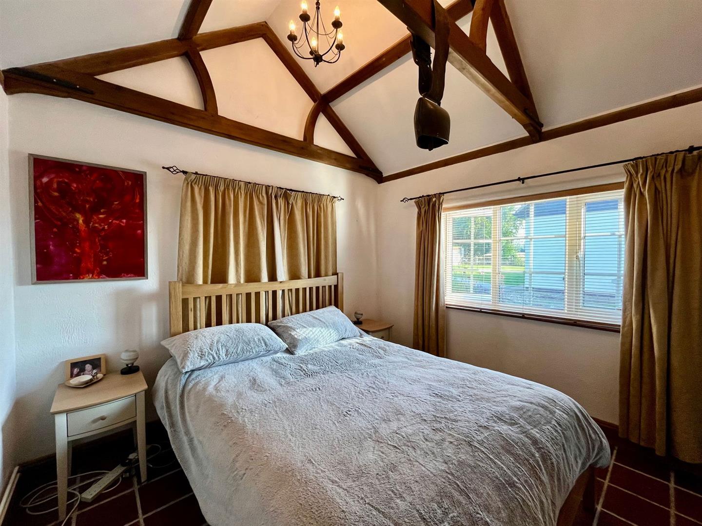 On the ground floor, you'll find a utility room featuring a traditional butler sink, and a shower room adorned with an ornate WC and high-level cistern. One of the bedrooms is also located on this level, boasting a vaulted ceiling and exposed beams, adding to the property's character.