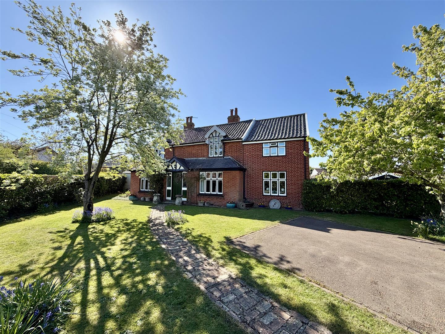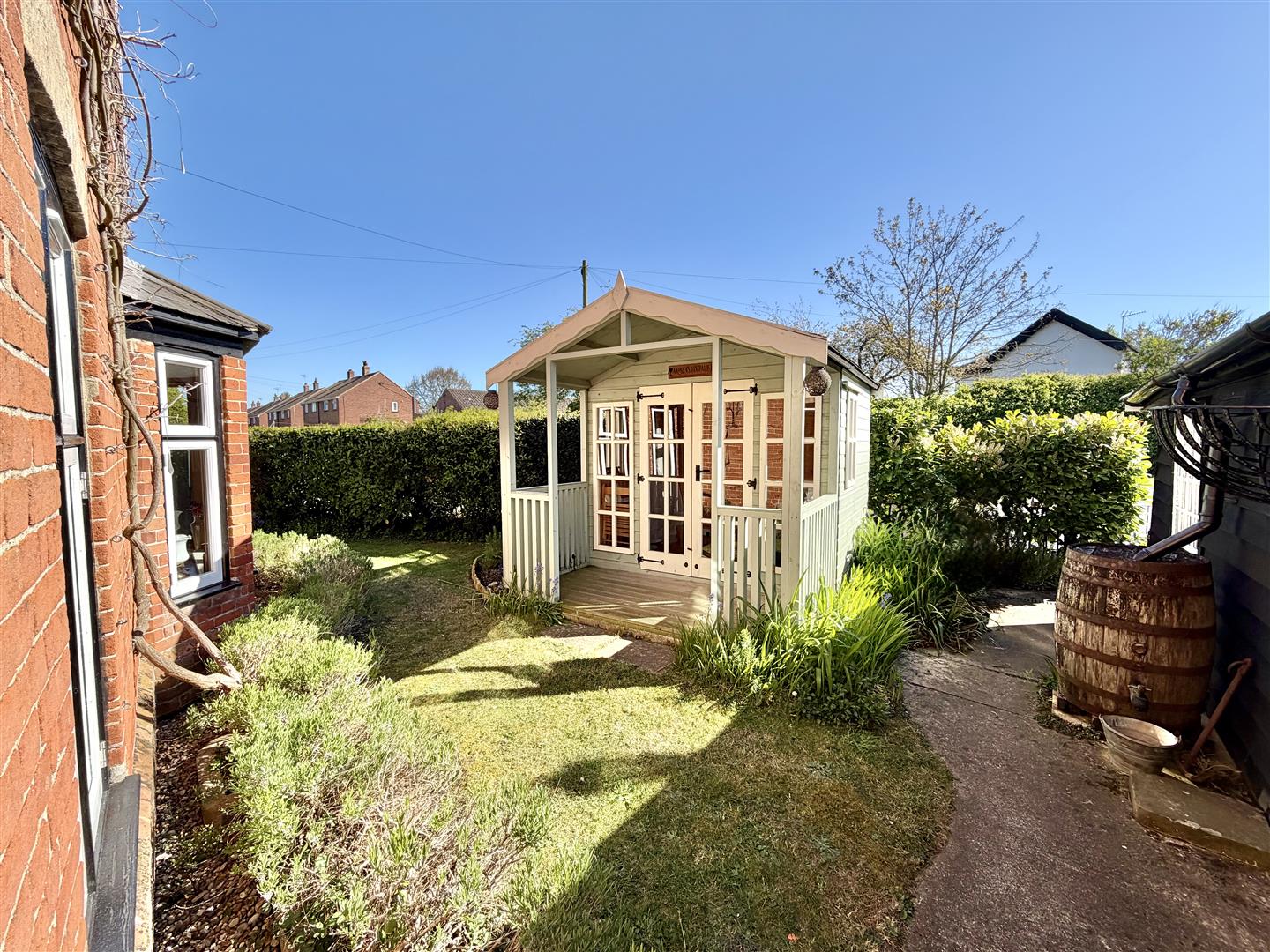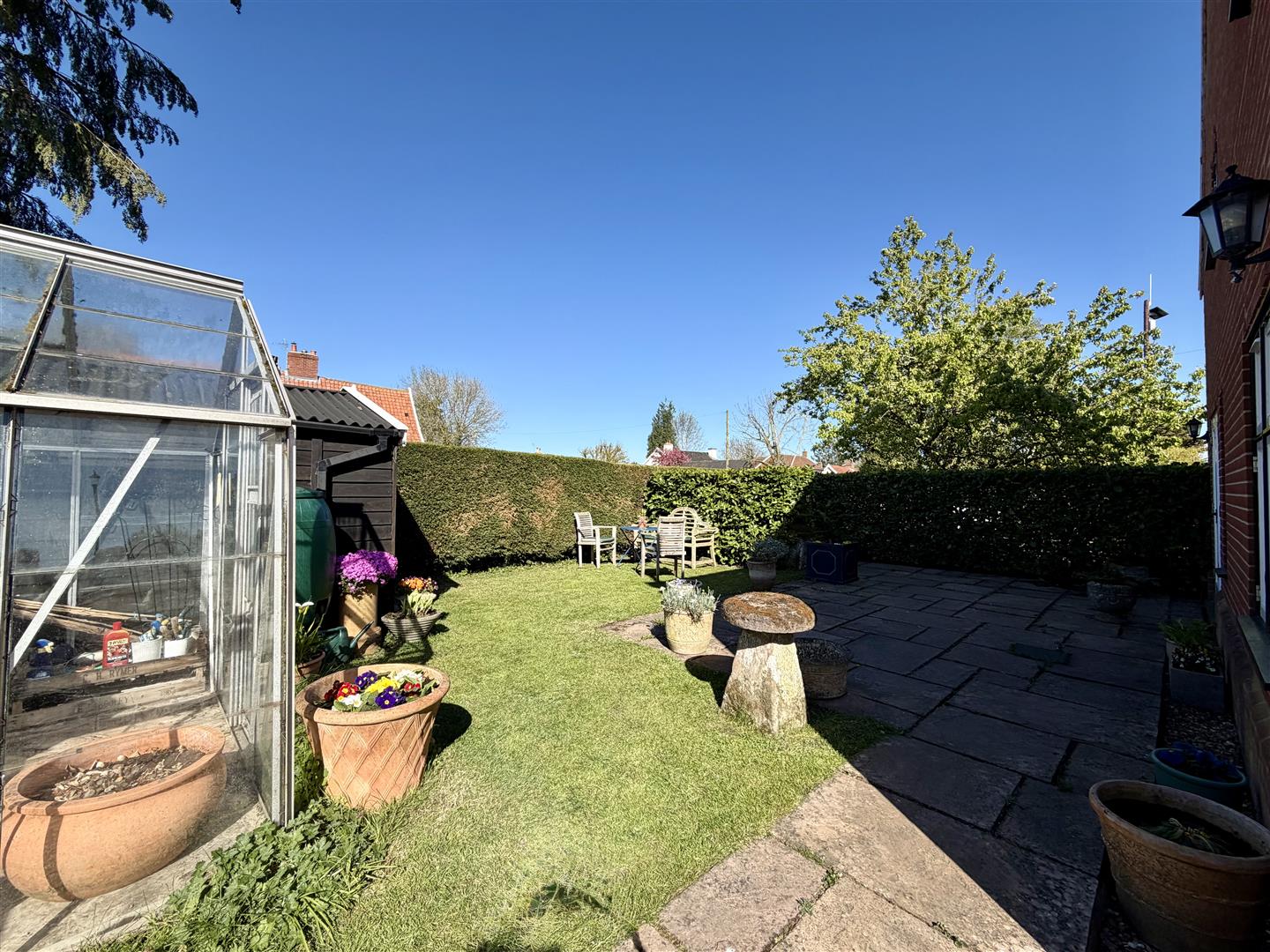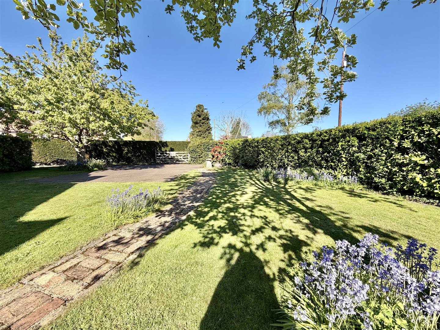 The property sits centrally within its plot, set back from the road and approached via a private driveway through a five-bar gate. There are a variety of interesting garden areas to explore, along with a separate vehicular access leading to the garage. Off the garden room, a patio offers a pleasant space for summer evening seating, enjoying views over the garden.