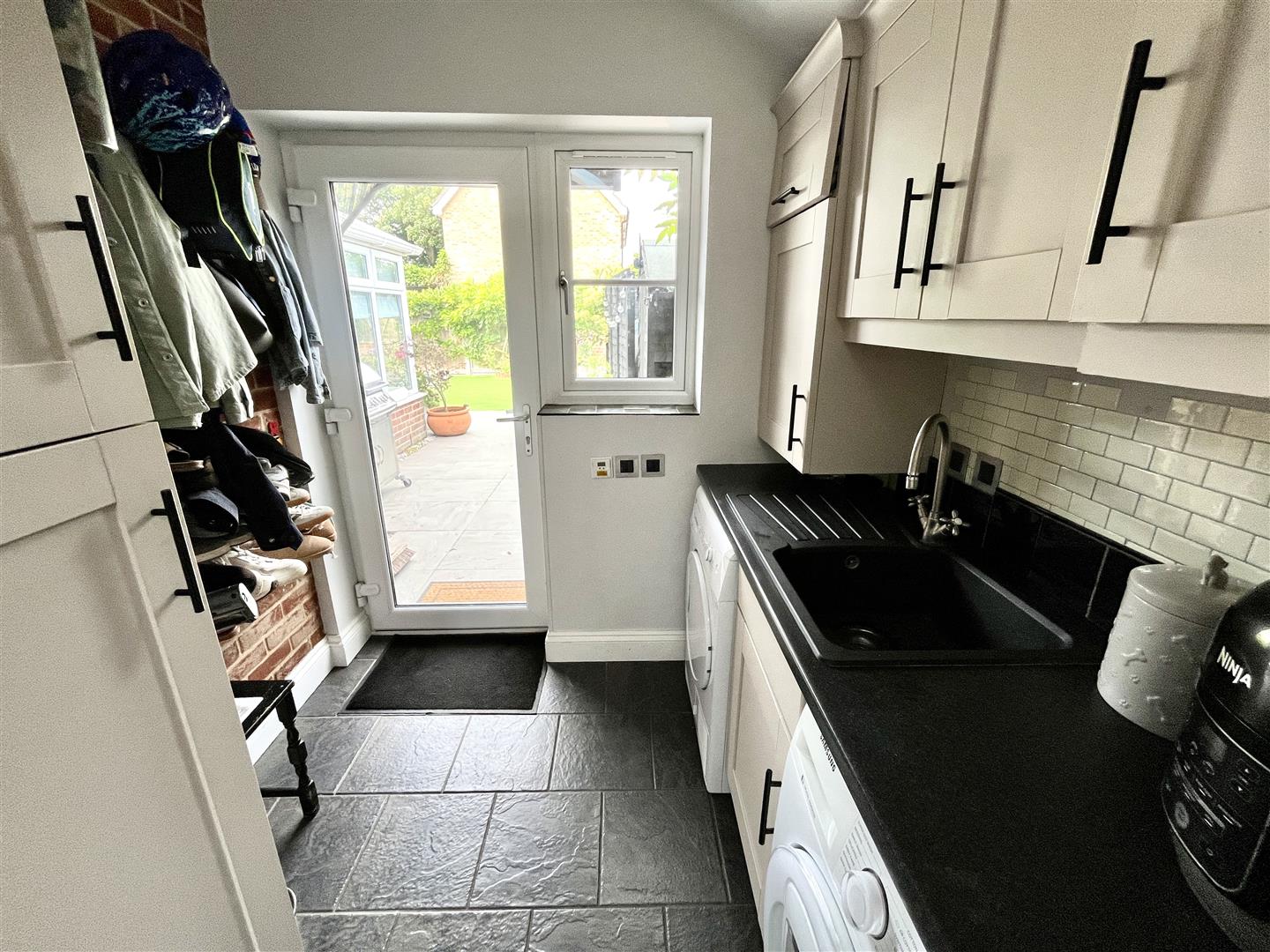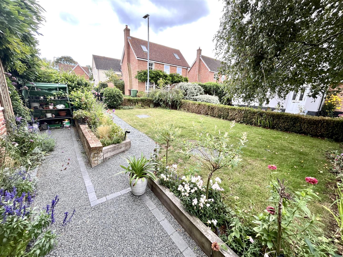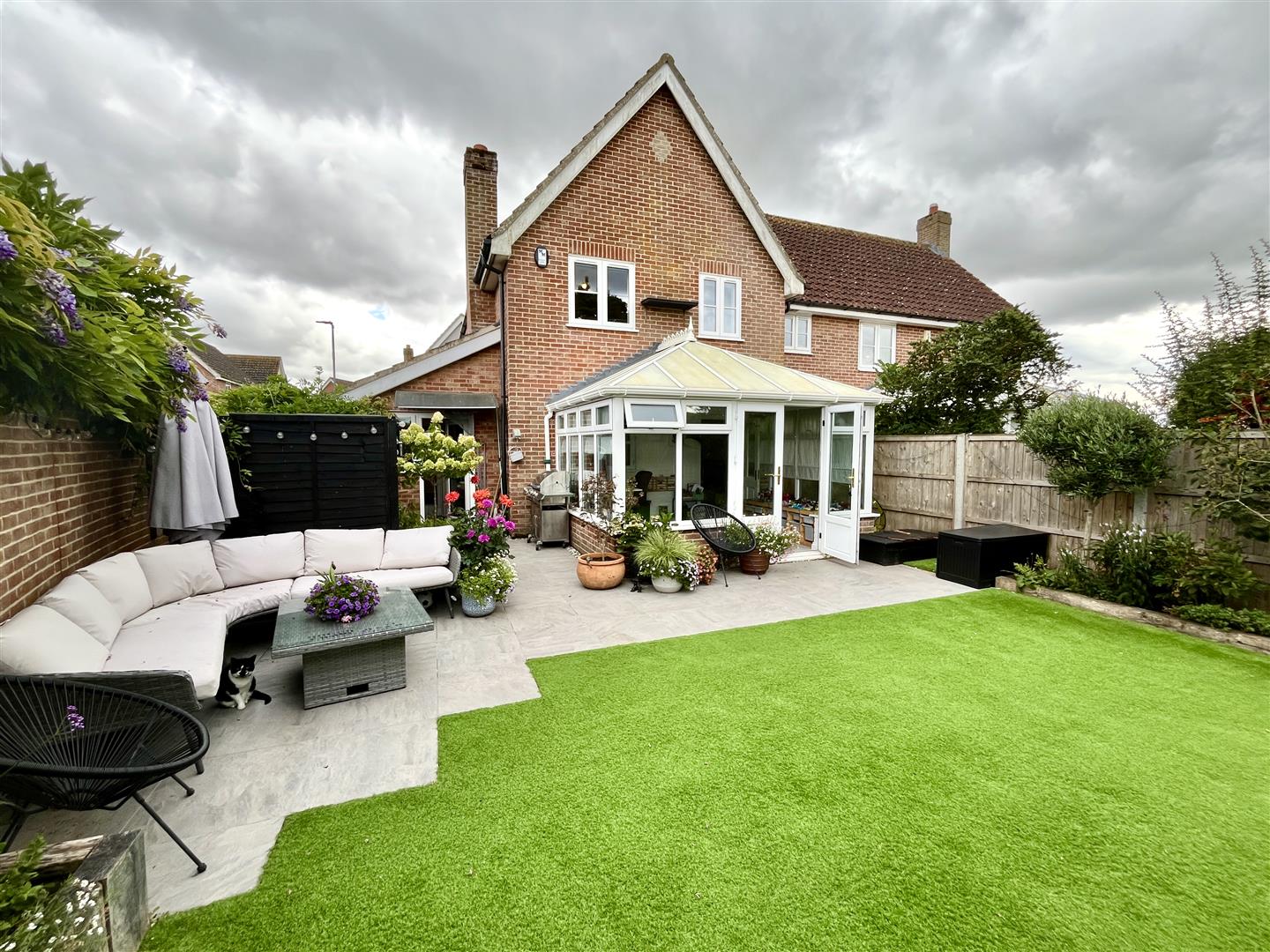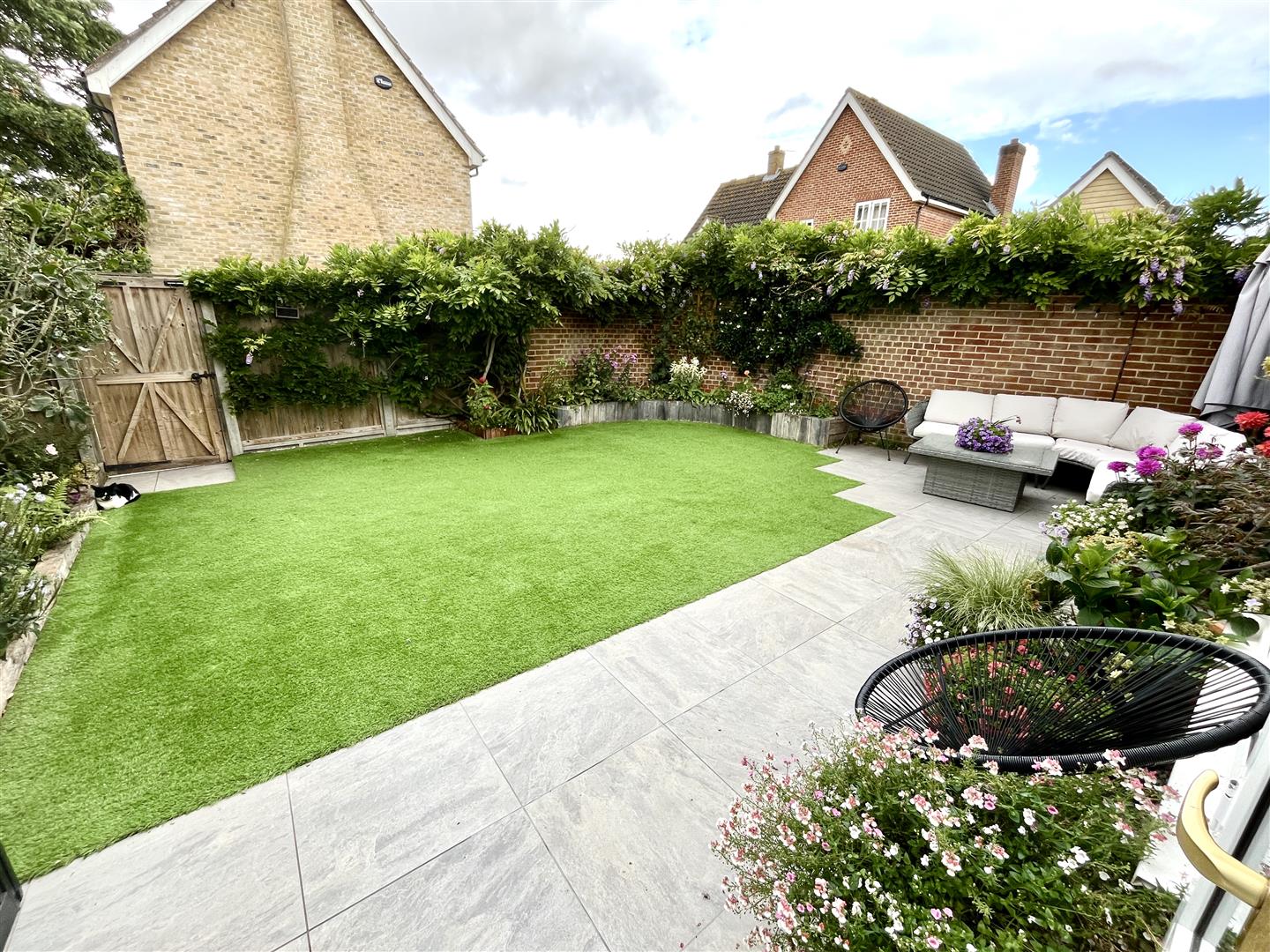 To the front of the property, there is a charming picket fence and a gravel path leading to the front door. The beautifully maintained garden is well stocked with a variety of plants, and features wisteria gracefully climbing the front of the house, adding character and seasonal colour. To the rear, the property boasts a delightful walled garden, complete with raised beds and artificial turf for easy maintenance. A generously sized patio area provides an ideal space for outdoor dining and entertaining.