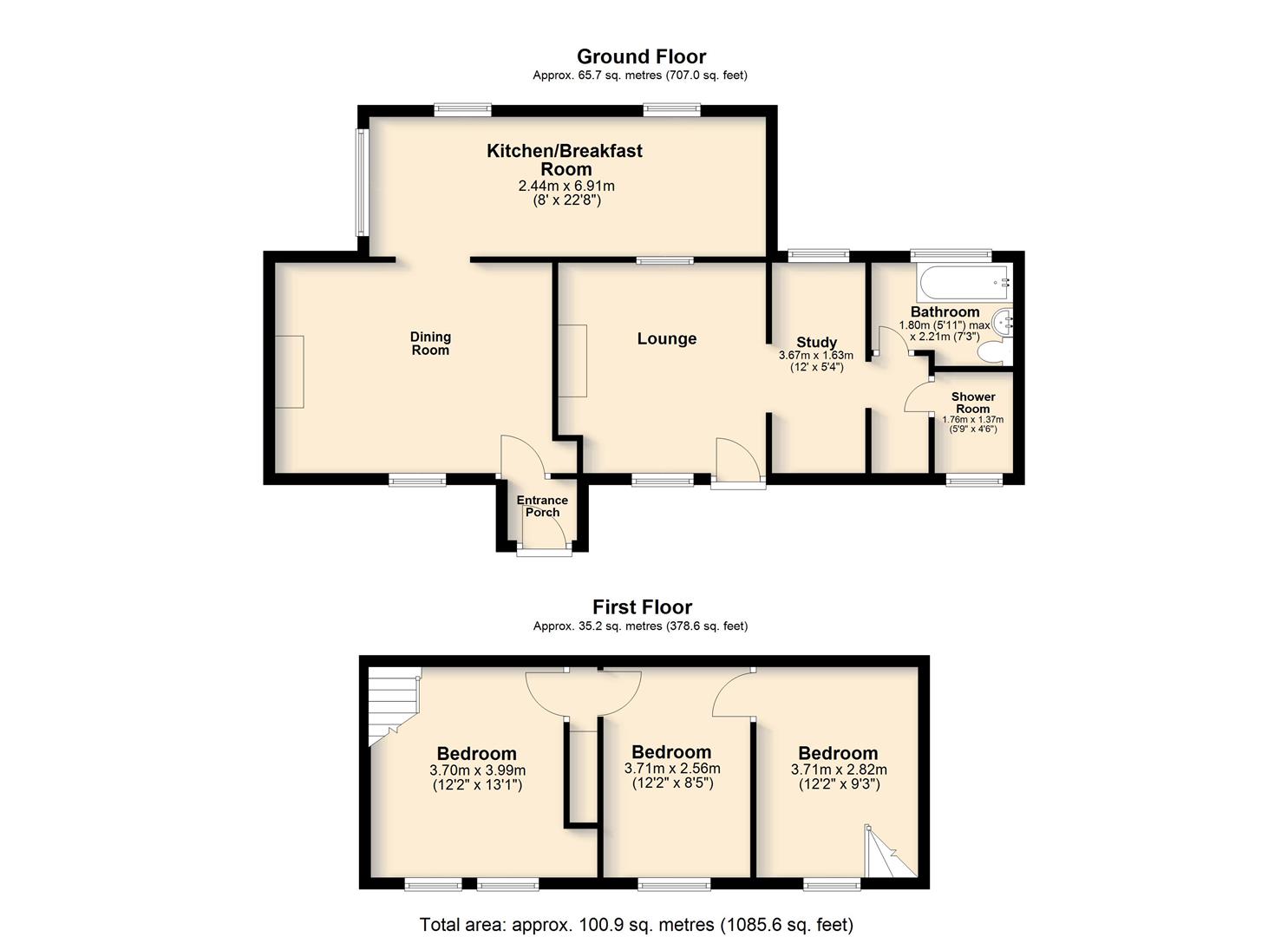 Inside, the accommodation includes an entrance porch leading to a welcoming dining room with a wood burner—perfect for cosy evenings. The spacious lounge also features a wood burner, while a separate study/office offers a quiet retreat for work or reading. The kitchen/breakfast room provides ample space for family meals, complemented by a ground-floor bathroom, separate W.C., and additional shower room.