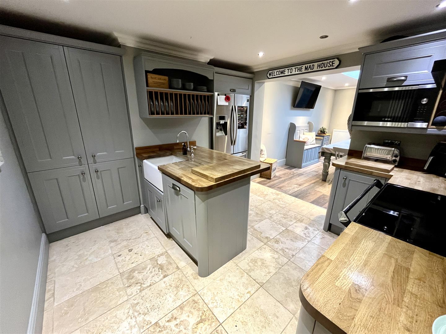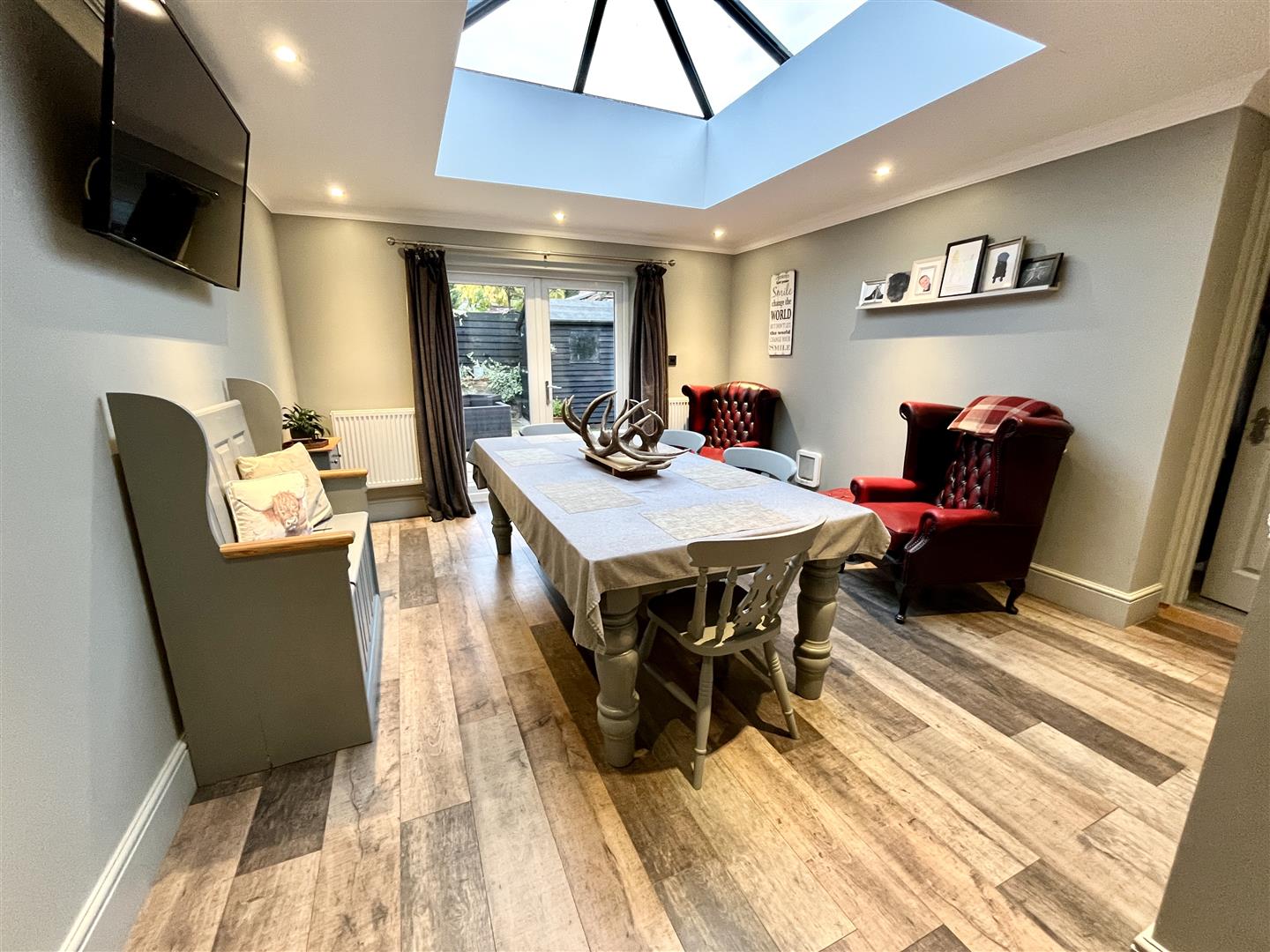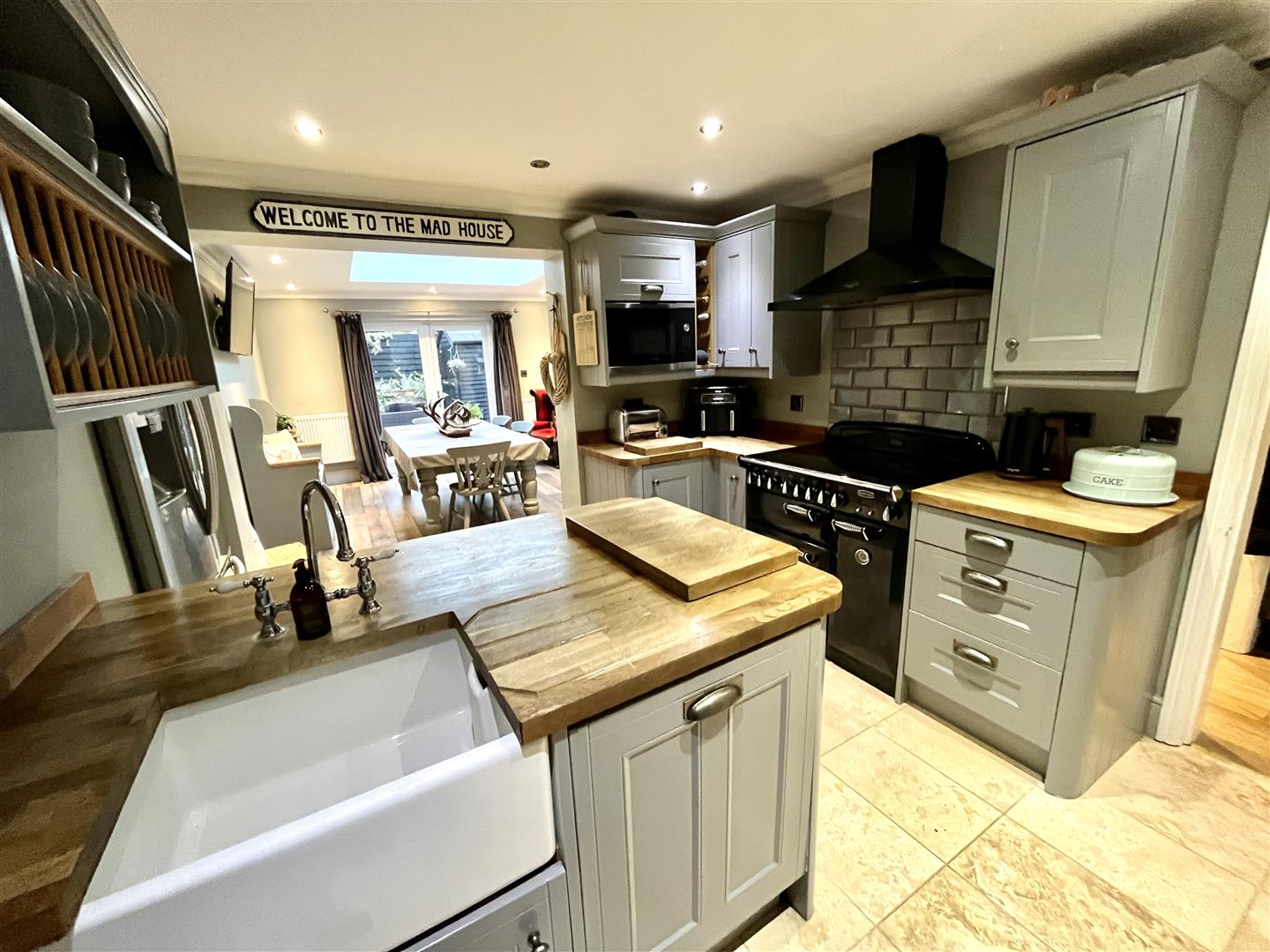 This beautifully presented three-bedroom semi-detached home has been thoughtfully remodeled throughout, offering an excellent blend of modern style and traditional character. The property opens with a welcoming entrance hall leading to a charming lounge complete with wood paneling and a wood-burning stove, creating a warm and inviting atmosphere. A contemporary luxury shower room adds further convenience on the ground floor. To the rear of the property, the impressive open-plan kitchen and dining area provides a superb space for family living and entertaining. The kitchen features a stylish central island with a porcelain butler sink, while the dining area benefits from a window light box and patio doors opening directly onto the rear garden. A separate utility room and a versatile playroom/gym provide additional practicality and flexibility for a growing household. The first floor offers three generously sized bedrooms, including a main bedroom enhanced by an attractive cast-iron fireplace. A beautifully appointed family bathroom completes the accommodation, fitted with a classic roll-top bath that adds a touch of luxury. Externally, the property enjoys an enclosed rear garden, perfect for relaxing or outdoor dining.