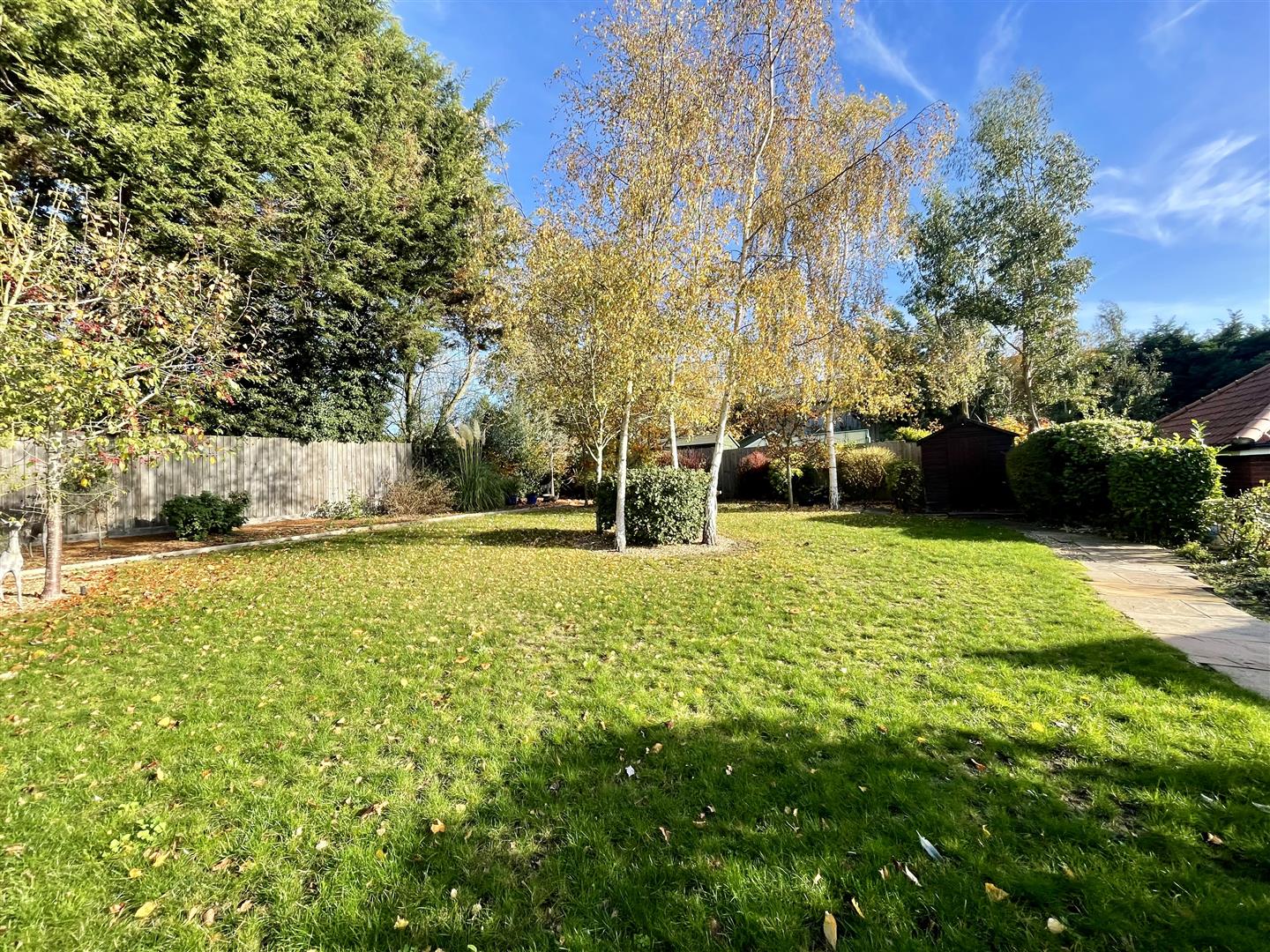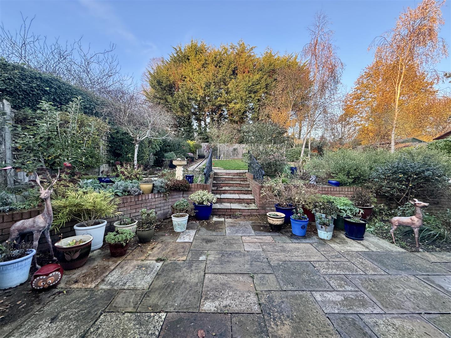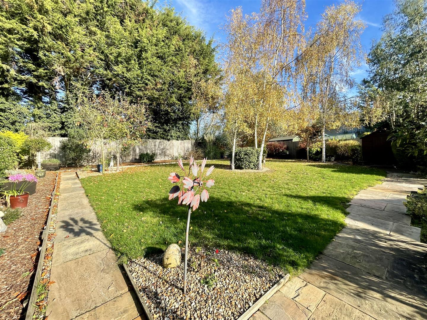 The rear garden is neatly arranged with a generous patio immediately outside the kitchen/diner. A few shallow steps rise to a lawned garden which is incredibly well stocked with a variety of plants with a low maintenance wood-chipped border and silver birch trees set to the centre, offering light shade and interest throughout the year. There is a generous patio with a substantial sunshade awning for the summer months.