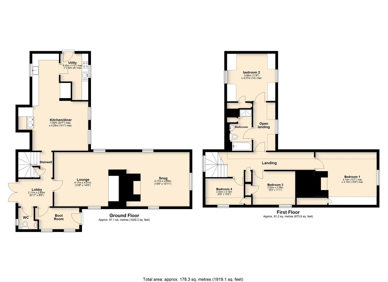Upstairs, a generous landing leads to four bedrooms, all with built-in storage and views across the gardens and neighbouring fields, served by a modern family bathroom.