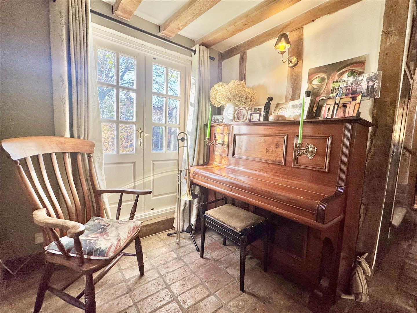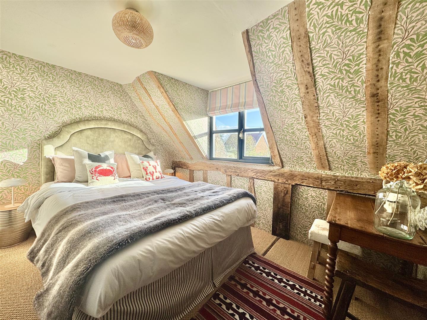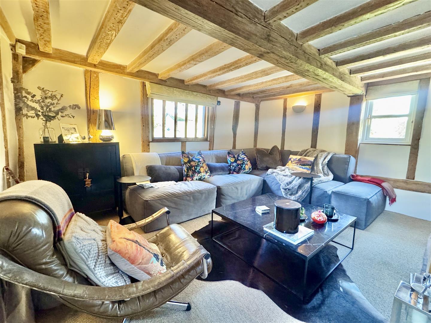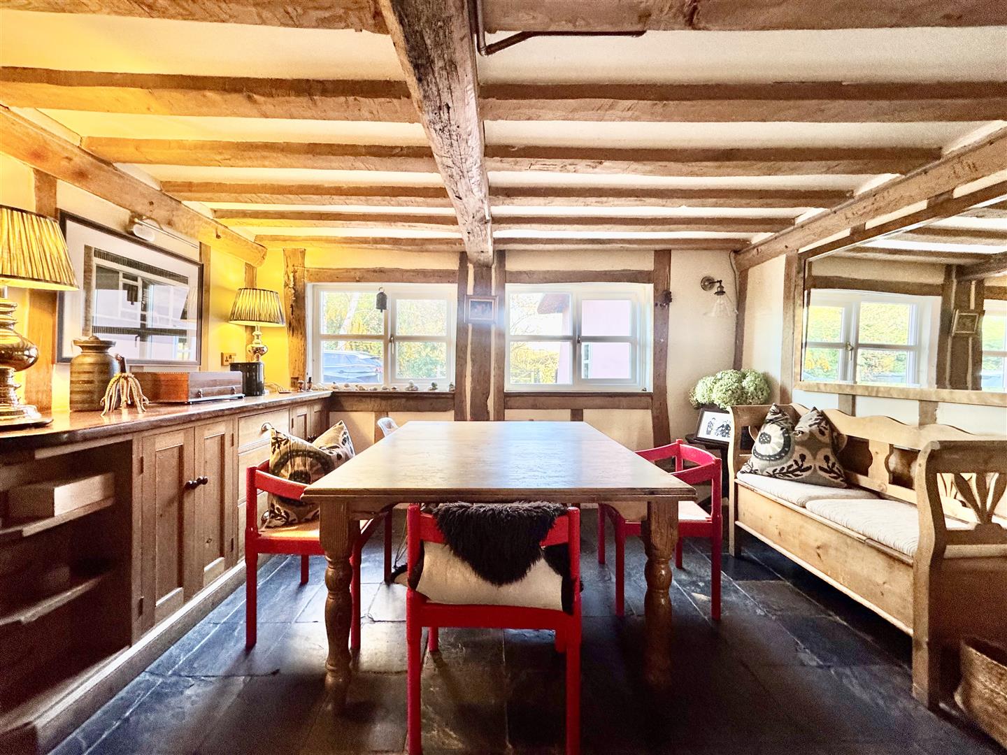 Believed to date back to the early 18th century, Hampton House is a beautifully presented Grade II listed cottage of timber-frame construction beneath a recently renewed thatched roof. The house now offers a stylish blend of period character and modern comfort, with the exposed frame, inglenook fireplace and the gentle proportions typical of a property of this age.