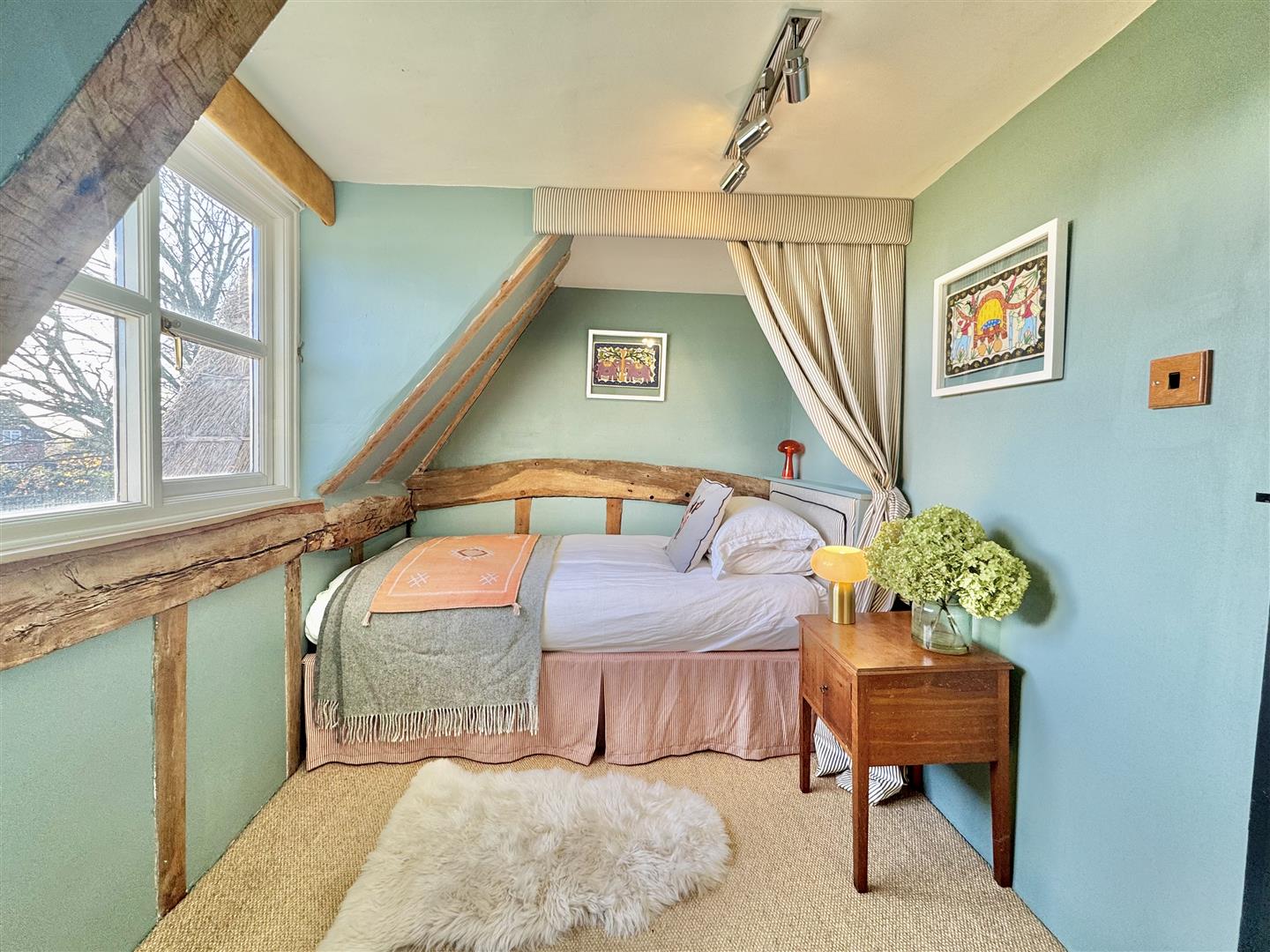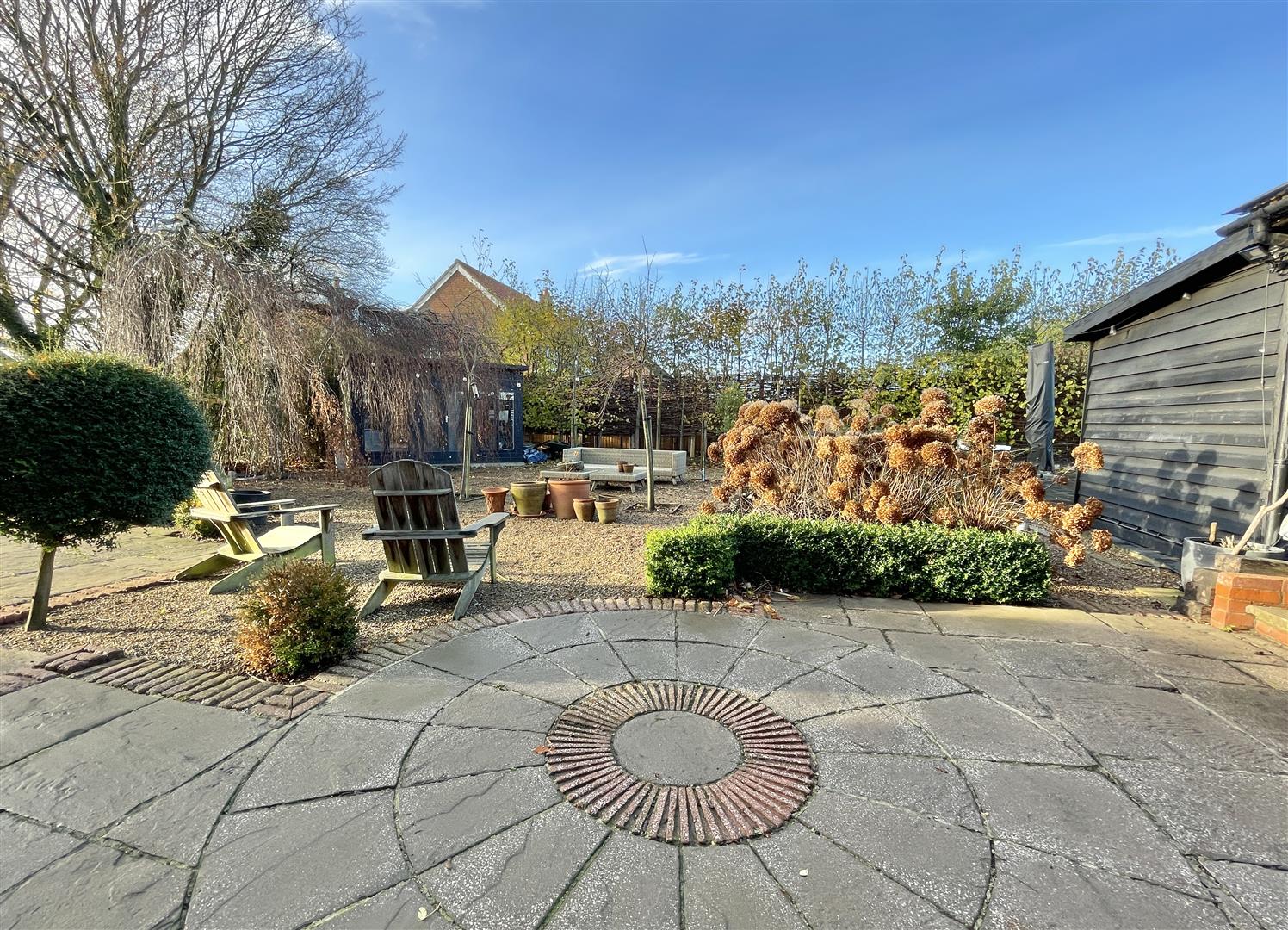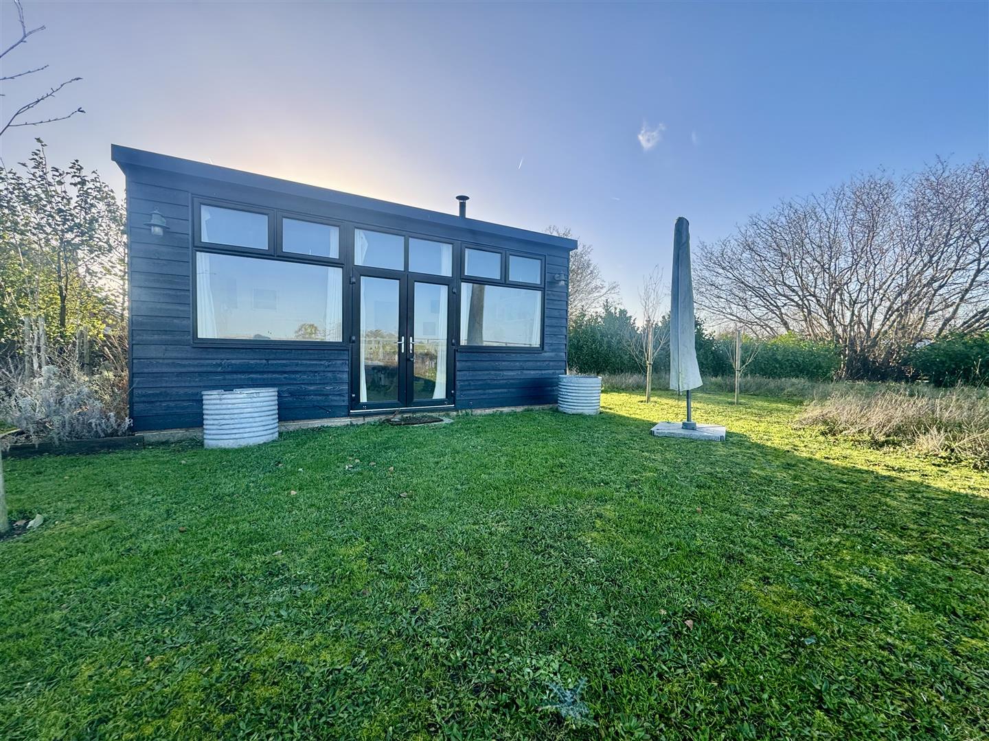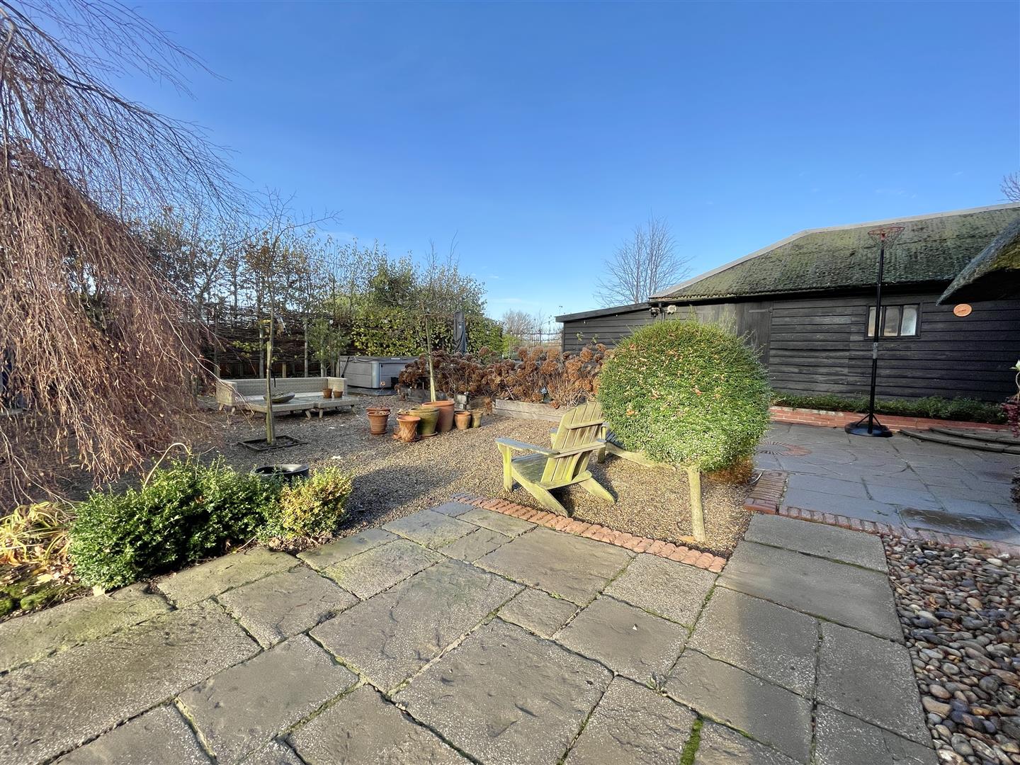 The gardens have been thoughtfully landscaped to create a variety of areas to enjoy throughout the year. A wide terrace provides an excellent spot for outdoor dining, complete with a kitchen garden and hot tub. The lawned garden lies predominantly to the south, interspersed with mature trees and complemented by a self-contained garden office. A well-designed artist’s studio with wood-burner enjoys the best of the light and views, set near post-and-rail fencing that borders open meadow and fields beyond.