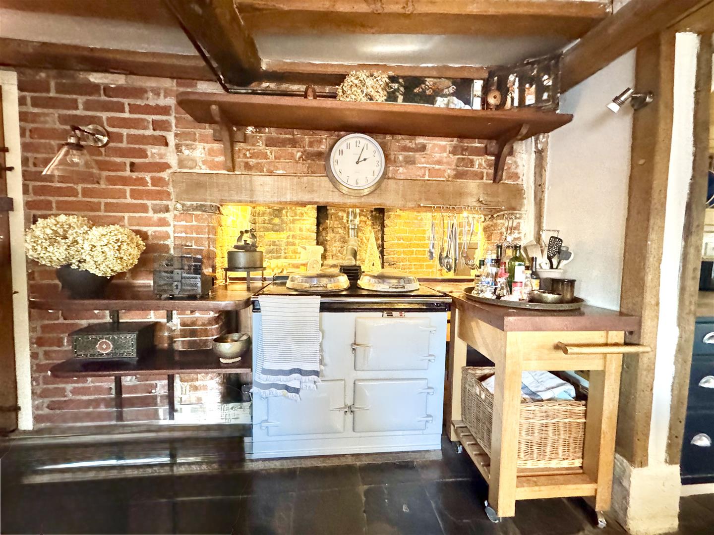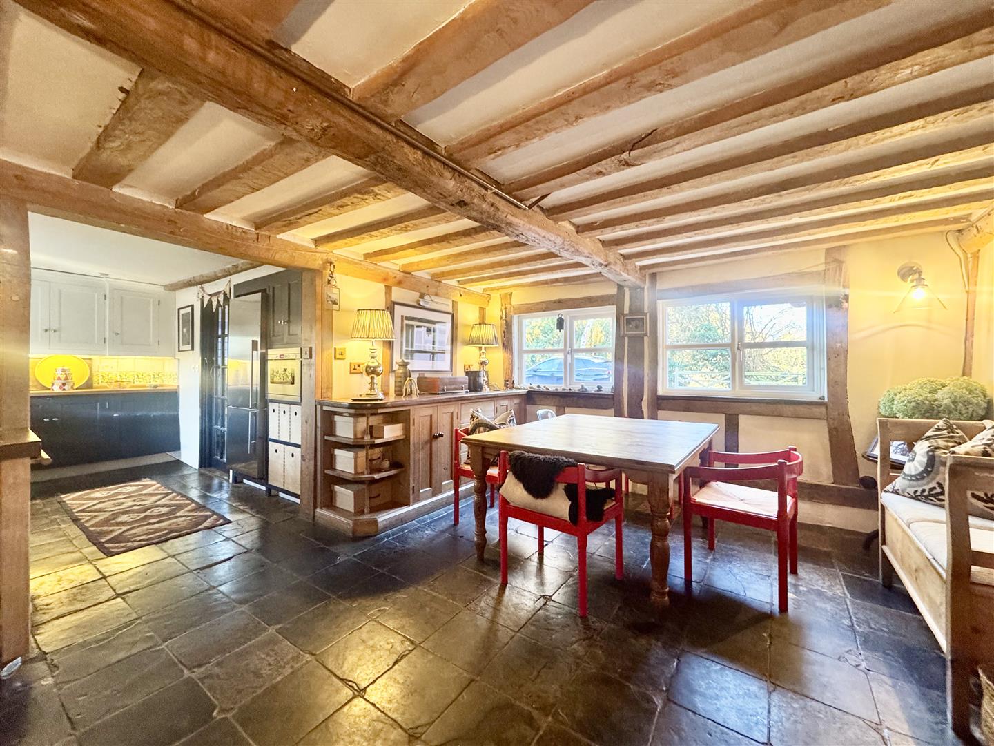Extending to nearly 2,000 sq.ft, the accommodation is arranged to provide a welcoming side entrance hall with cloakroom and boot room, a bright double-aspect sitting room with an impressive inglenook fireplace and wood-burning stove, opening around the chimney to a comfortable triple-aspect snug. The kitchen/breakfast room is fitted with painted shaker-style units, wooden work surfaces and a Belfast sink, with an oil-fired Aga set into the fireplace and space for a dining table. A separate utility room offers additional built-in storage and worktop space with an electric hob.