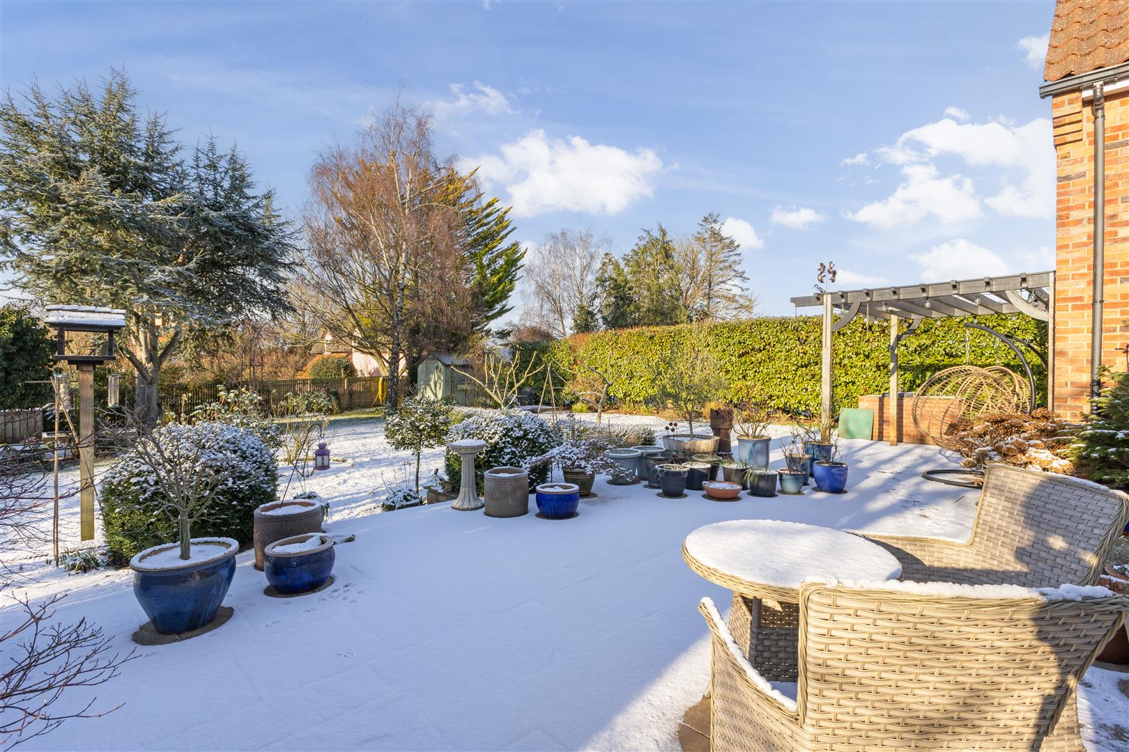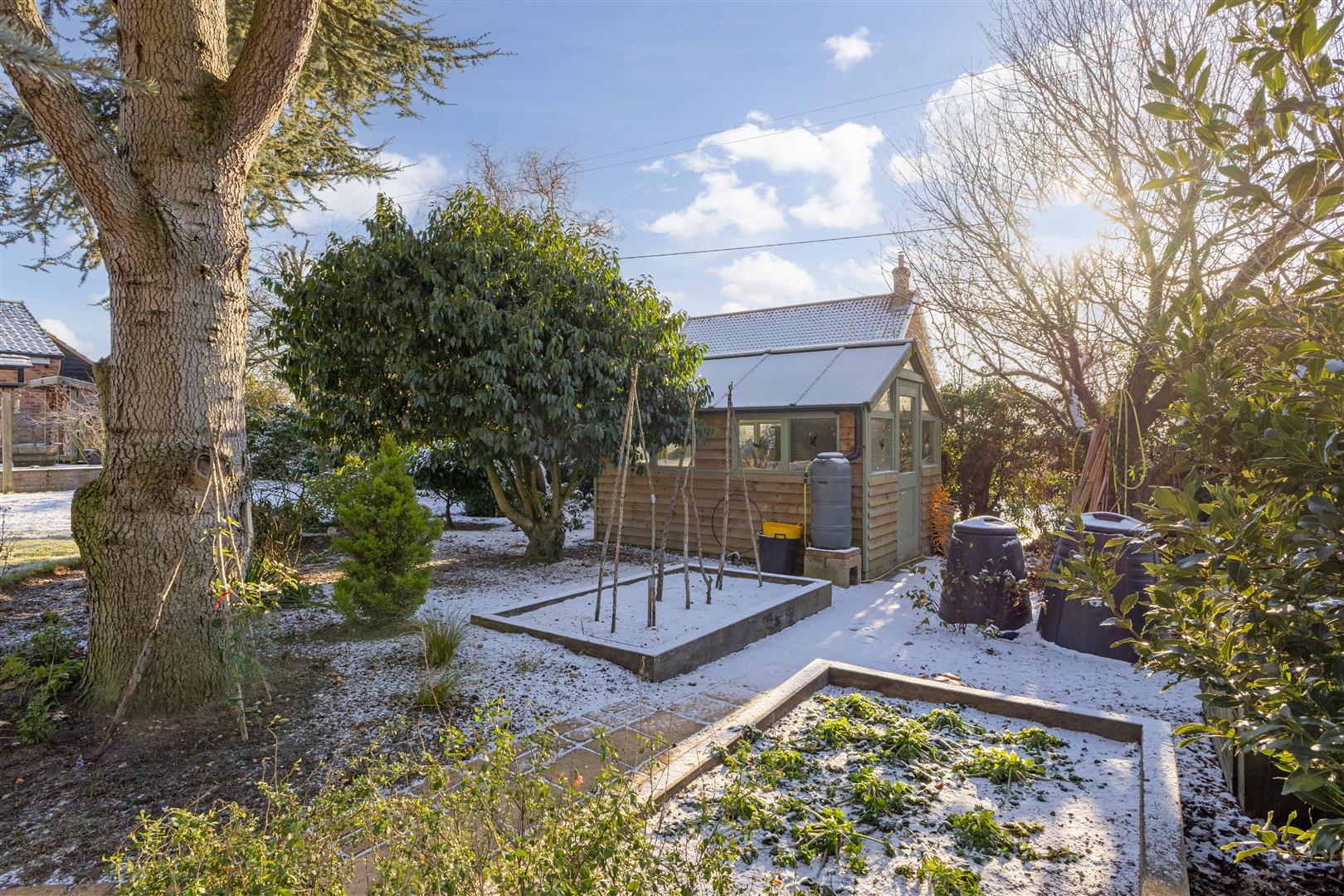 The rear garden has been impressively landscaped and incorporates large herbaceous flower beds, variety of evergreen and deciduous trees, areas of lawn and patio, along with good size, solid greenhouse.