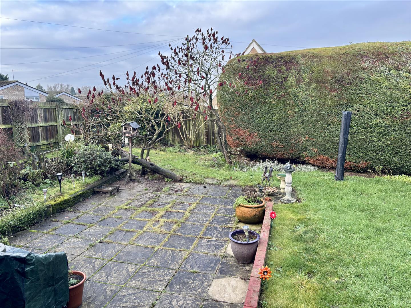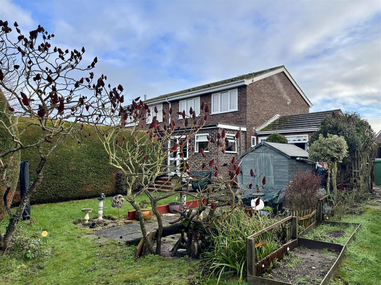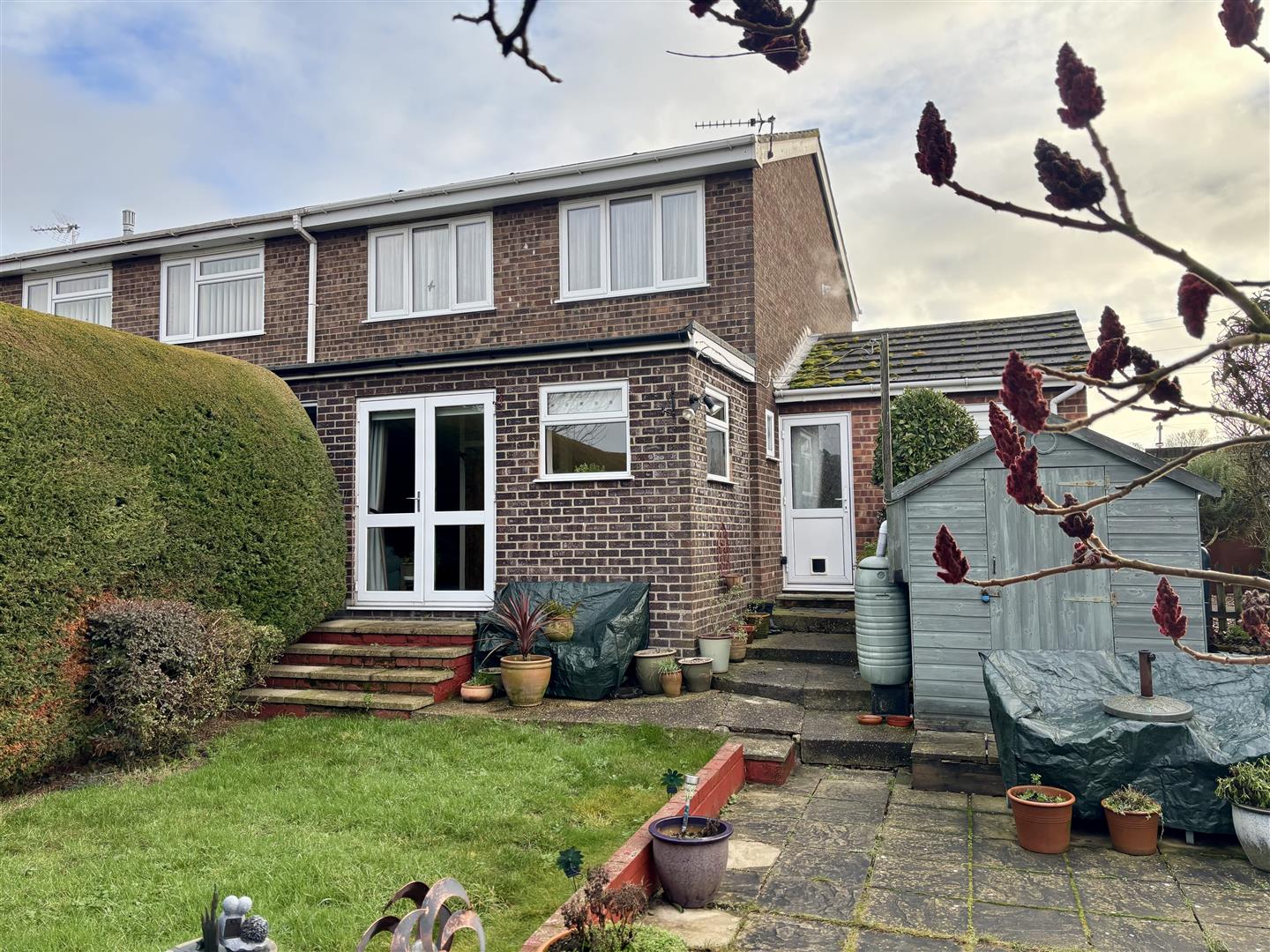 To the front of the property is a single garage along with a driveway providing off-road parking for two vehicles. The rear garden is predominantly laid to lawn and enjoys a good degree of privacy, complemented by a useful garden shed and a variety of mature trees and established shrubs, offering an attractive and low-maintenance outdoor space.