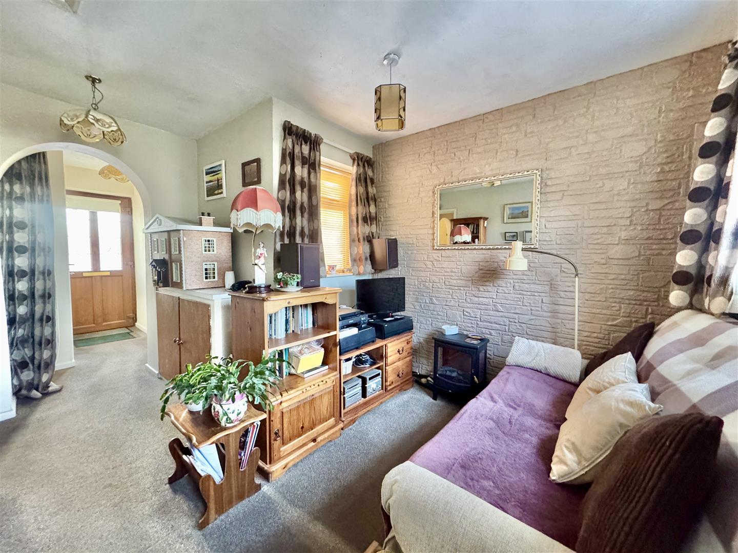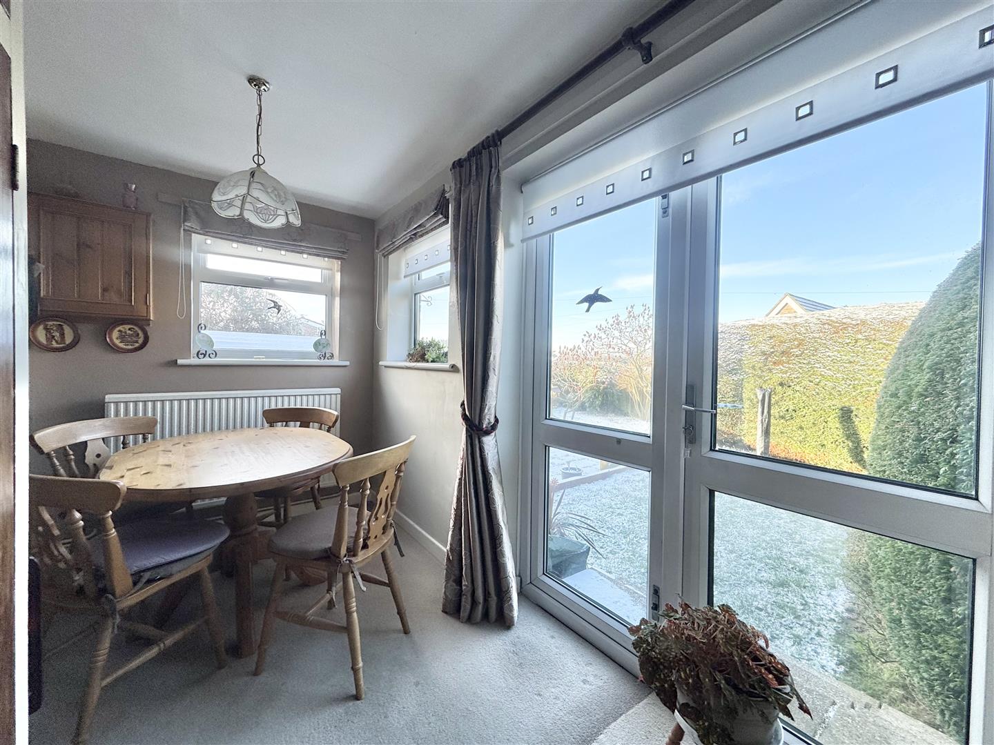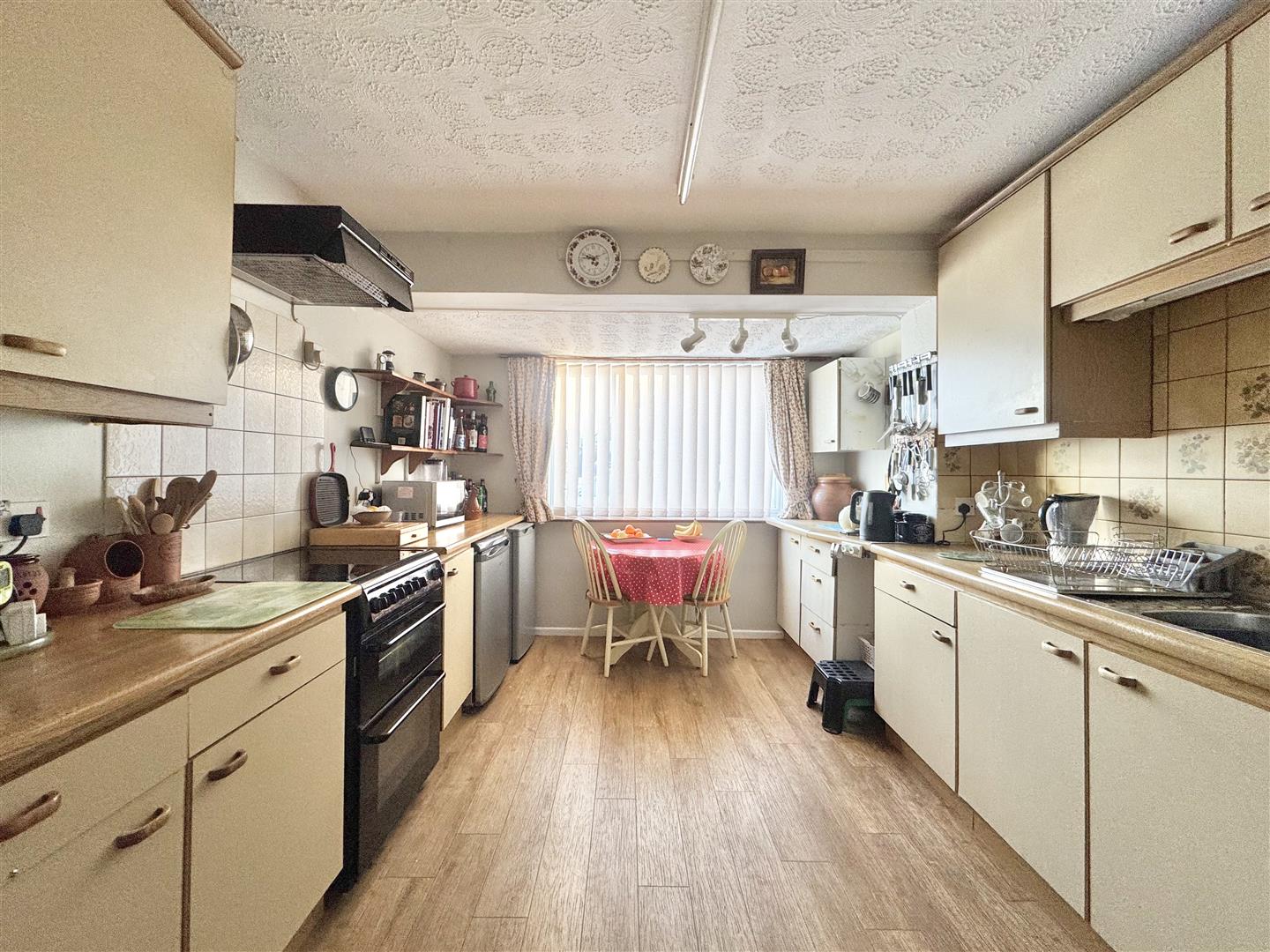 Occupying an elevated corner position within a pleasant village cul-de-sac, this extended three-bedroom home was originally constructed in the 1970s and subsequently enlarged to provide well-balanced and versatile accommodation. The property is approached via an entrance hall with stairs rising to the first floor and a useful ground floor cloakroom fitted with a modern white low-level WC and hand basin. The kitchen is generously proportioned and offers an extensive range of low-level cupboard units, ample worktop space and room for a freestanding oven, making it a practical and functional family space. To the rear of the house is a snug or home office, benefiting from an external door opening directly onto the garden, ideal for those seeking a dedicated workspace or secondary reception room. The main living room is well-sized and features an electric fireplace, opening through to a defined dining area with French doors that lead out to steps descending into the rear garden, creating a natural flow for everyday living and entertaining.
