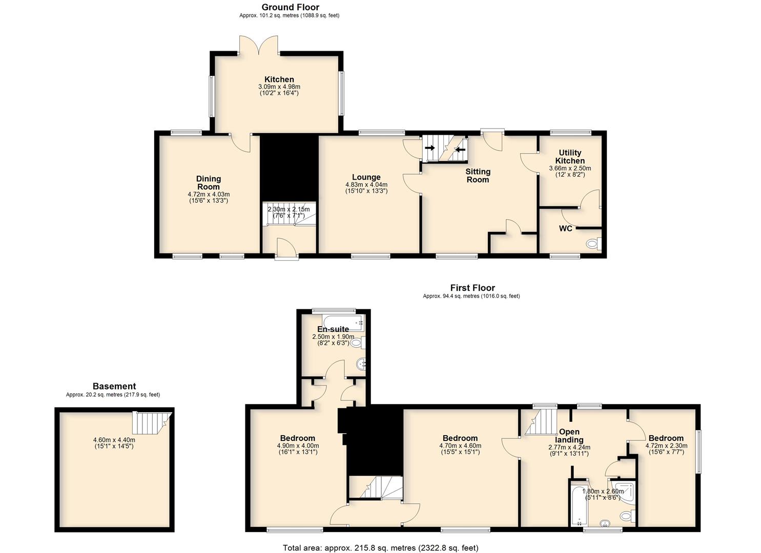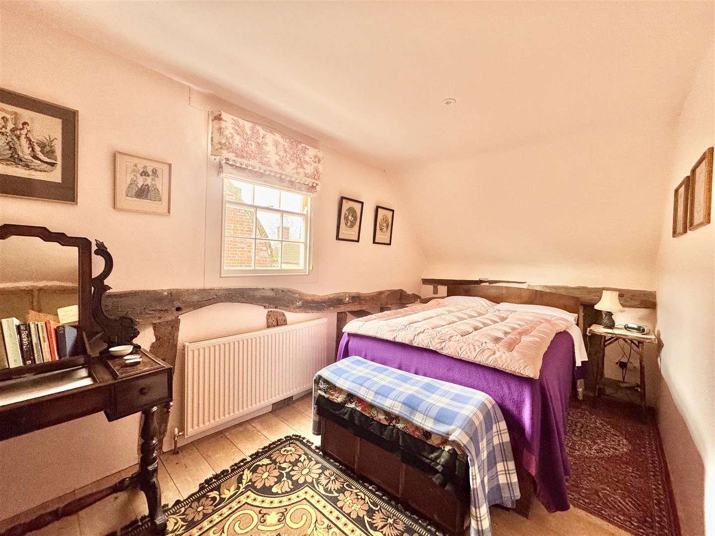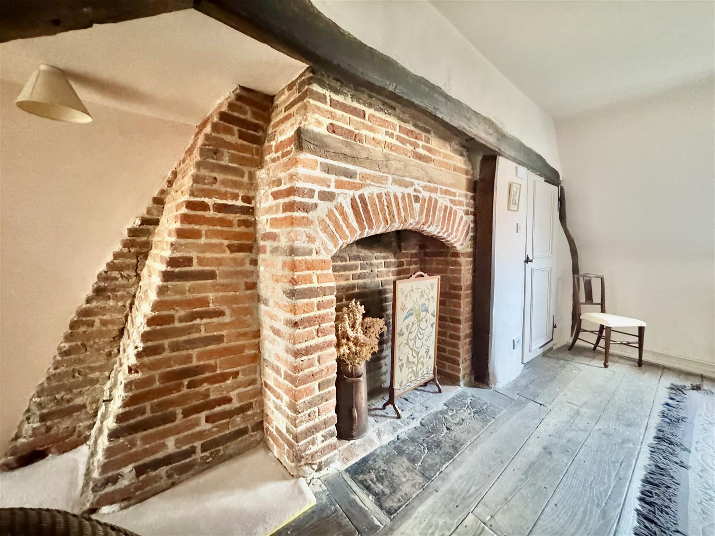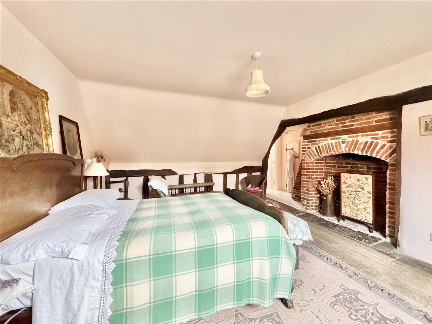 Two separate staircases, a reminder of the period when the property was divided into two dwellings, rise to the first floor. Here, the accommodation comprises three bedrooms and a family bathroom fitted with a shower, bath, low-level WC and hand basin. These rooms are arranged around a large open-plan landing, which displays exposed timber framing and remnants of historic mullion windows. The principal bedroom is of particular note, featuring a large fireplace and the benefit of an en-suite bathroom.