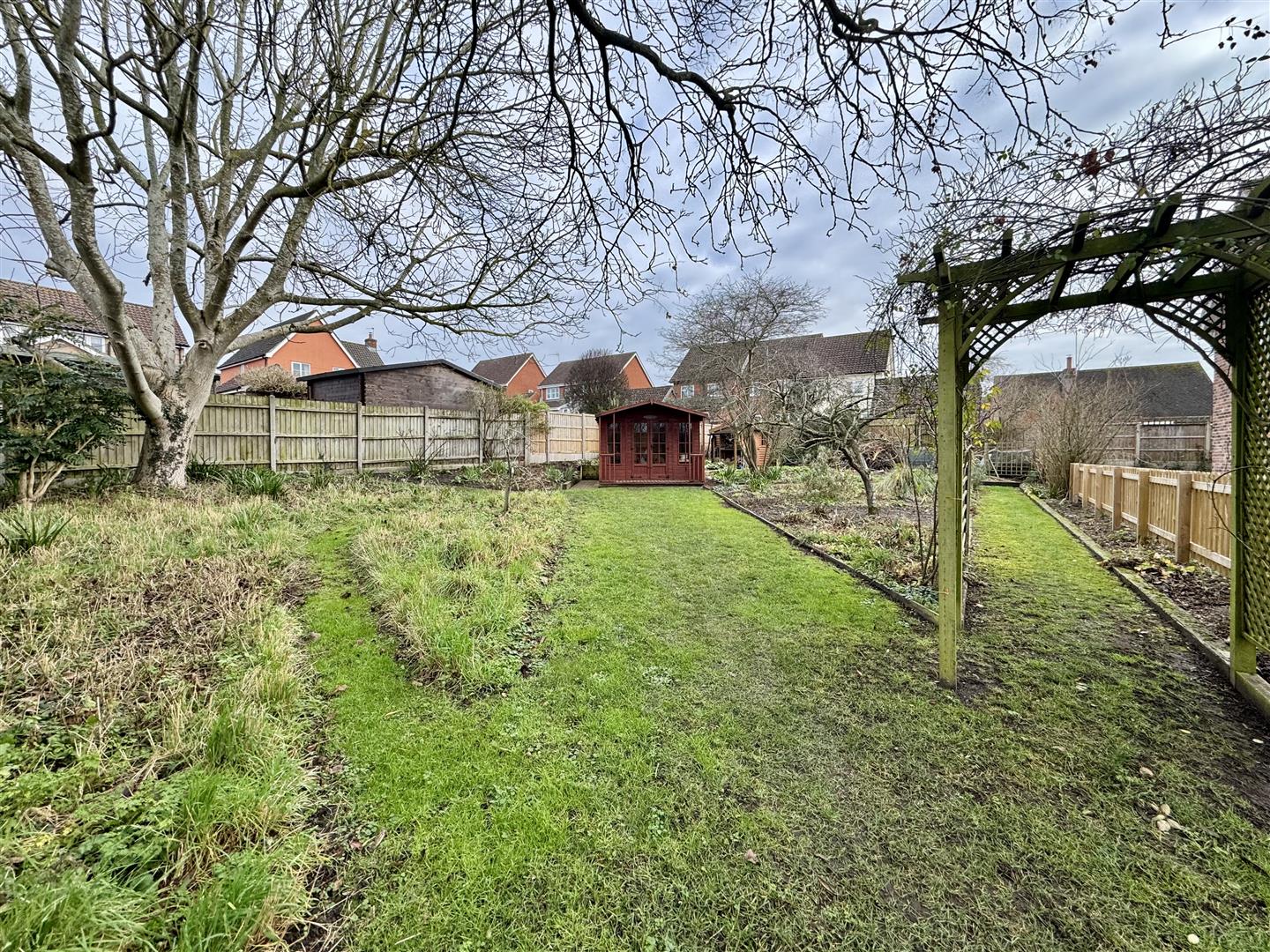 To the rear, the garden incorporates a range of useful outbuildings, including sheds and a summer house, together with raised vegetable beds, appealing to those seeking a practical and lifestyle-focused outdoor space. Overall, the gardens form a charming and functional extension of the house, well suited to both relaxation and family life.