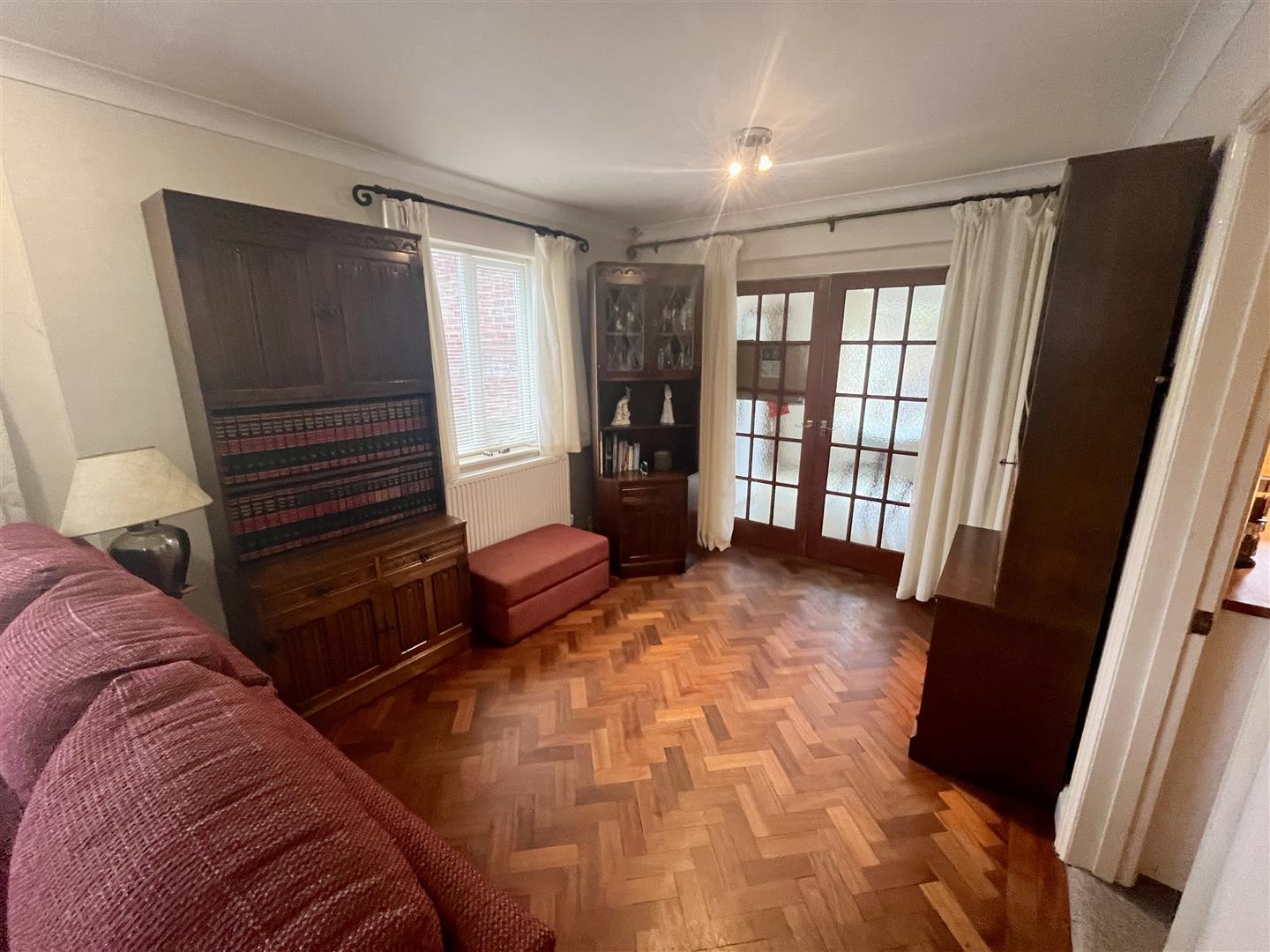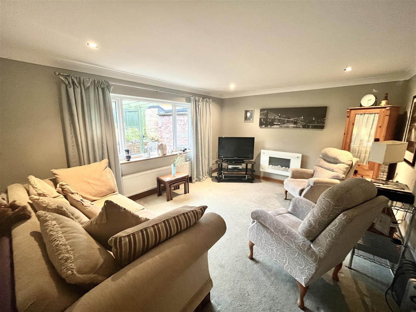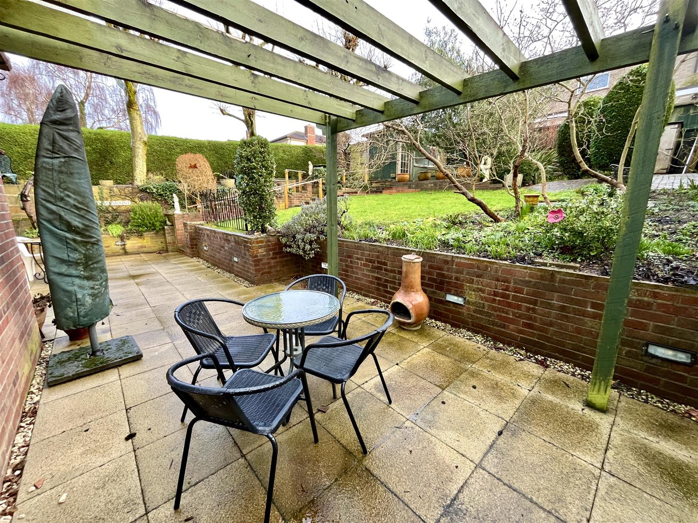 The property occupies an attractive corner plot and benefits from ample off-road parking to the front, accommodating several vehicles with ease. To the rear, a generously proportioned garden provides an excellent outdoor space, featuring a sunken patio area ideal for alfresco dining and entertaining. Steps rise to a well-maintained lawn bordered by mature shrubs, with several sheds offering useful additional storage.
