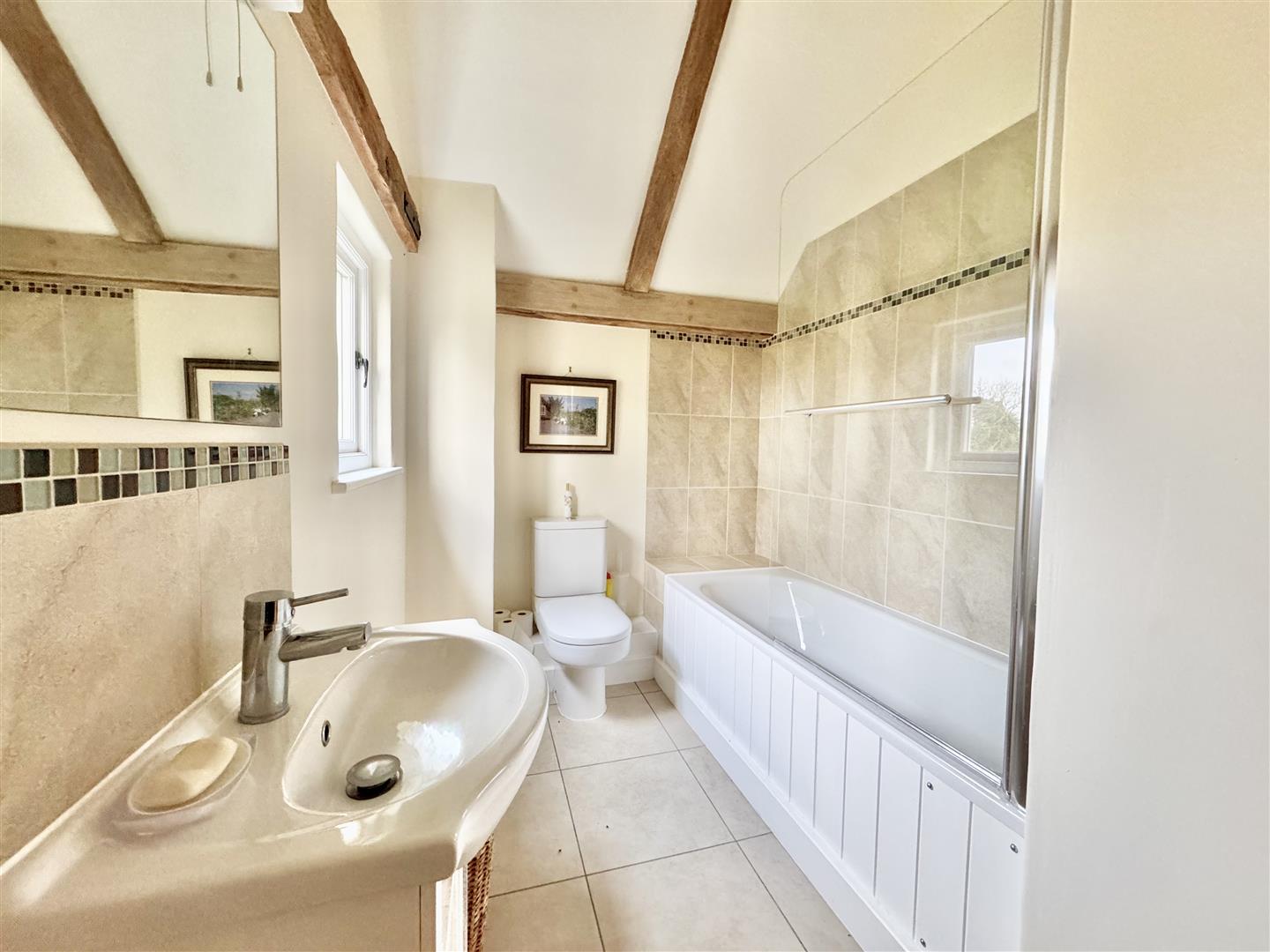 Upstairs, the accommodation comprises three bedrooms, one of which benefits from an en-suite shower room. The family bathroom is fitted with a modern suite in neutral tones, including a bath with shower over, low-level WC and wash basin.