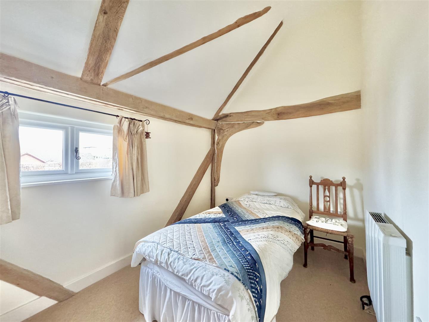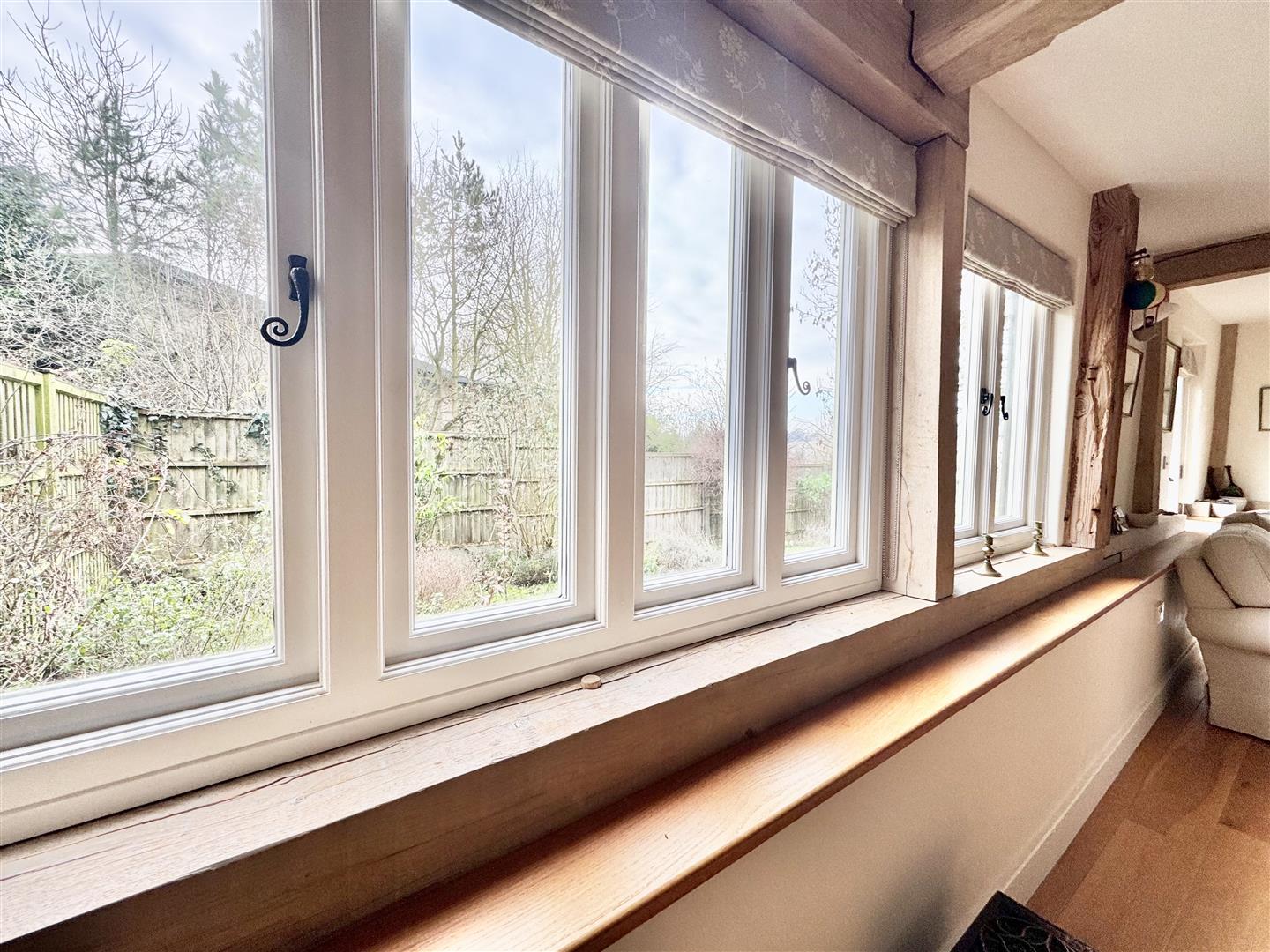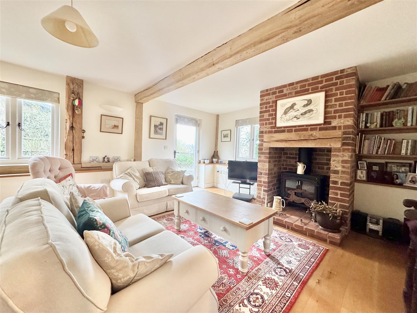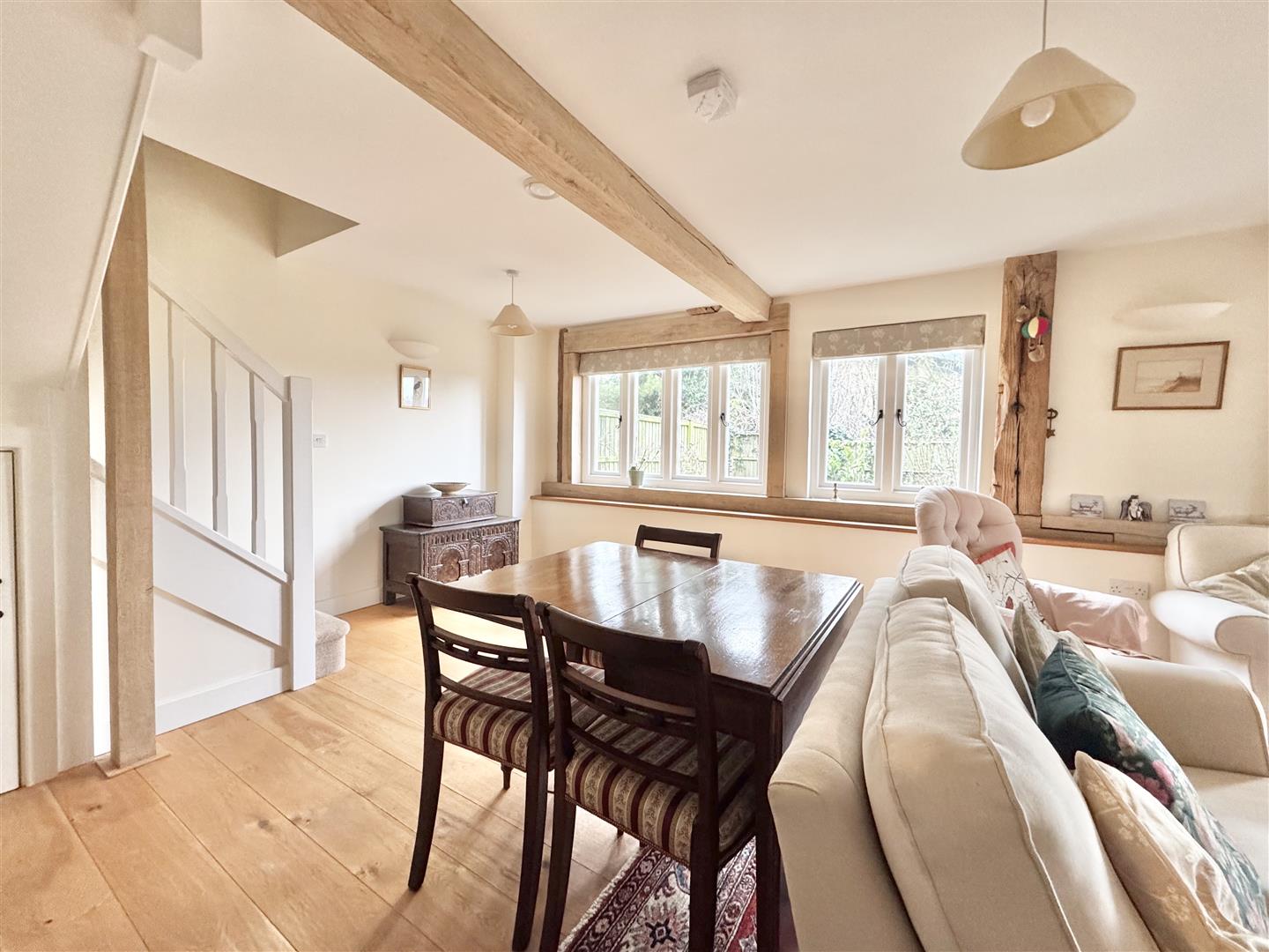 The barn was converted around 2012 and is immaculately presented throughout, retaining attractive exposed beams while benefitting from a bright and airy feel, enhanced by a wealth of windows. A welcoming entrance hall features a full-height window to the front elevation, providing excellent natural light. The kitchen is modern and well-appointed, fitted with shaker-style units in a light grey tone. A downstairs WC houses the boiler and offers sufficient space for both a washing machine and tumble dryer. The main living space is a generous open-plan sitting and dining area, centred around an inglenook fireplace with wood burner. There is ample room for a dining table and chairs, windows overlooking the rear garden, and a useful rear door providing direct garden access. Stairs rise to the first floor.