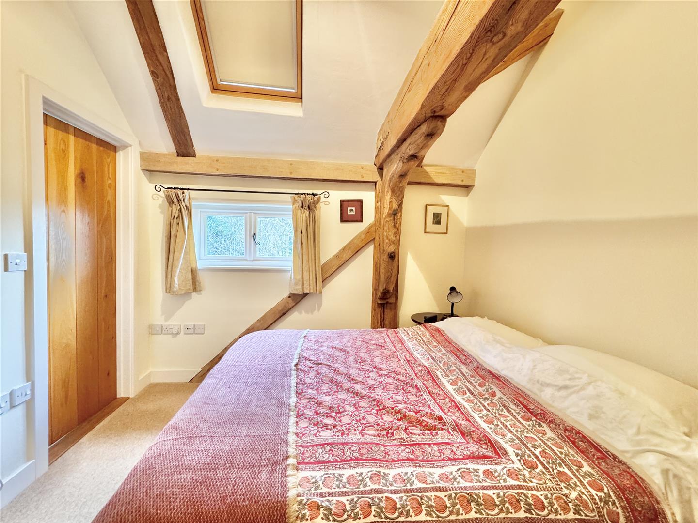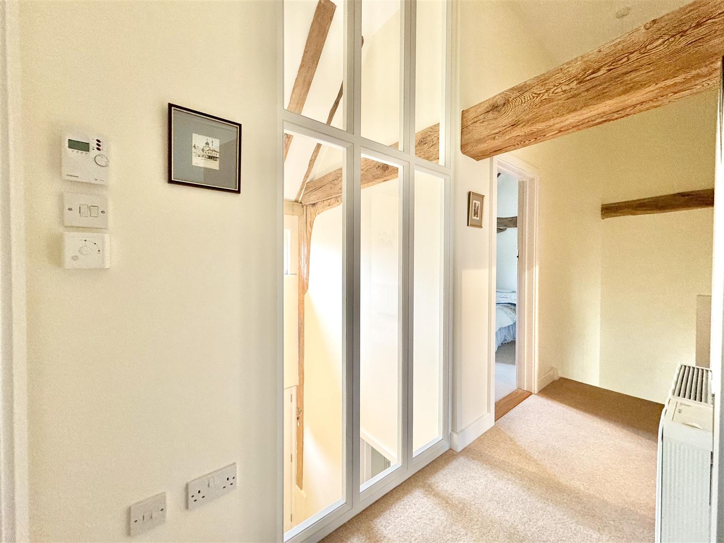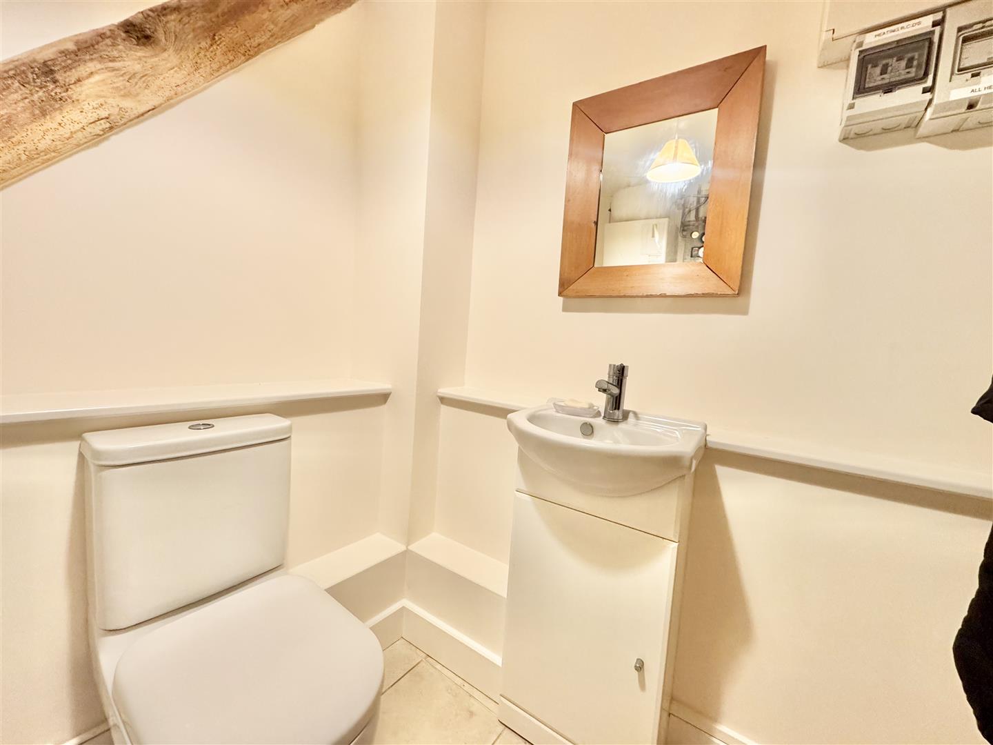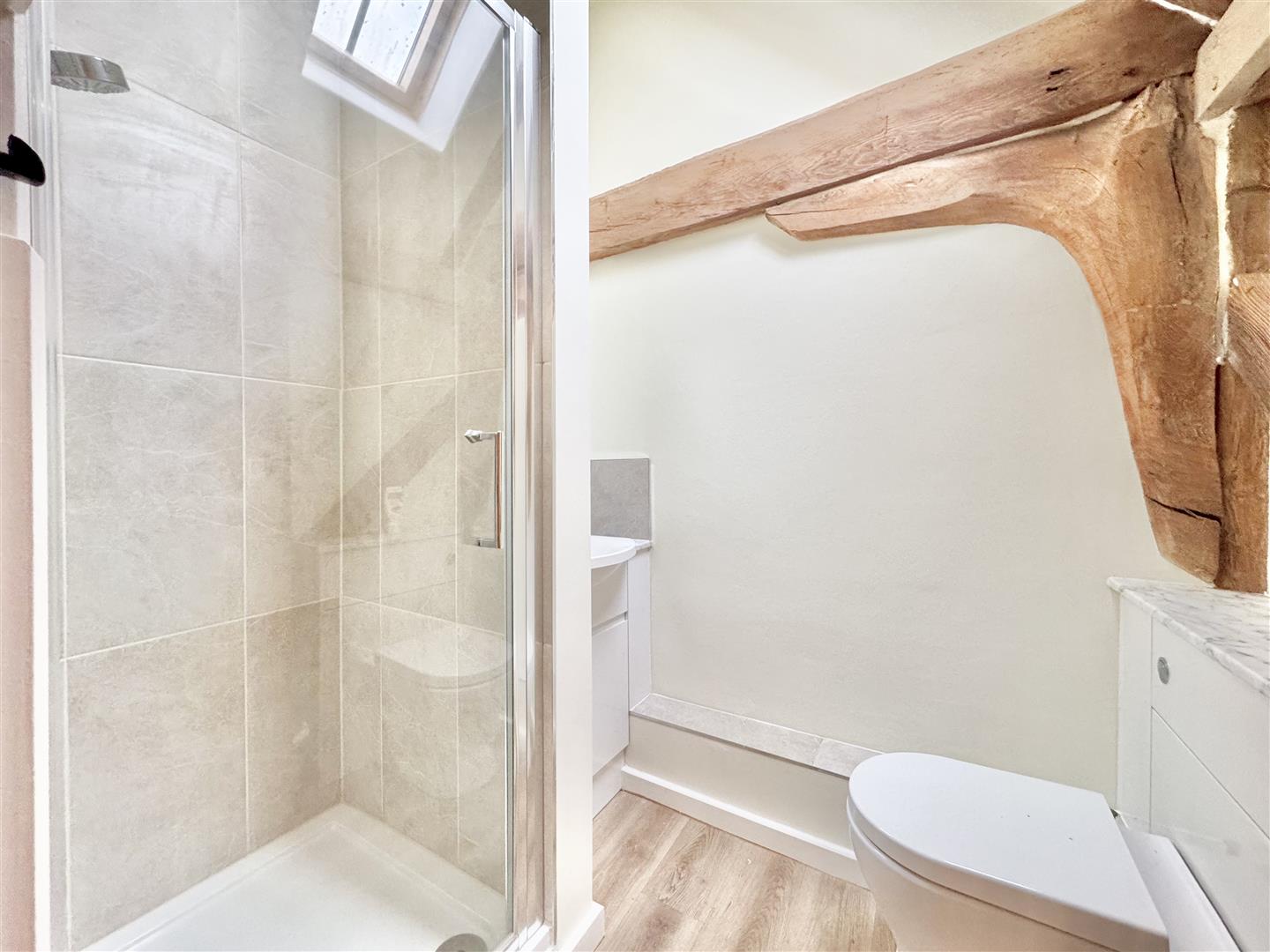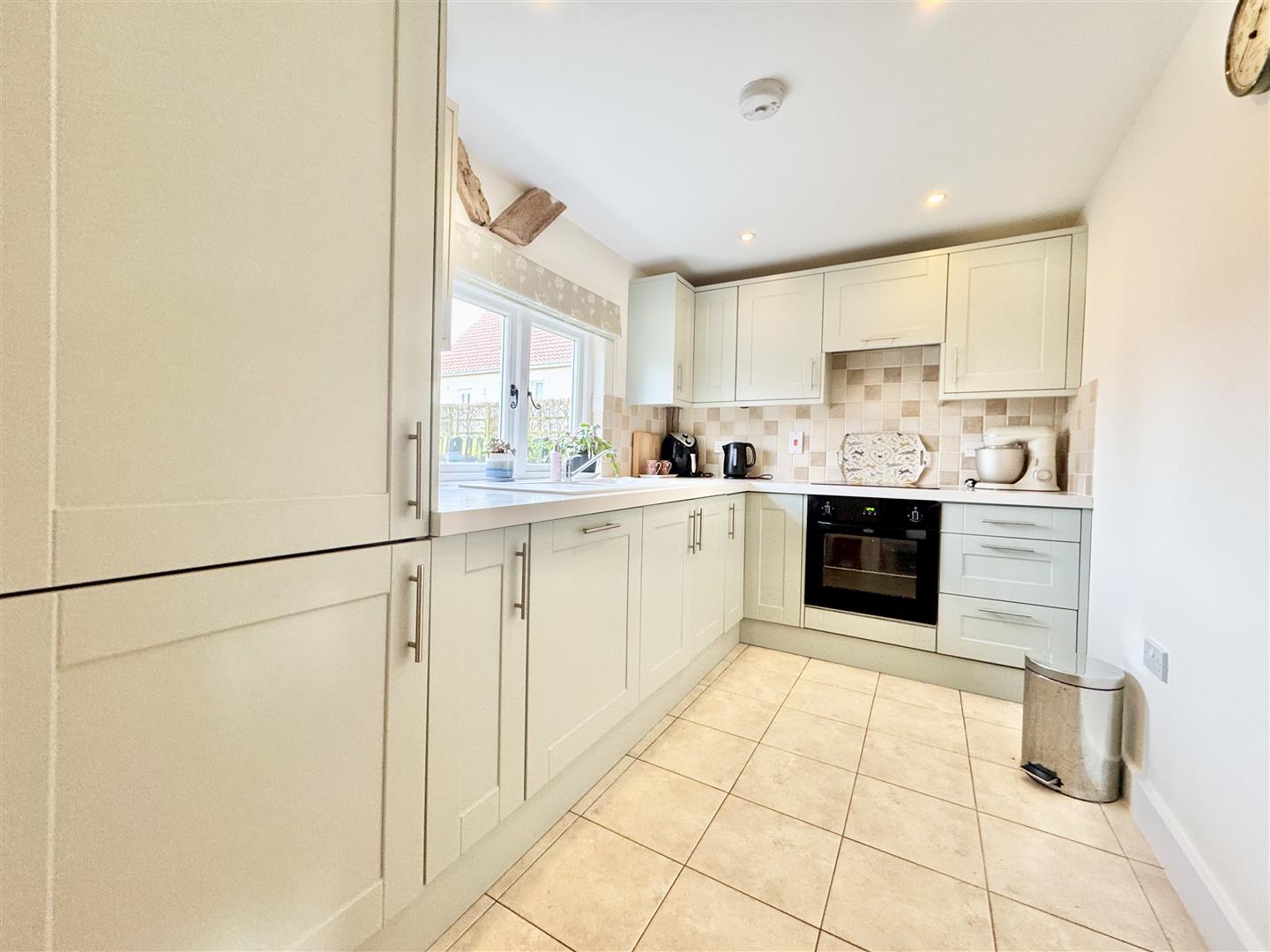 The barn was converted around 2012 and is immaculately presented throughout, retaining attractive exposed beams while benefitting from a bright and airy feel, enhanced by a wealth of windows. A welcoming entrance hall features a full-height window to the front elevation, providing excellent natural light. The kitchen is modern and well-appointed, fitted with shaker-style units in a light grey tone. A downstairs WC houses the boiler and offers sufficient space for both a washing machine and tumble dryer. The main living space is a generous open-plan sitting and dining area, centred around an inglenook fireplace with wood burner. There is ample room for a dining table and chairs, windows overlooking the rear garden, and a useful rear door providing direct garden access. Stairs rise to the first floor.