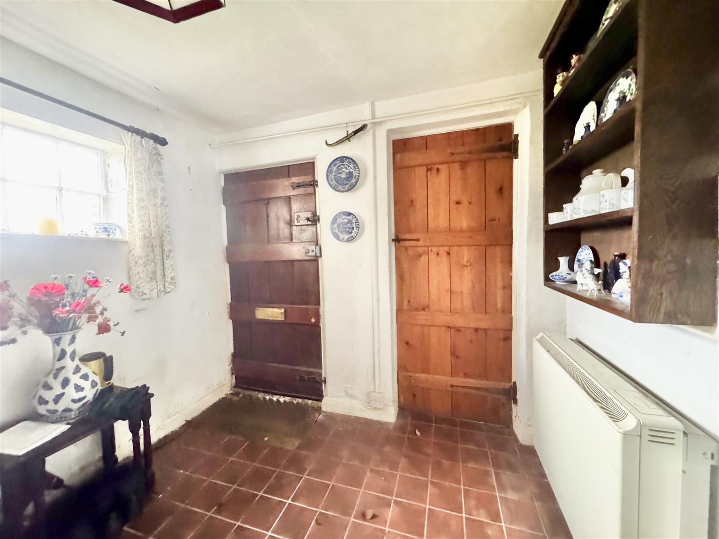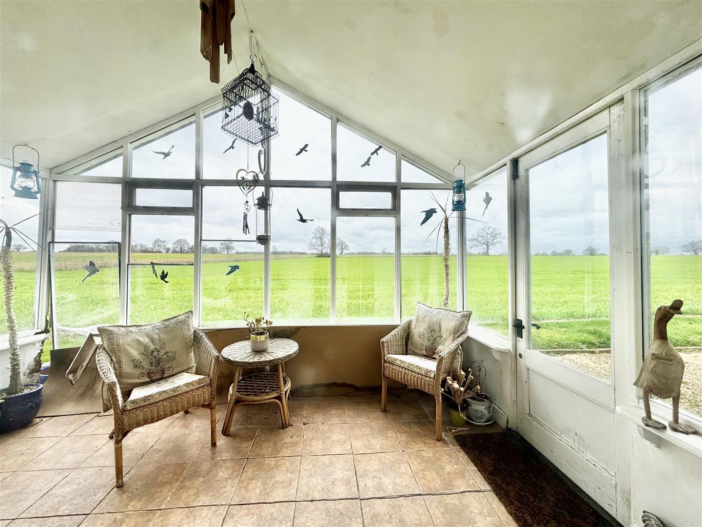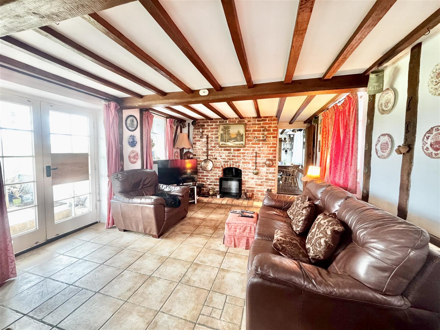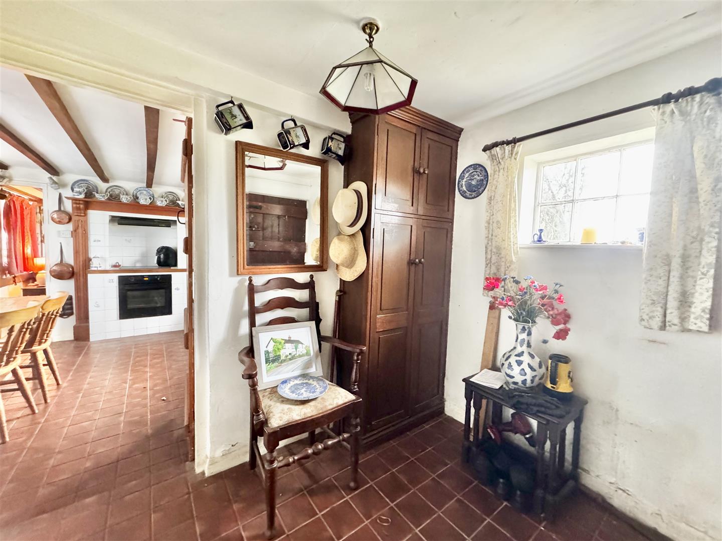 A front door from the parking area opens into an entrance hall which immediately highlights both the period character and surprisingly generous proportions of the cottage. Traditional latch and brace doors lead to the principal ground floor rooms. The shower room forms part of a later addition and is fitted with a shower enclosure, WC and wash basin set within a vanity unit. Whilst perfectly serviceable, the property would now benefit from a programme of general updating and improvement throughout. The kitchen dining room sits at the centre of the house and is a naturally light space with windows to both front and rear elevations enjoying rural views. Exposed timbers remain in place, and the kitchen is arranged around the walls with the oven and hob positioned within the former fireplace recess. There is space for a dining table, and a walk-in pantry provides useful additional storage. The room offers clear scope for modernisation to suit a purchaser’s own taste and requirements. From the kitchen, stairs rise to the first floor, and a doorway leads through to the sitting room. This is a notably spacious reception room with windows to two elevations allowing for excellent natural light and views over the surrounding countryside. Ceiling timbers remain exposed, and an open fireplace provides a focal point. French doors open into the lean-to garden room, which overlooks the rear garden and offers further potential for improvement. On the first floor, the stairs lead into a substantial landing area currently used by the present owners as a guest bedroom and study space. Windows to both front and rear elevations provide elevated views. Bedroom three is a generous single room incorporating the airing cupboard, whilst the principal bedroom is a well-proportioned double enjoying a dual aspect. From here, access is gained to bedroom four, another single room. The first floor layout is somewhat unconventional but offers flexibility and clear opportunity for reconfiguration, subject to any necessary consents. Overall, White Post Cottage presents an attractive period home requiring updating, offering buyers the opportunity to enhance and adapt the accommodation to modern expectations.