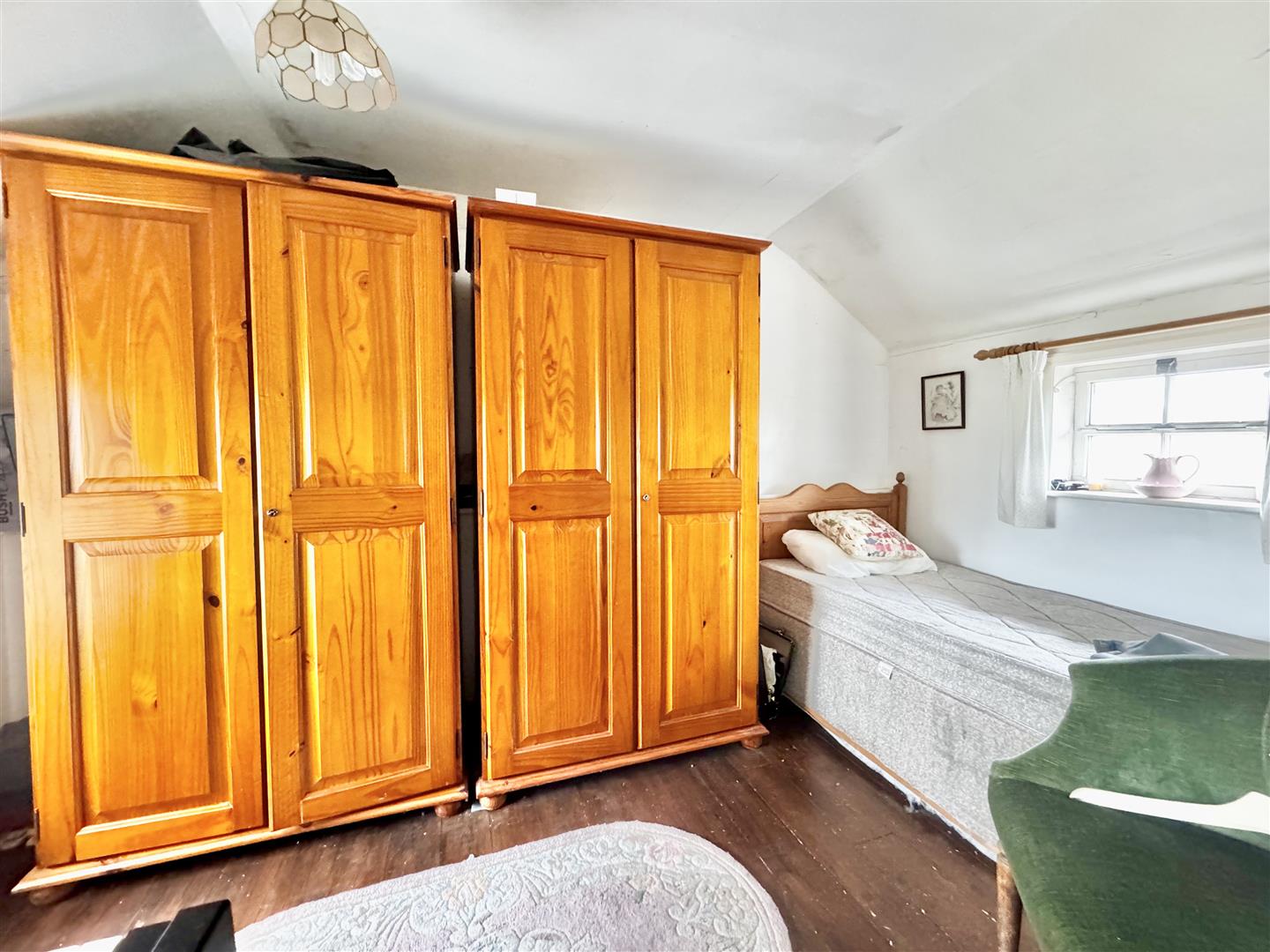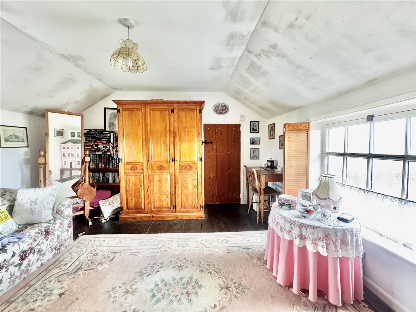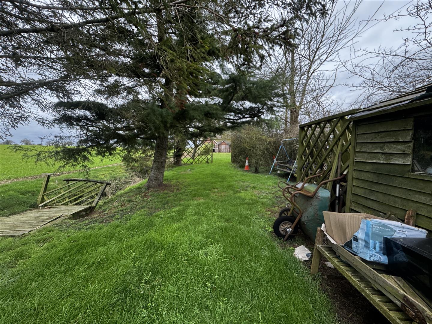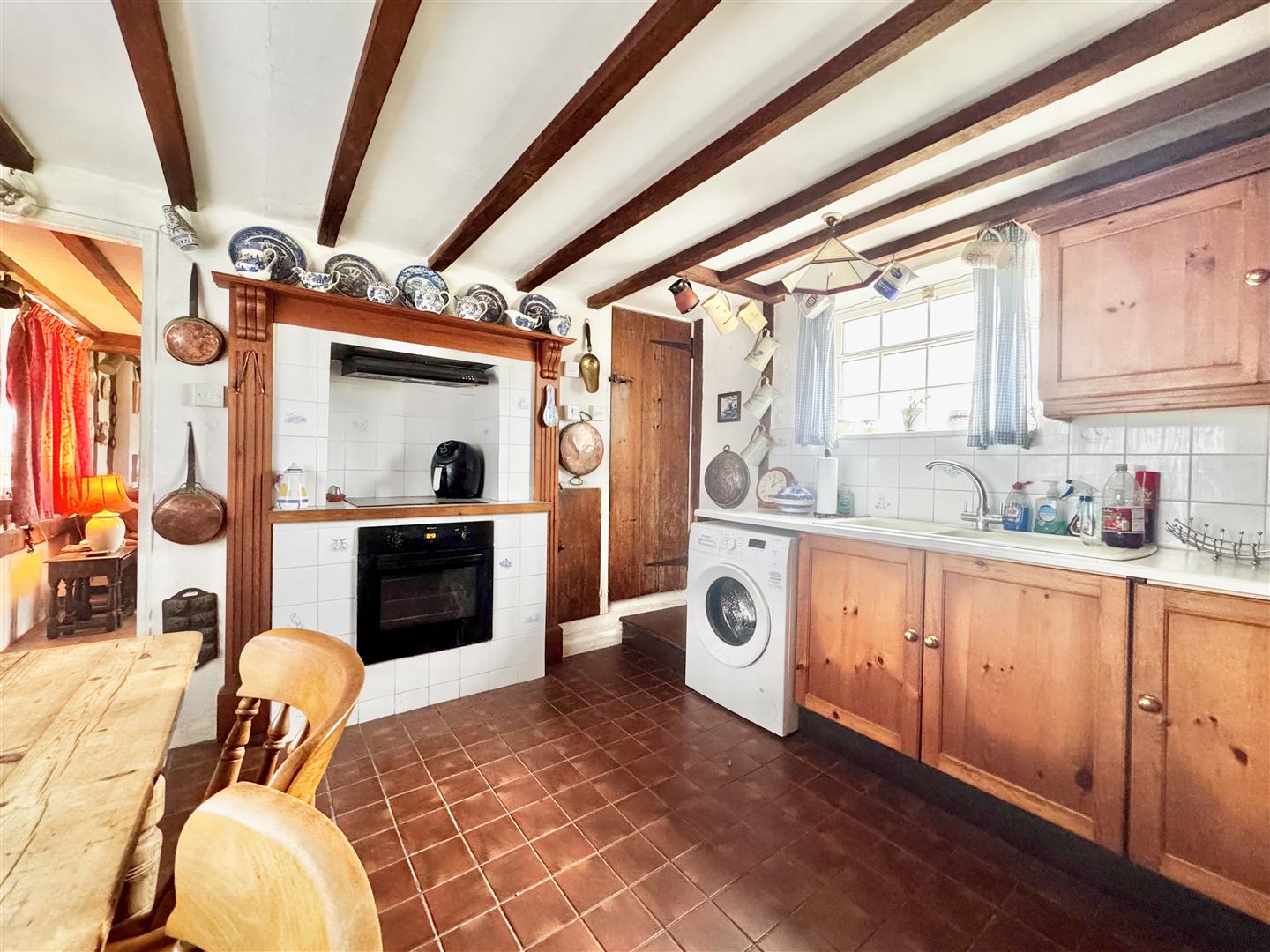 A front door from the parking area opens into an entrance hall which immediately highlights both the period character and surprisingly generous proportions of the cottage. Traditional latch and brace doors lead to the principal ground floor rooms. The shower room forms part of a later addition and is fitted with a shower enclosure, WC and wash basin set within a vanity unit. Whilst perfectly serviceable, the property would now benefit from a programme of general updating and improvement throughout. The kitchen dining room sits at the centre of the house and is a naturally light space with windows to both front and rear elevations enjoying rural views. Exposed timbers remain in place, and the kitchen is arranged around the walls with the oven and hob positioned within the former fireplace recess. There is space for a dining table, and a walk-in pantry provides useful additional storage. The room offers clear scope for modernisation to suit a purchaser’s own taste and requirements. From the kitchen, stairs rise to the first floor, and a doorway leads through to the sitting room. This is a notably spacious reception room with windows to two elevations allowing for excellent natural light and views over the surrounding countryside. Ceiling timbers remain exposed, and an open fireplace provides a focal point. French doors open into the lean-to garden room, which overlooks the rear garden and offers further potential for improvement. On the first floor, the stairs lead into a substantial landing area currently used by the present owners as a guest bedroom and study space. Windows to both front and rear elevations provide elevated views. Bedroom three is a generous single room incorporating the airing cupboard, whilst the principal bedroom is a well-proportioned double enjoying a dual aspect. From here, access is gained to bedroom four, another single room. The first floor layout is somewhat unconventional but offers flexibility and clear opportunity for reconfiguration, subject to any necessary consents. Overall, White Post Cottage presents an attractive period home requiring updating, offering buyers the opportunity to enhance and adapt the accommodation to modern expectations.