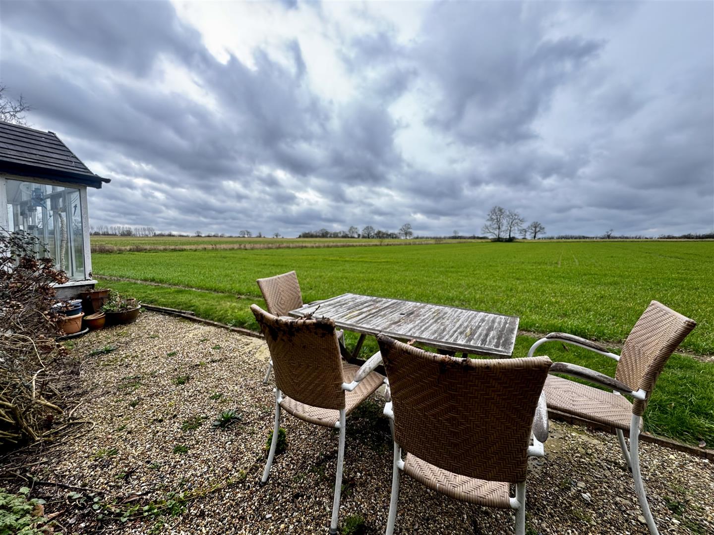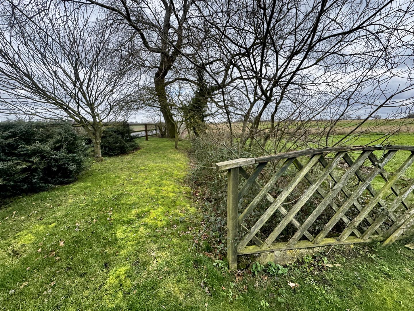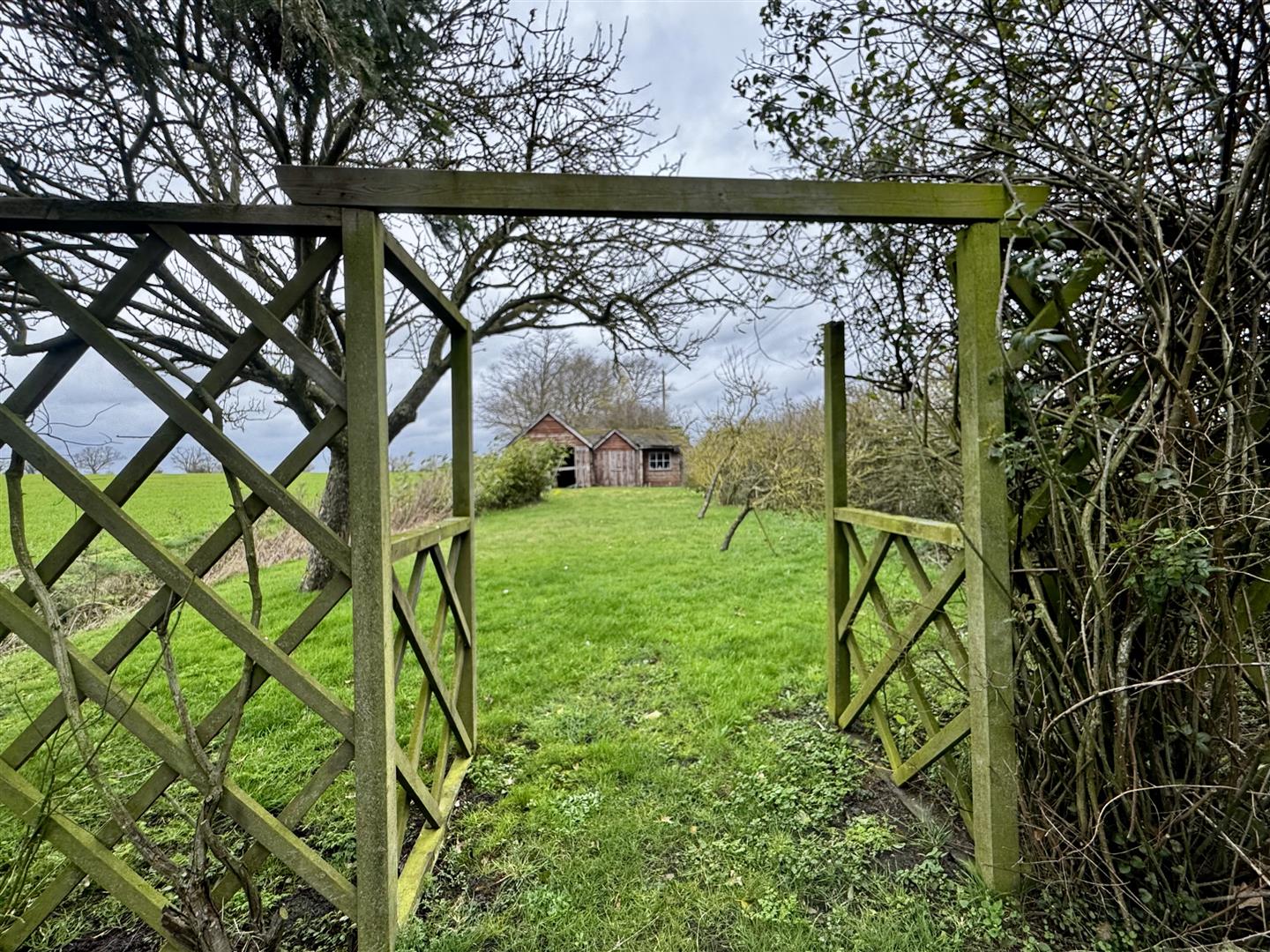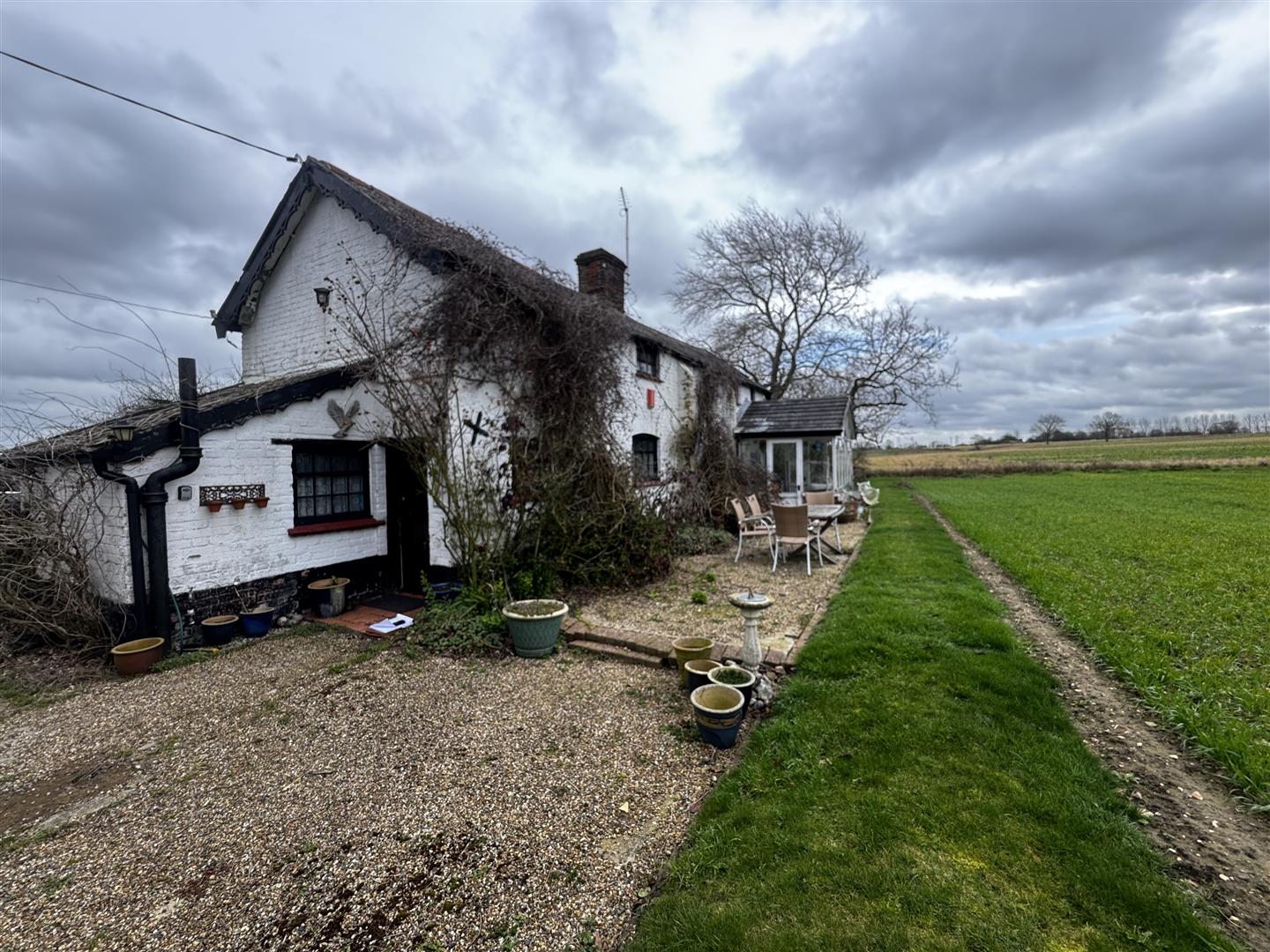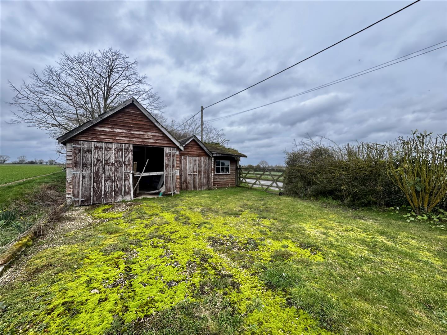 The property is approached from Laxfield Road via two separate access points. One provides access to the parking area adjacent to the cottage, while further along the frontage a five-bar gate opens to a hardstanding area in front of a timber garage and workshop. The gardens extend alongside the road and to both sides of the cottage, forming a generous though relatively narrow plot. Open rear boundaries allow for far-reaching views across the adjoining farmland. Established hedging lines the roadside boundary, and the majority of the garden is laid to lawn with mature fruit trees and shrubs. Two patio areas are positioned to the rear of the cottage, accessed from the lean-to garden room, providing space for seating and enjoying the outlook across the garden and countryside beyond.