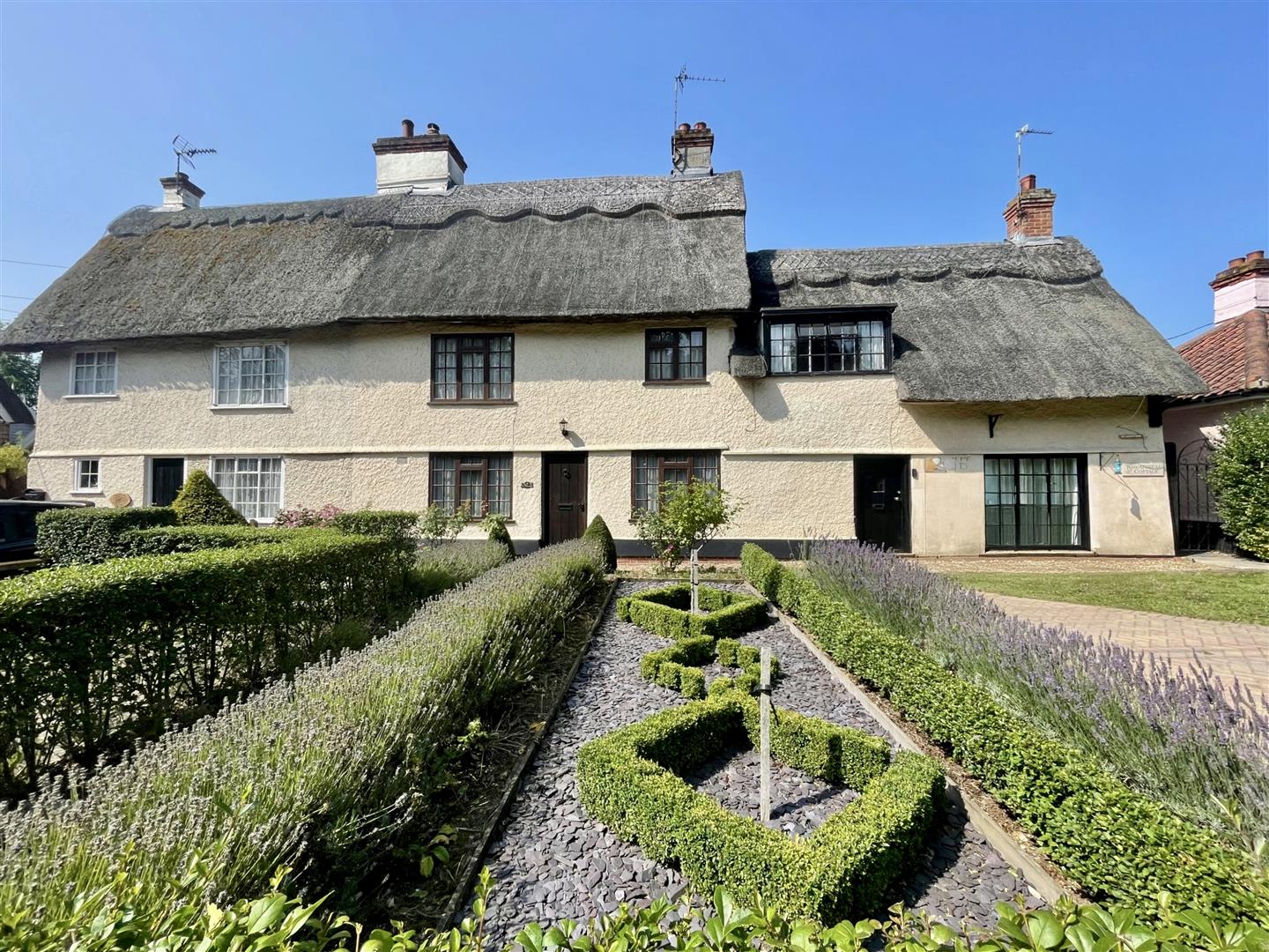 This beautifully presented two-bedroom thatched cottage in the heart of Stradbroke, Suffolk, is rich in character and charm. The spacious open-plan kitchen and living area is the heart of the home, featuring exposed beams and a warm, inviting atmosphere. A separate dining room provides a versatile space for family meals or entertaining. The ground floor also benefits from a well-appointed shower room, while upstairs, two generously sized double bedrooms offer a peaceful retreat with plenty of natural light. The thatched roof and period features enhance the cottage’s traditional appeal, while thoughtful updates ensure comfortable living. Set in the sought-after village of Stradbroke, this home enjoys a tranquil yet convenient location, with local amenities, countryside walks, and a strong sense of community just moments away. A rare opportunity to own a characterful home in one of Suffolk’s most desirable villages.