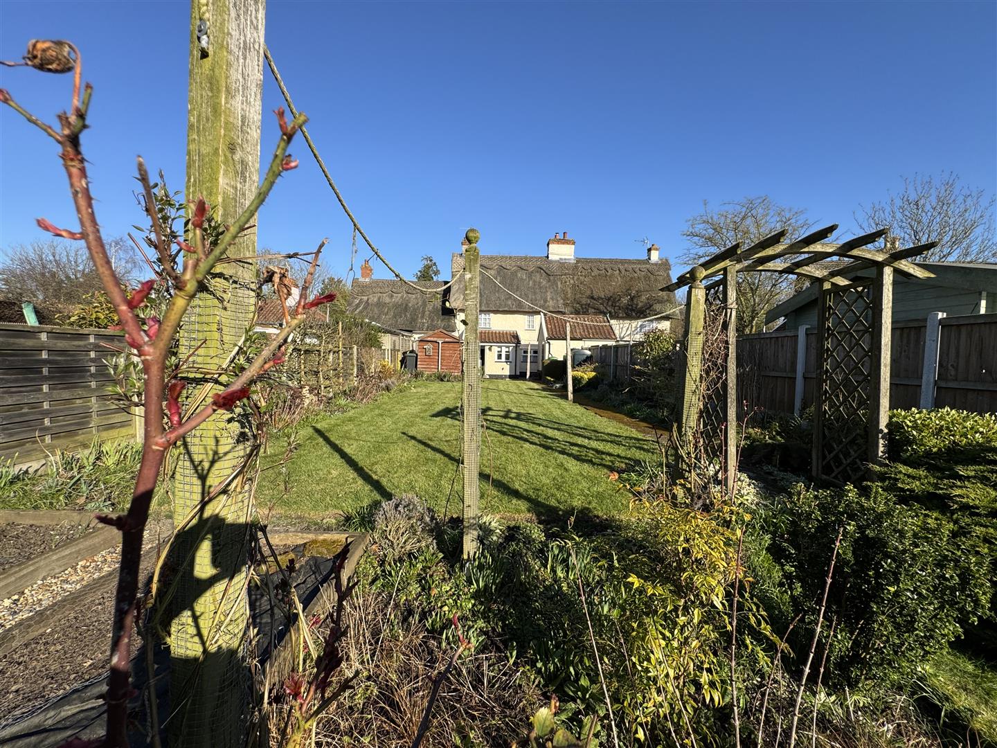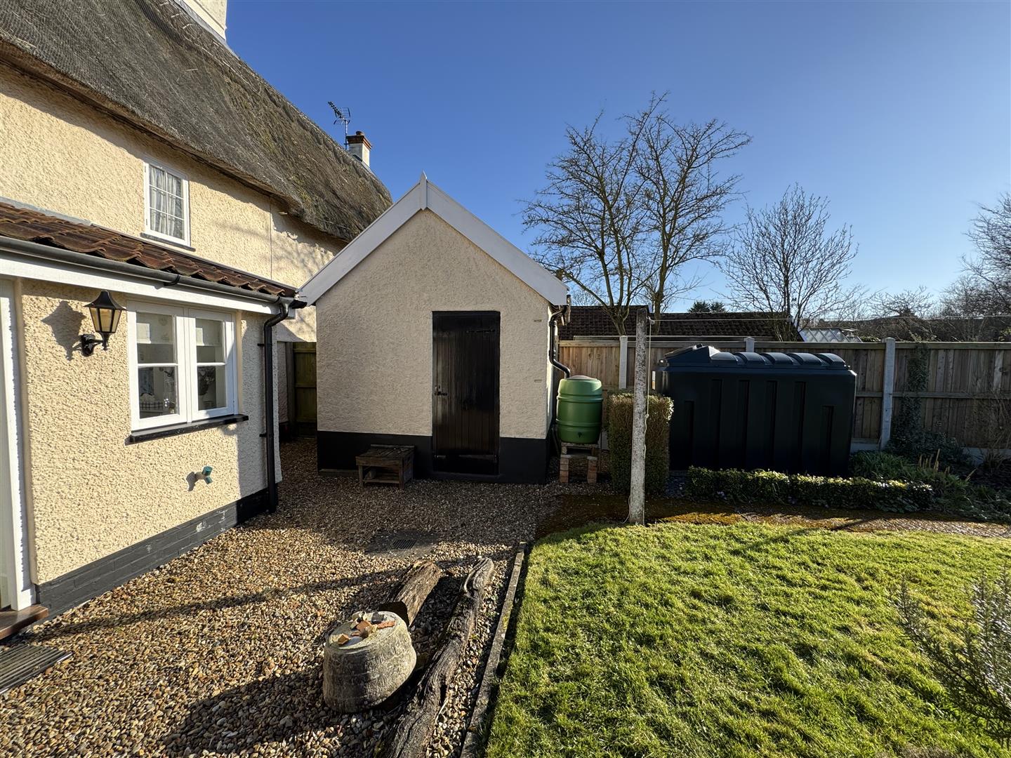 The property is framed by a beautifully landscaped front garden, featuring elegant box hedging that forms a striking, symmetrical design. This carefully maintained space adds to the cottage’s charm, with a central pathway leading to the entrance, bordered by seasonal flowers and perennial shrubs. At the rear, the generous garden is mainly laid to lawn with mature borders.. Thoughtfully designed, the outdoor space provides both aesthetic appeal and functionality, with raised vegetable beds at the end of the garden. Off-road parking is accessed via a shingle driveway.