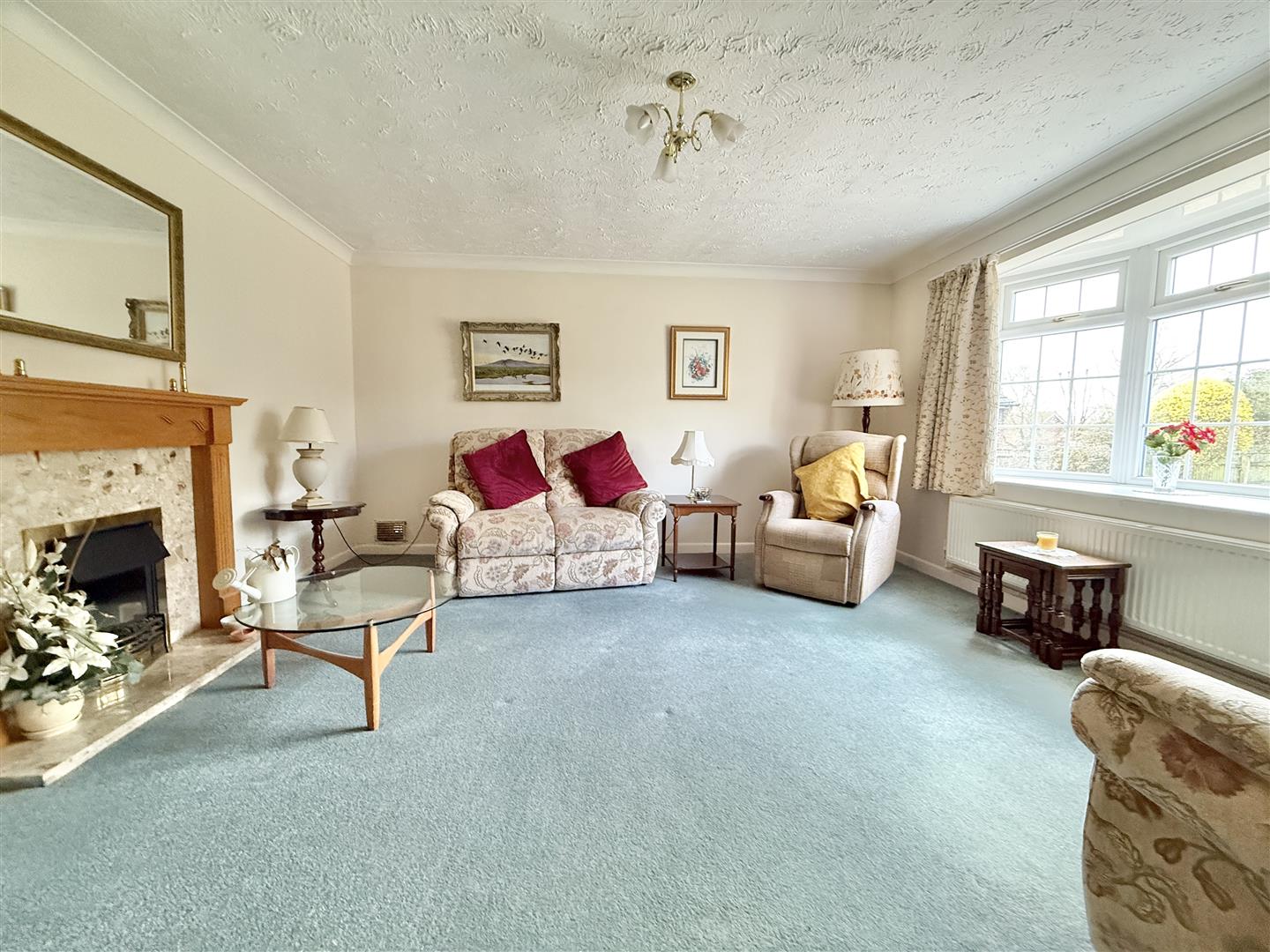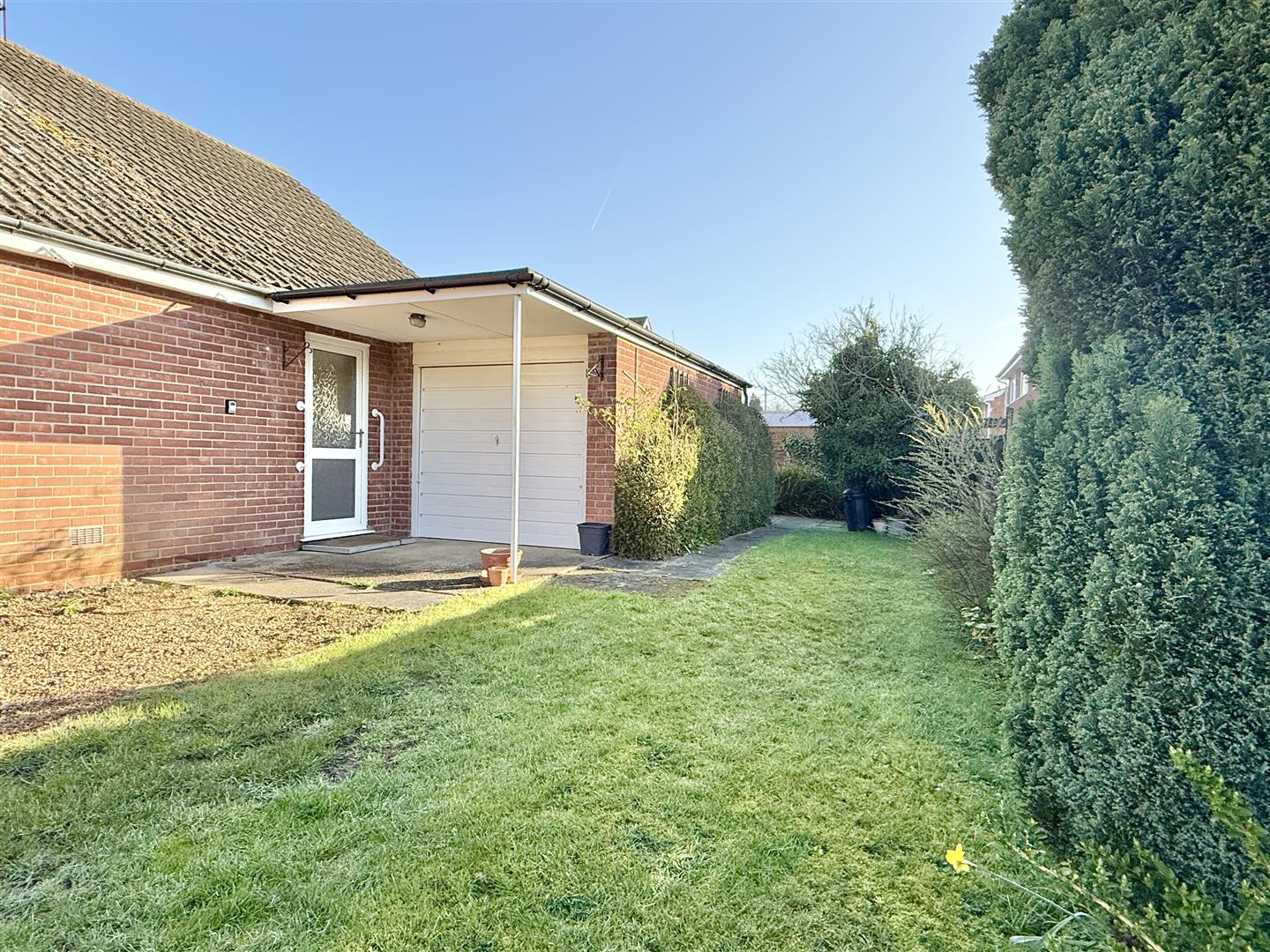 Driveway leads down the side of the property to a single garage and sheltered porch. The front is laid to lawn and also extends down the side of the property around to the rear garden. The rear garden is laid to lawn with fenced rear boundary.