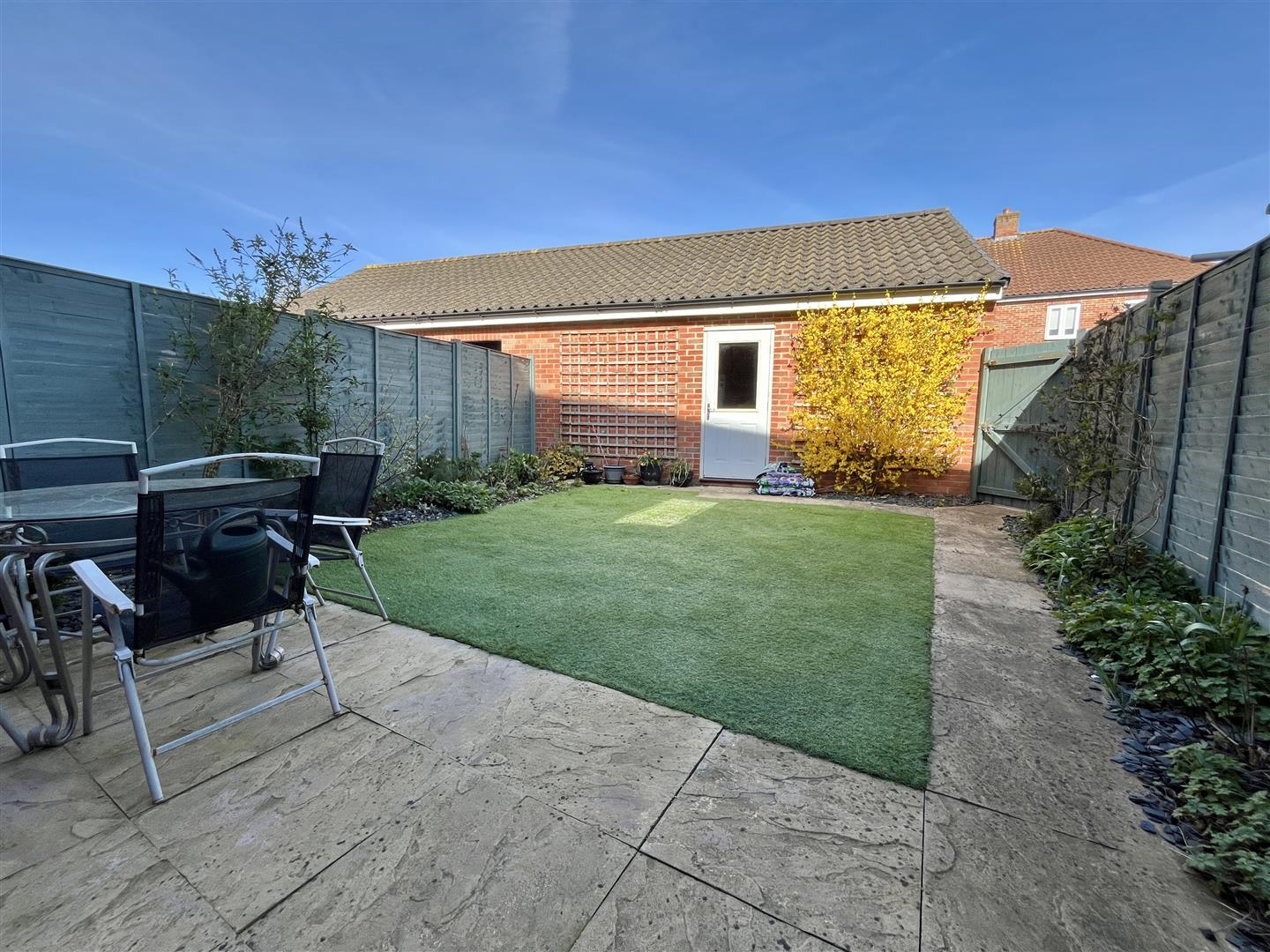 The property benefits from off-road parking at the front, providing convenient and secure space for vehicles. The rear garden is fully enclosed and designed for low-maintenance living, featuring artificial lawn, a rear access gate, and a personal door leading directly into the garage. The brick-built garage also offers additional parking space in front, combining practicality with versatility.