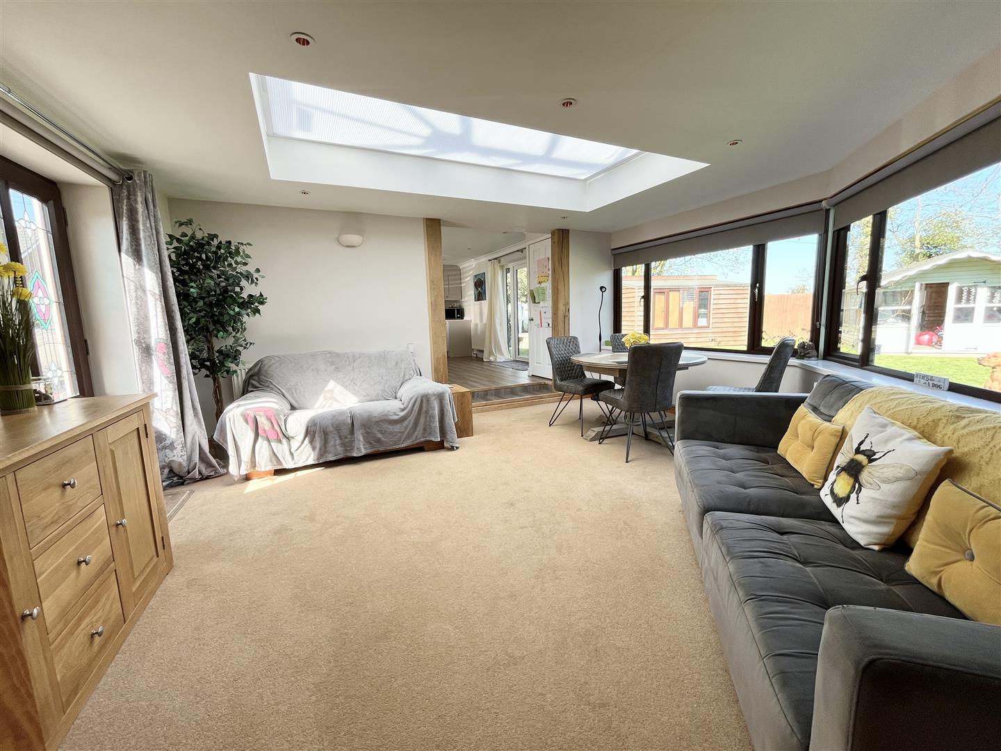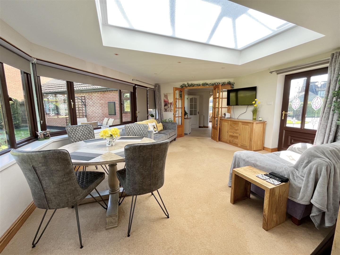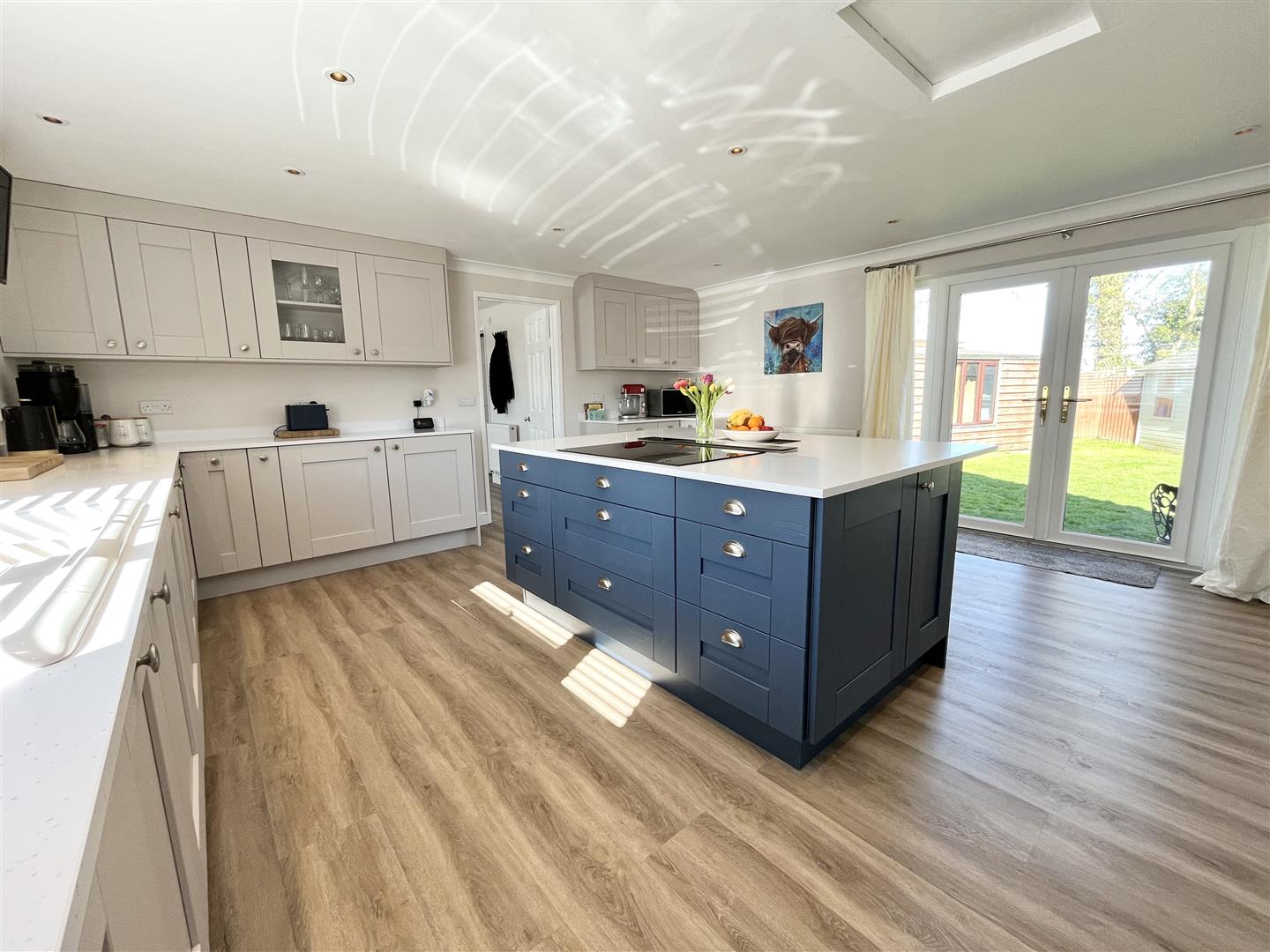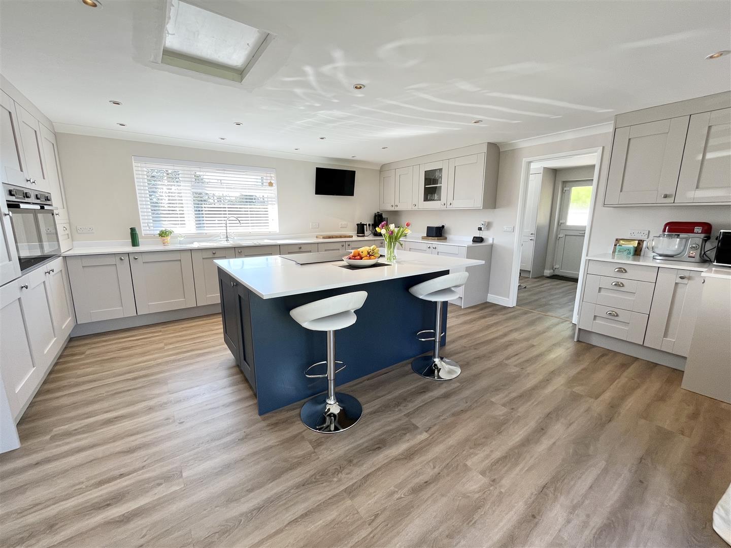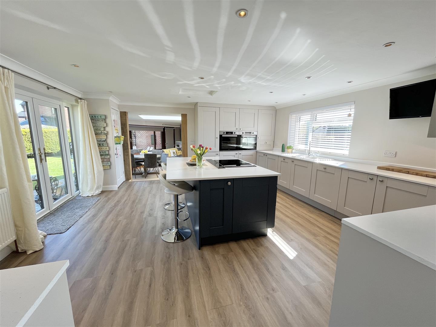 An exceptional and substantially extended detached bungalow, offering over 1,700 sq ft of beautifully appointed and highly versatile living space, finished to an impressive standard throughout. Upon arrival, a welcoming and spacious entrance hall sets the tone for the quality within, leading to a superb principal bedroom, a stylish second bedroom with contemporary en suite, a further generous double bedroom, and a fourth bedroom or elegant home office. A family bathroom, serves the remaining accommodation. The formal lounge is bathed in natural light from dual-aspect windows and flows effortlessly into a refined dining area perfect for both intimate evenings and larger gatherings. At the heart of the home lies a stunning open-plan family space with roof latten and solar blind designed for modern living, which seamlessly connects to a recently installed, high-specification kitchen/breakfast room. This impressive space features sleek cabinetry, premium integrated appliances, and a striking central island, ideal for both casual dining and entertaining. Further enhancing the home is a well-designed utility/boot room and a beautifully finished contemporary shower room, combining practicality with style. This outstanding home perfectly balances elegance, comfort, and functionality, making it ideal for discerning buyers seeking single-storey living without compromise.