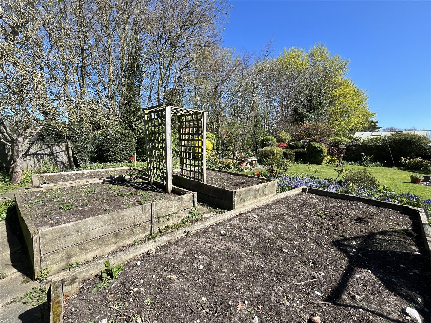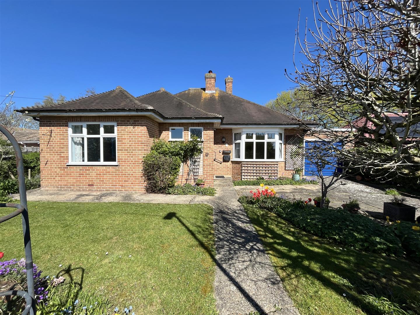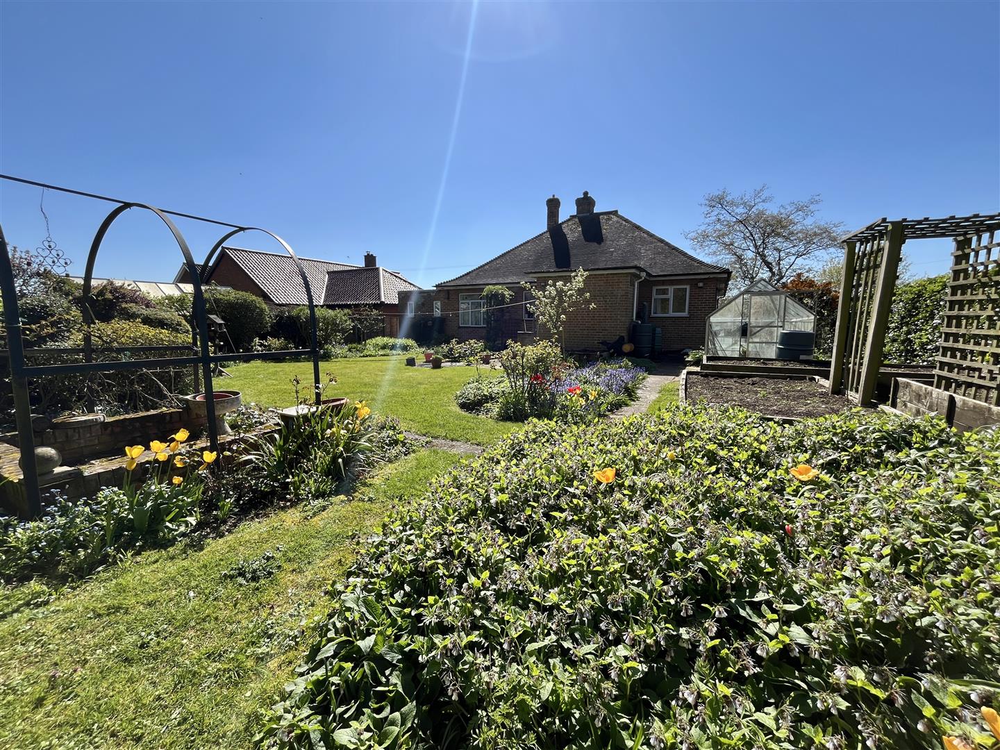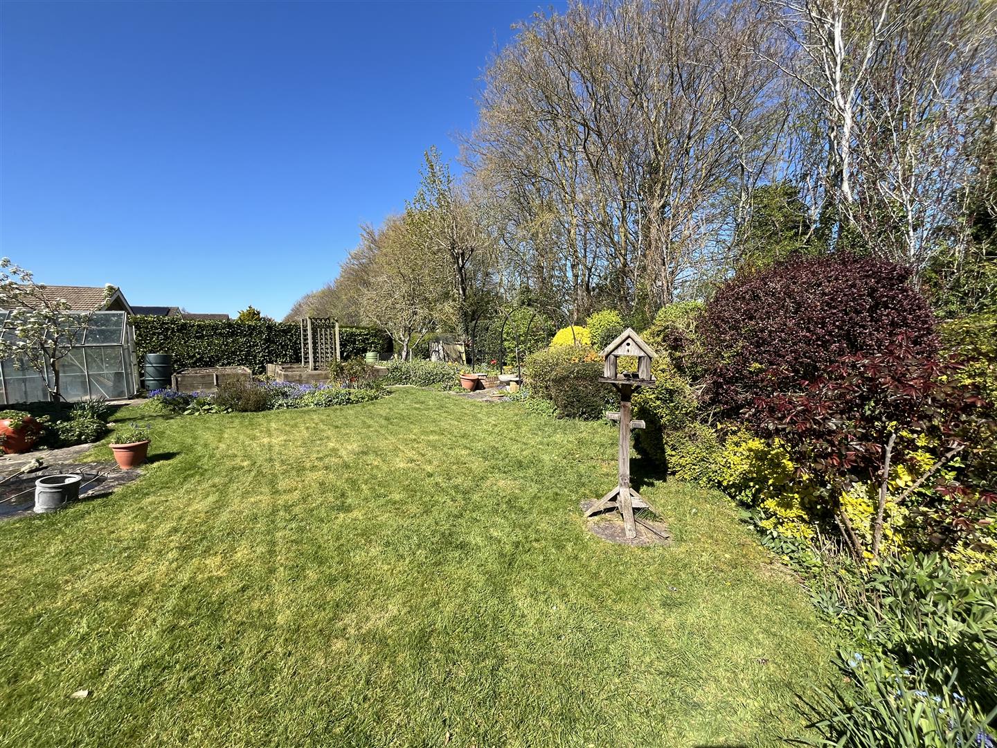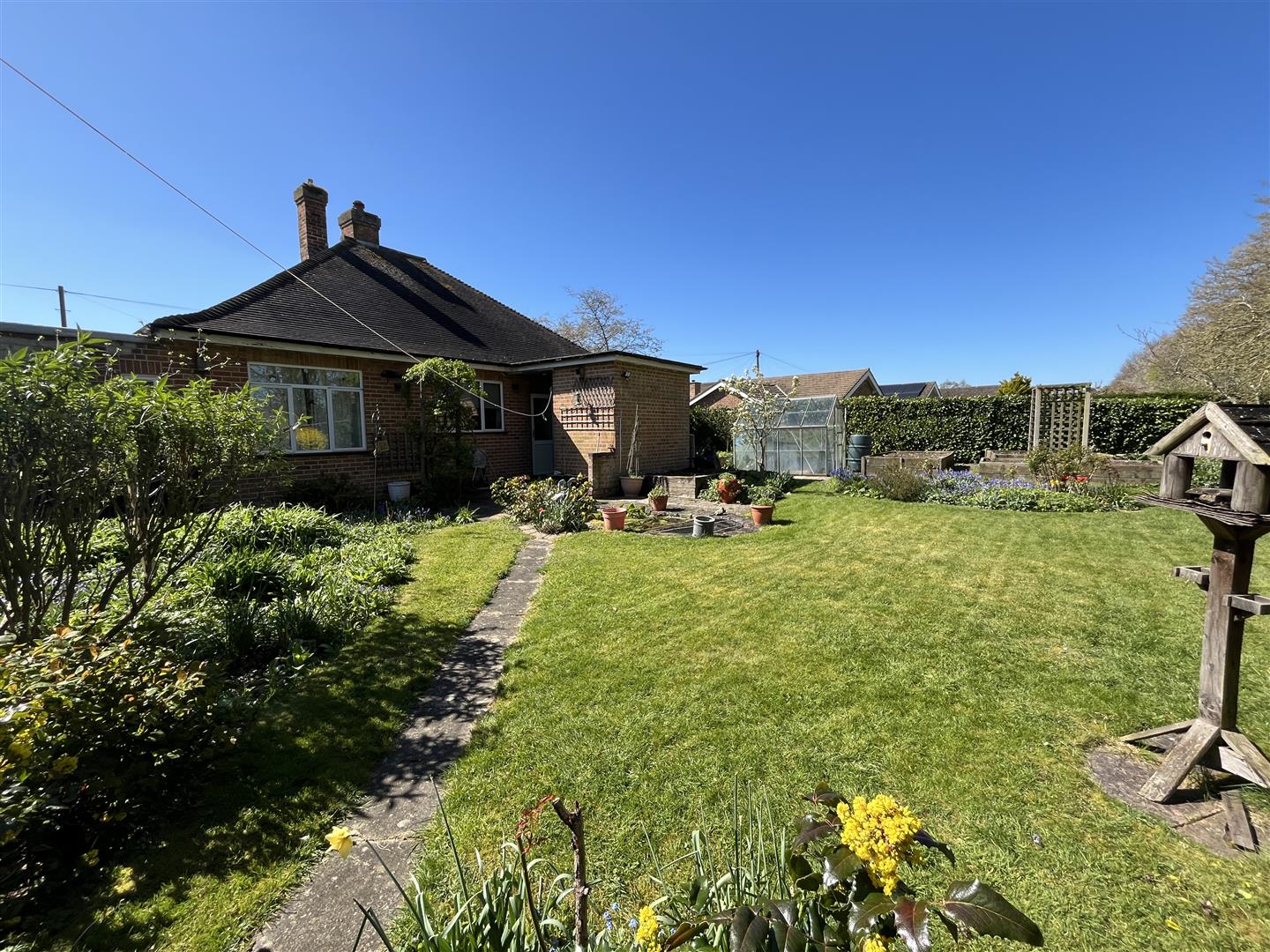 The bungalow stands behind a wall with gated access, opening onto a generous driveway providing ample off-road parking and access to the garage. To the rear, the property boasts a truly beautiful, well-stocked and mature garden, lovingly maintained and offering a high degree of privacy. Perfect for those with a passion for gardening, the space includes a vegetable plot and greenhouse, creating an ideal outdoor retreat that is both productive and tranquil, all while remaining not overlooked.