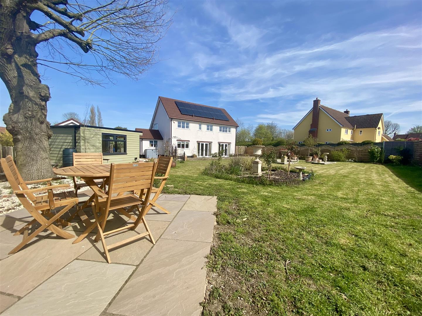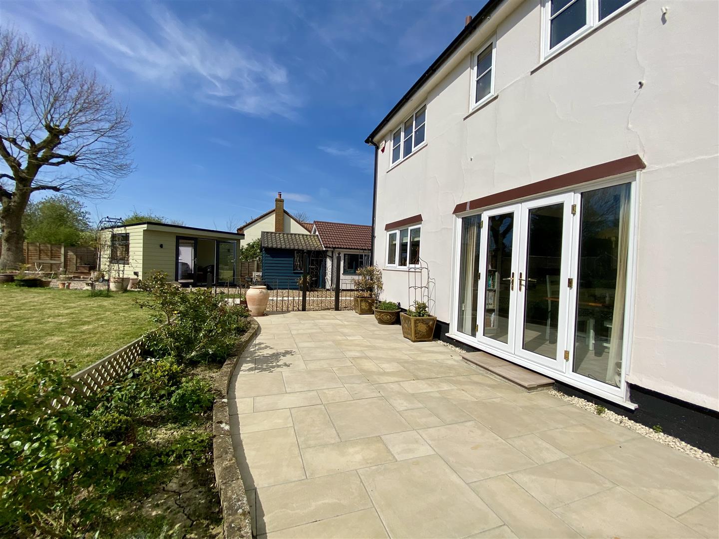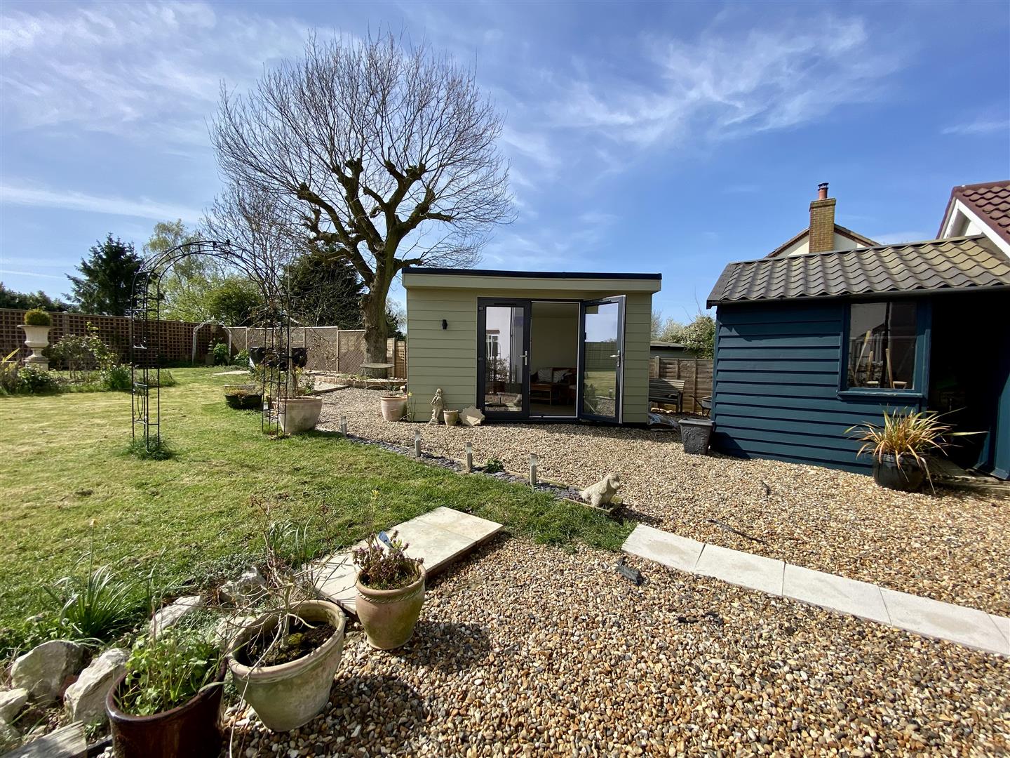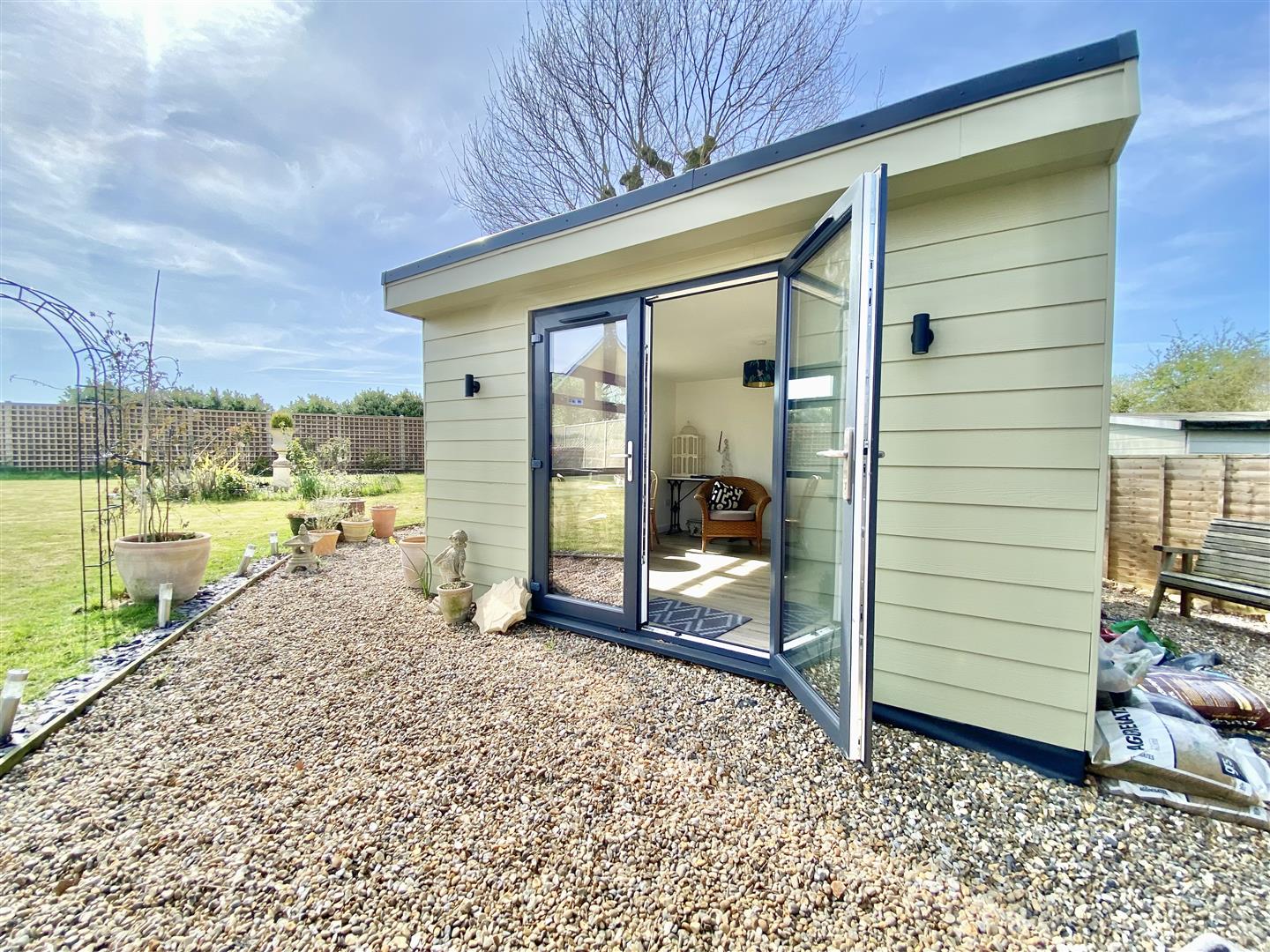The property is set well back from the road and approached via double gates, opening onto a gravel driveway that provides ample off-road parking and access to the detached garage/workshop. The gardens have been recently landscaped to create an attractive and well-maintained outdoor space. A porcelain patio, added in recent years, offers a stylish and practical seating area, accessed from multiple points at the rear of the house - ideal for both everyday use and entertaining. The remainder of the garden is predominantly laid to lawn, complemented by thoughtfully planted borders filled with a variety of perennial shrubs, providing colour and seasonal interest throughout the year, along with several secluded seating areas to enjoy different aspects of the garden. A particular highlight is the garden studio, finished to a high standard and fully insulated and heated, making it perfectly suited for year-round use. Whether utilised as a home office, hobby space, or for entertaining, it offers excellent versatility to suit a range of needs.