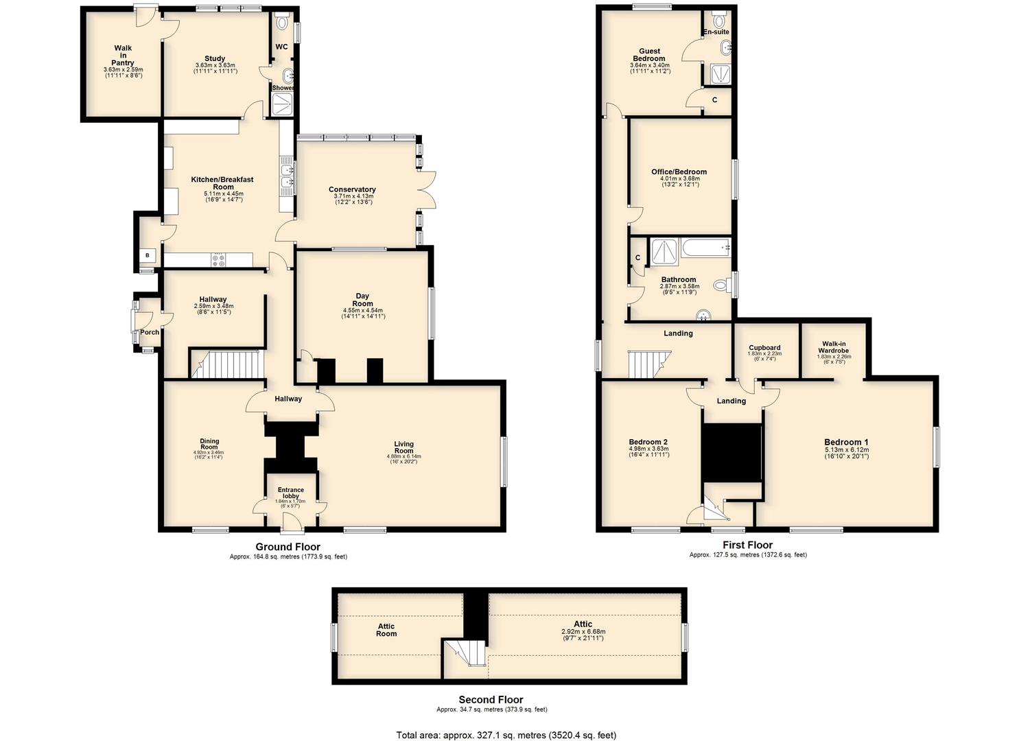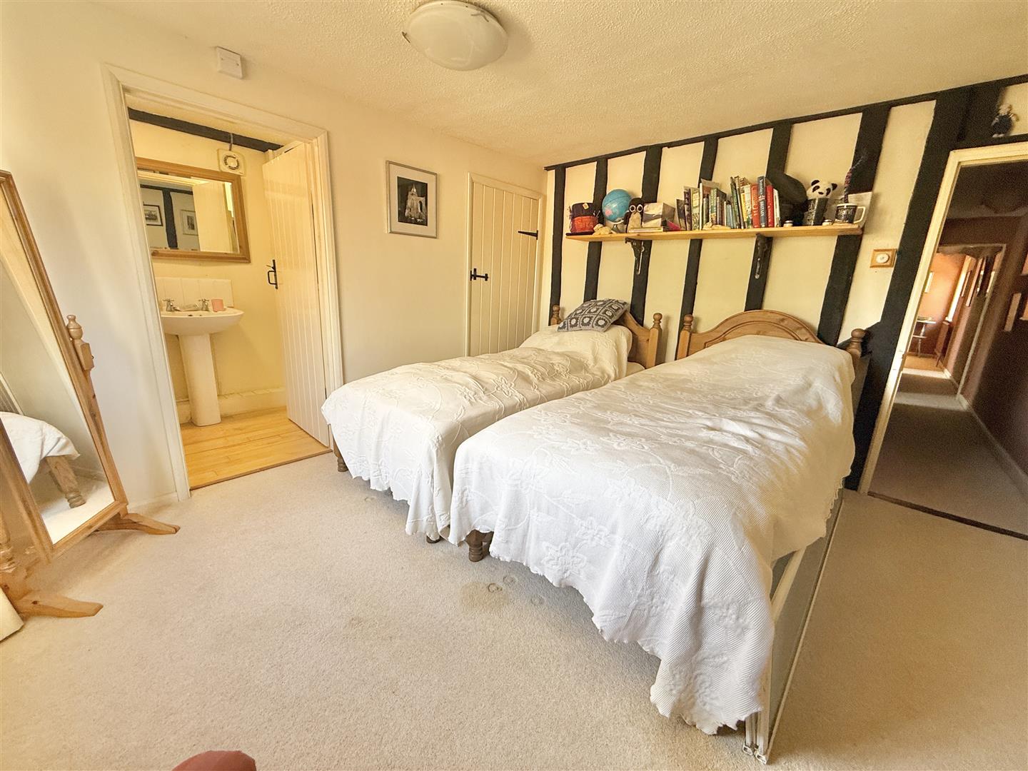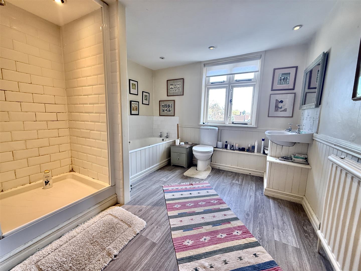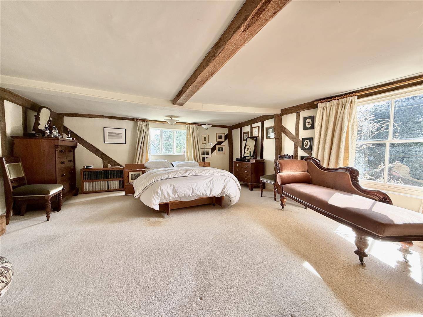 Upstairs, the house has four nicely proportioned double bedrooms; the standout main bedroom and bedroom 2 at the front are similar in size to the reception rooms below. The landing then leads back to a well appointed bathroom with bath and separate shower cubicle, along with two more bedrooms, one of which is currently set up as a study/library and, finally, the back guest bedroom, which benefits from an en-suite shower room. There are two generous attic sections - both gable ends have windows and hold potential to be converted into further living accommodation (subject to relevant listed building consent/building regulations).