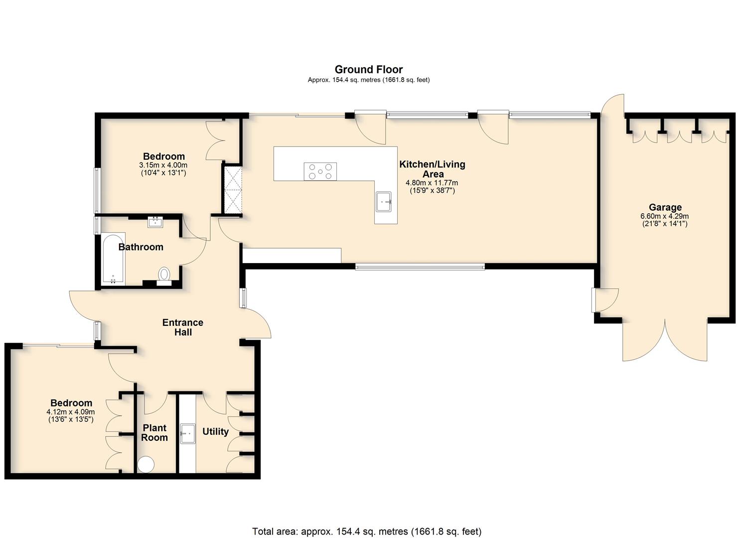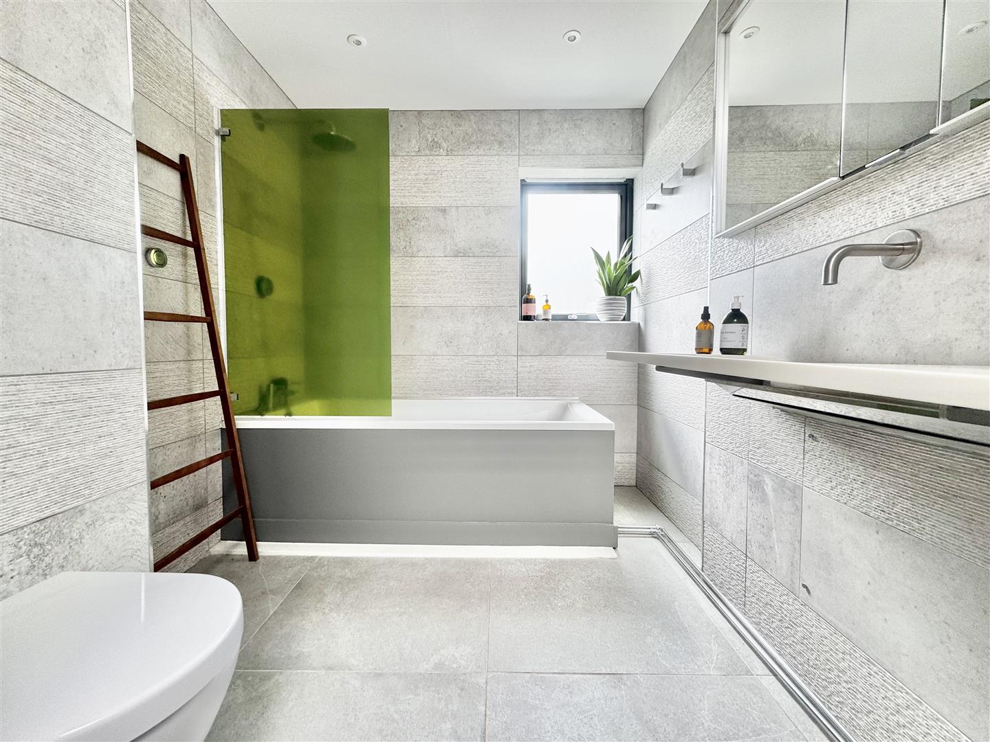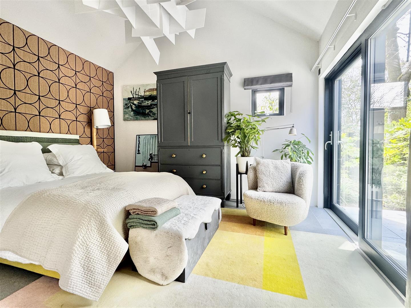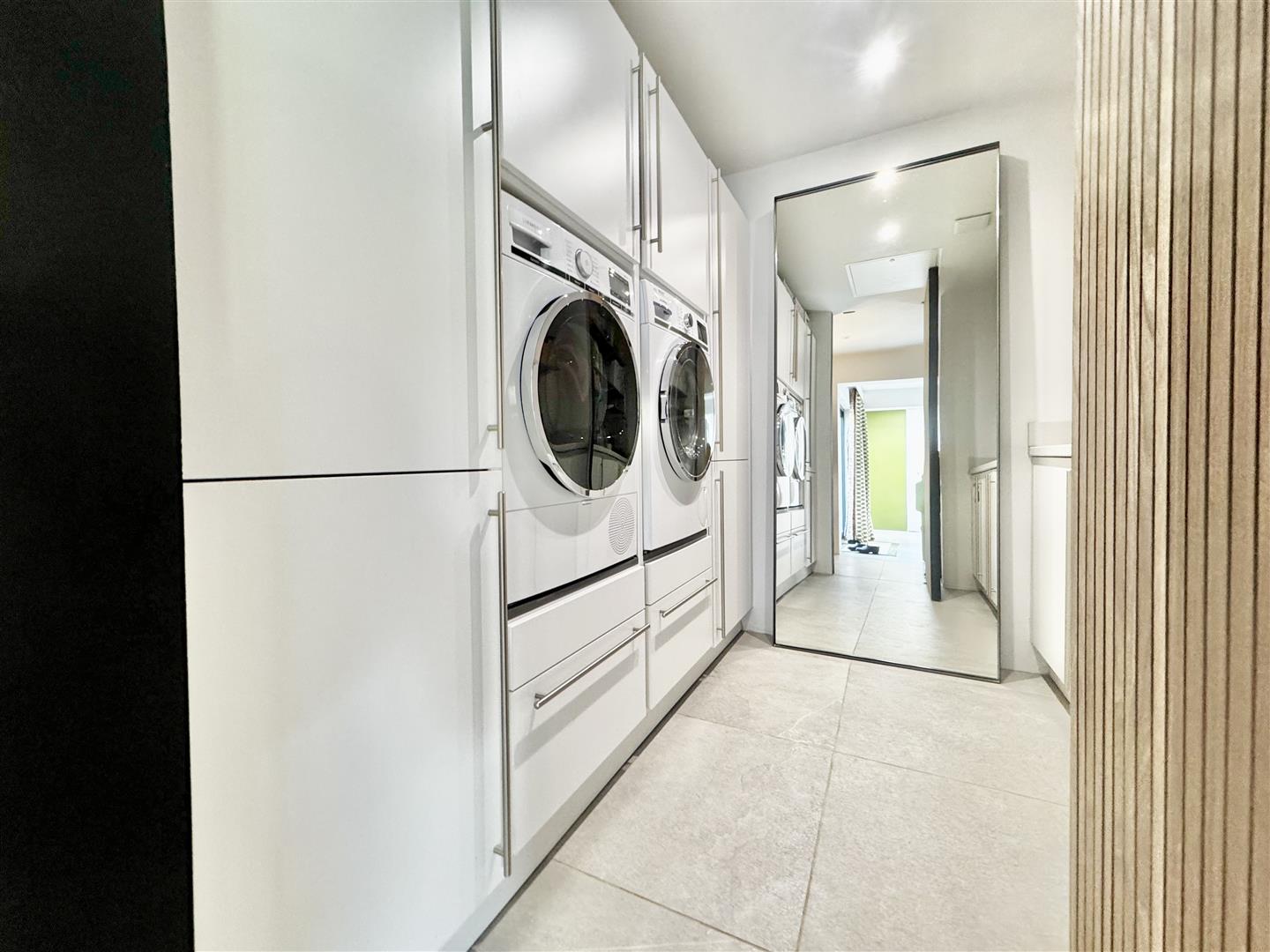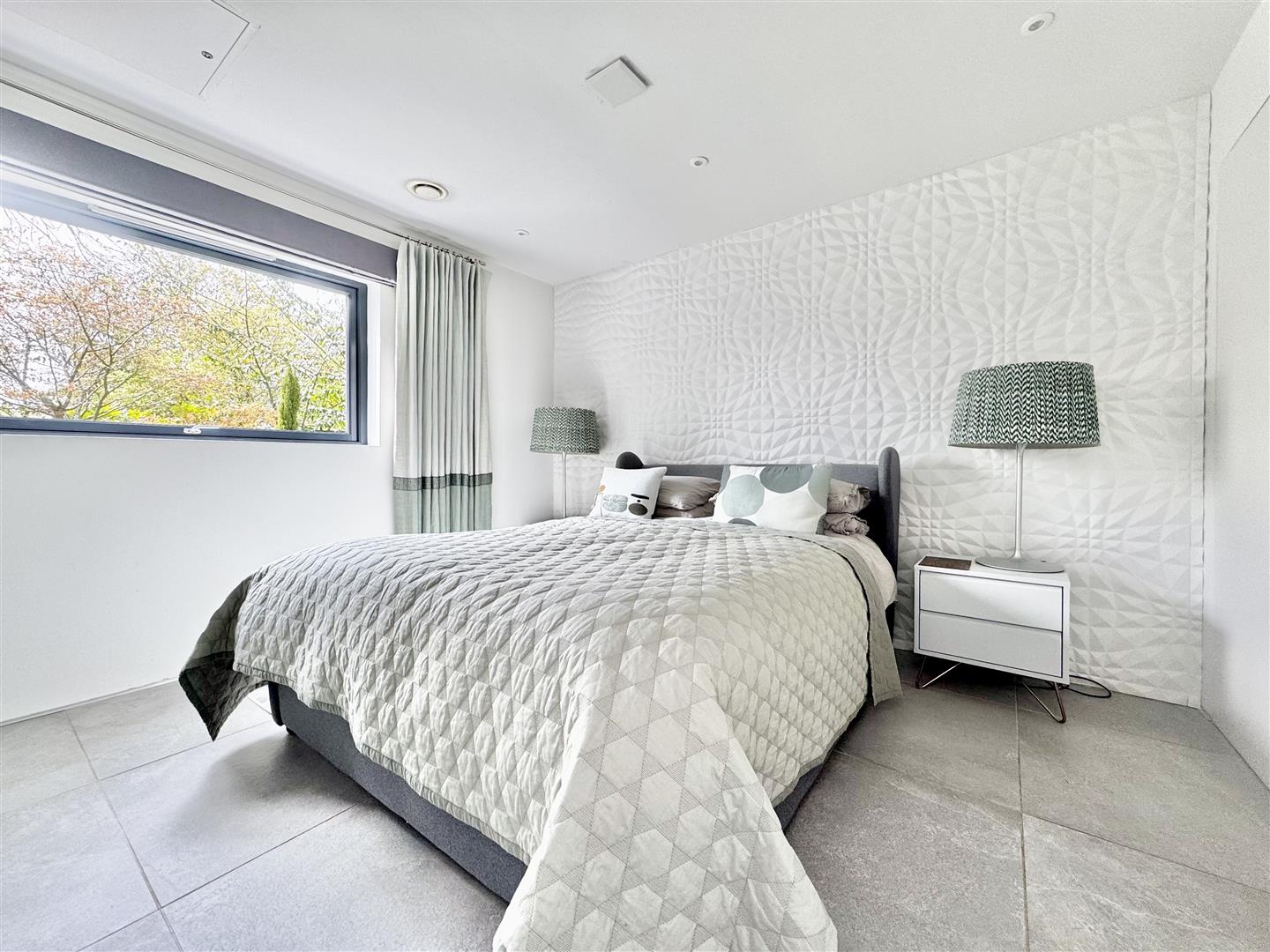 A striking wood-clad feature wall incorporates flush-hinged doors, cleverly concealing access to the principal bedroom, plant room, and a well-designed utility room, where appliances are positioned at a practical waist height for ease of use. Both bedrooms are immaculately presented, with the second bedroom enjoying a pleasant side aspect. The remainder of the accommodation is arranged in an impressive open-plan layout, thoughtfully zoned using contemporary shelving units. This provides subtle separation while preserving the clean architectural lines and sense of space.