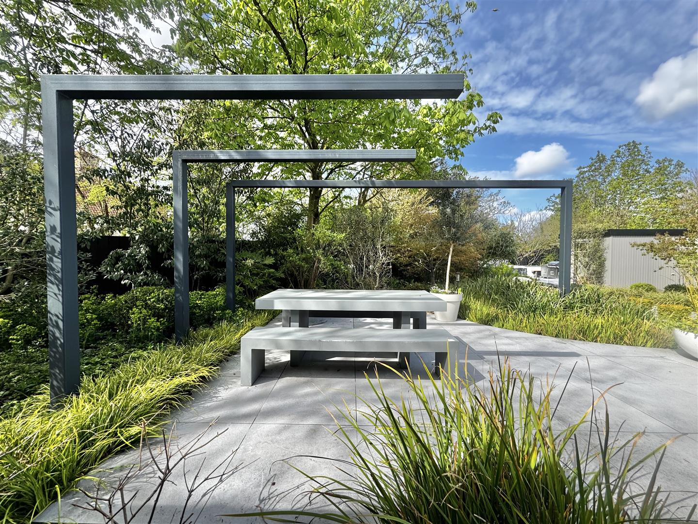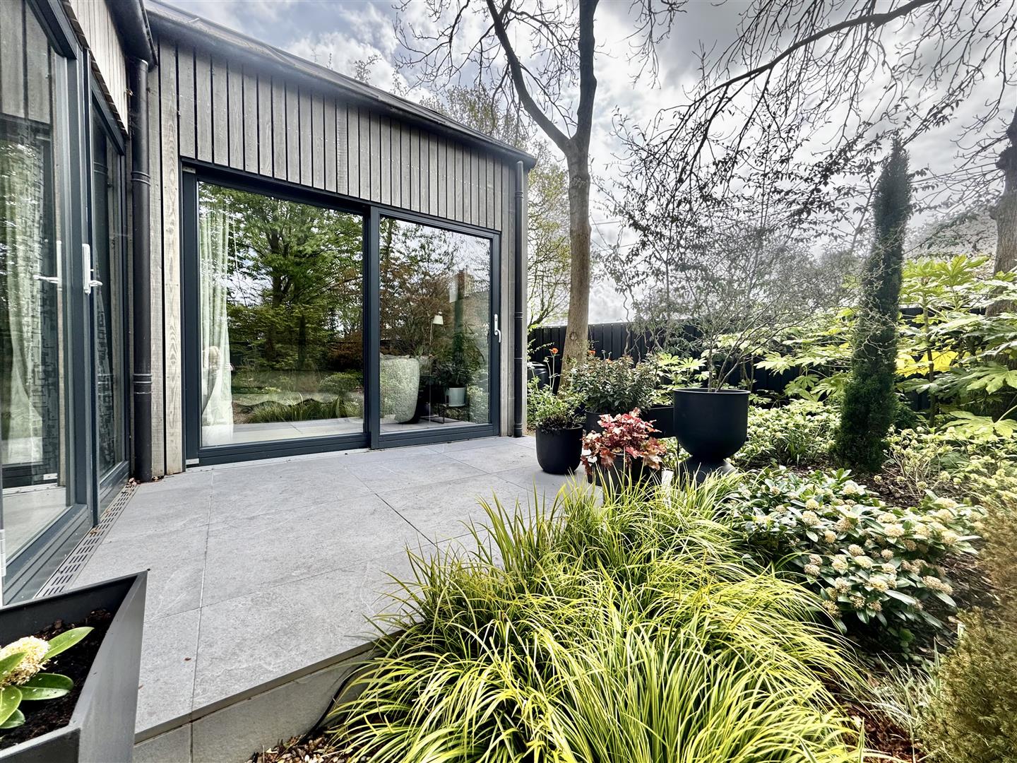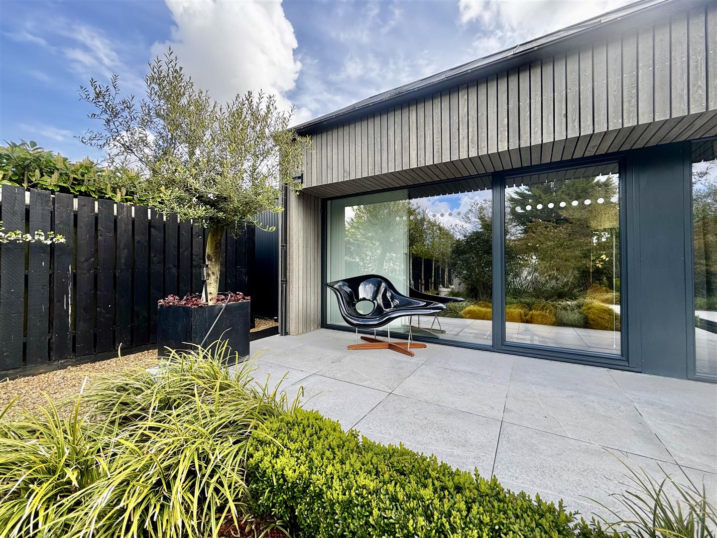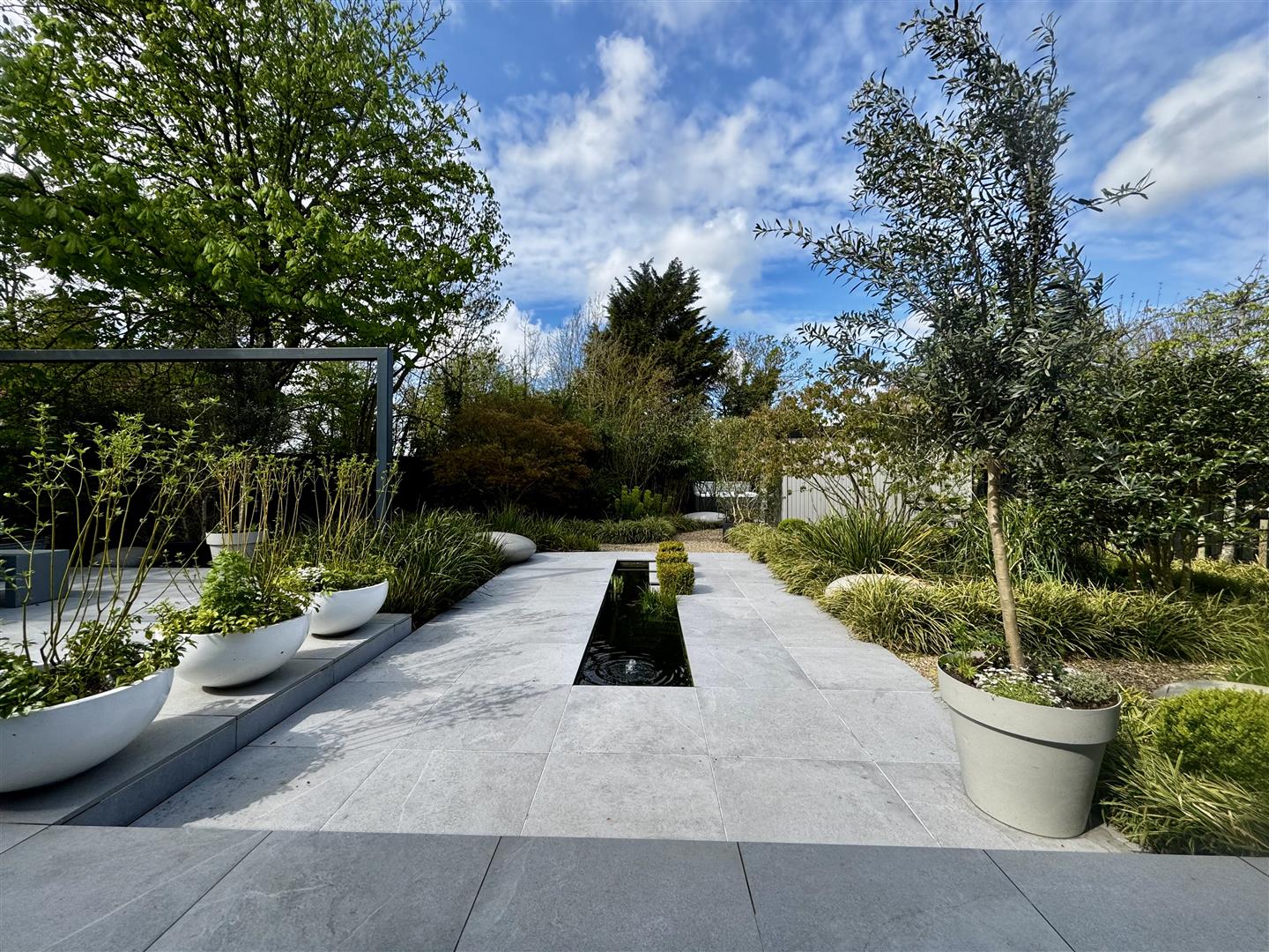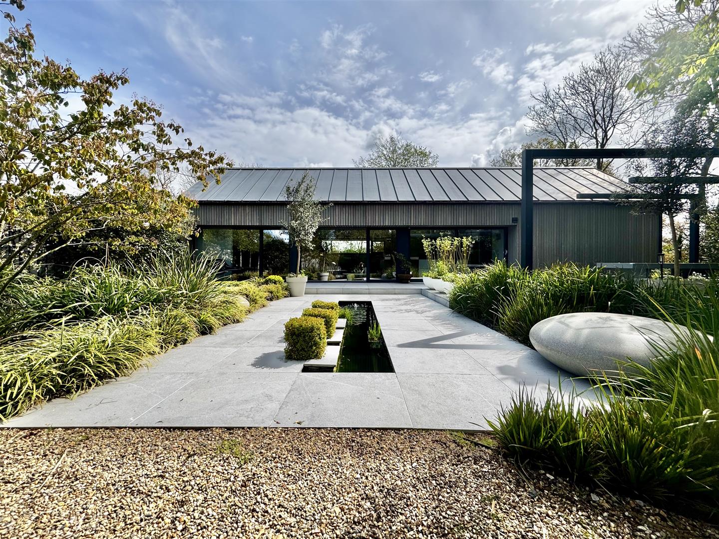 A porcelain patio, accessed directly from the house, provides an elegant space for seating and entertaining. A striking sunken sculptural pond creates a focal point, drawing the eye through the garden and enhancing the sense of tranquillity. The patio extends to a contemporary outdoor dining area, sheltered beneath a sculptural modern pergola.