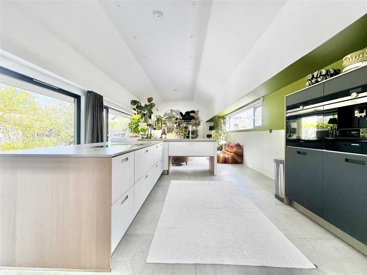The kitchen is sleek and minimalist in design, with high-quality cabinetry concealing integrated appliances and deep pan drawers with internal storage solutions. Premium features include a Quooker tap providing instant boiling, chilled, and sparkling water, alongside Siemens integrated appliances, including an oven, separate steam oven, and built-in coffee machine, perfectly complementing the high-spec finish.