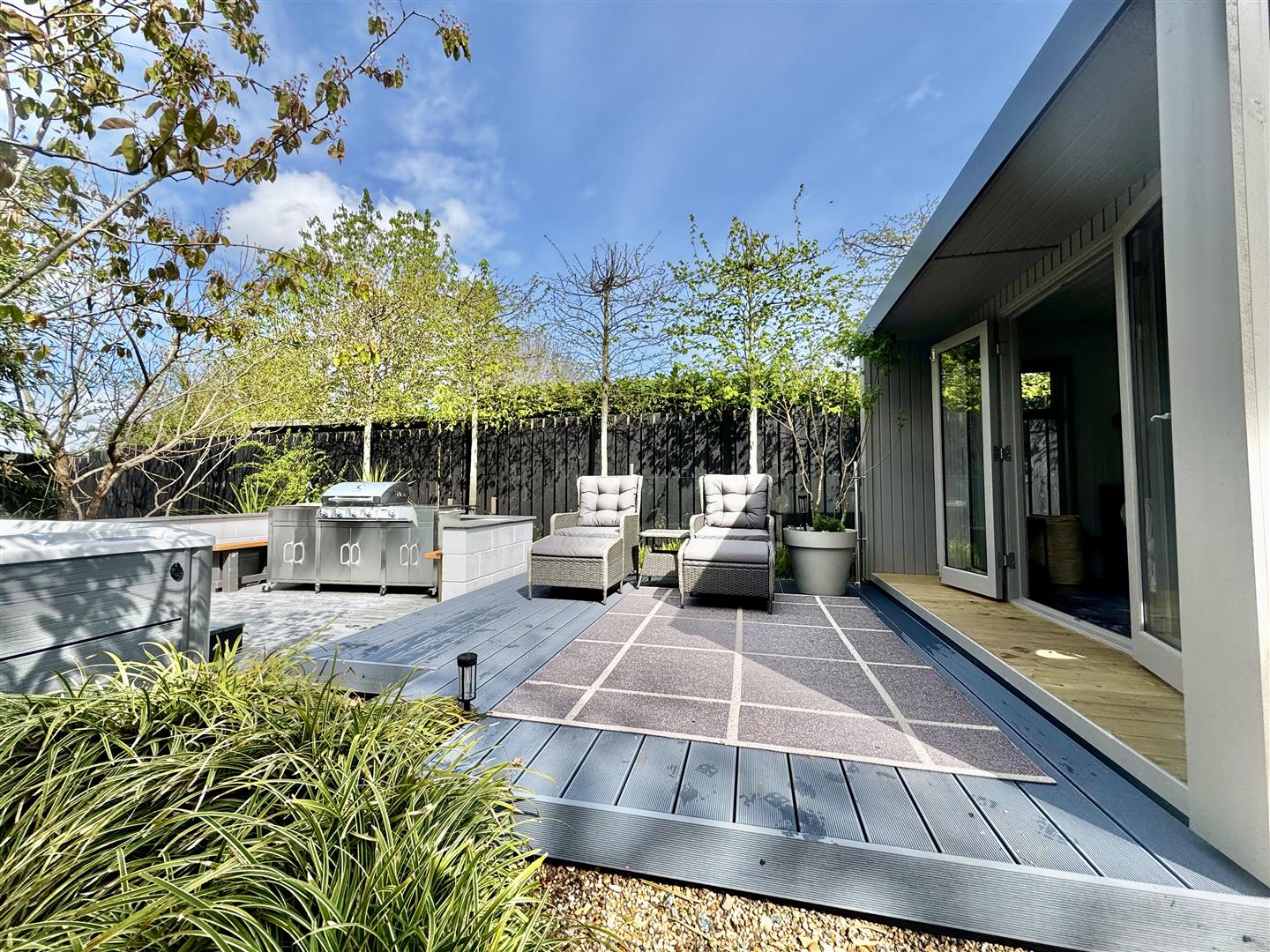 To the rear of the garden, tucked behind established hedging, is a studio clad in a complementary tone to the main house. This versatile space features an electric wood burner and double doors opening onto a decked terrace with an outdoor BBQ area and space for a hot tub. The setting has a distinctly Mediterranean feel, offering a sheltered environment suitable for year round enjoyment.
