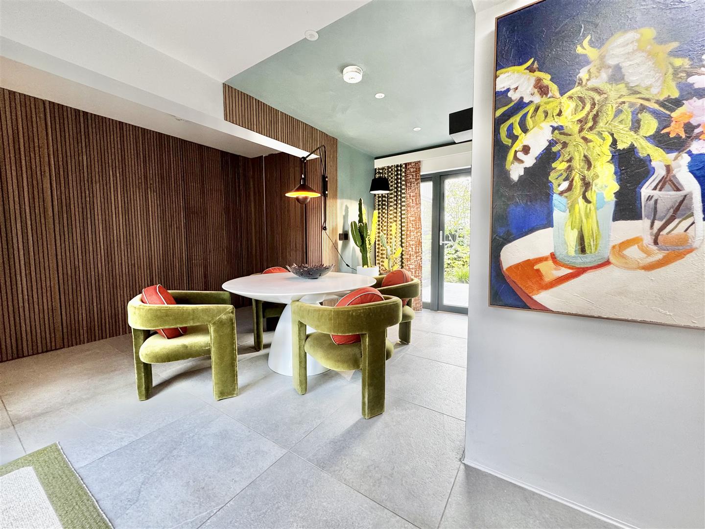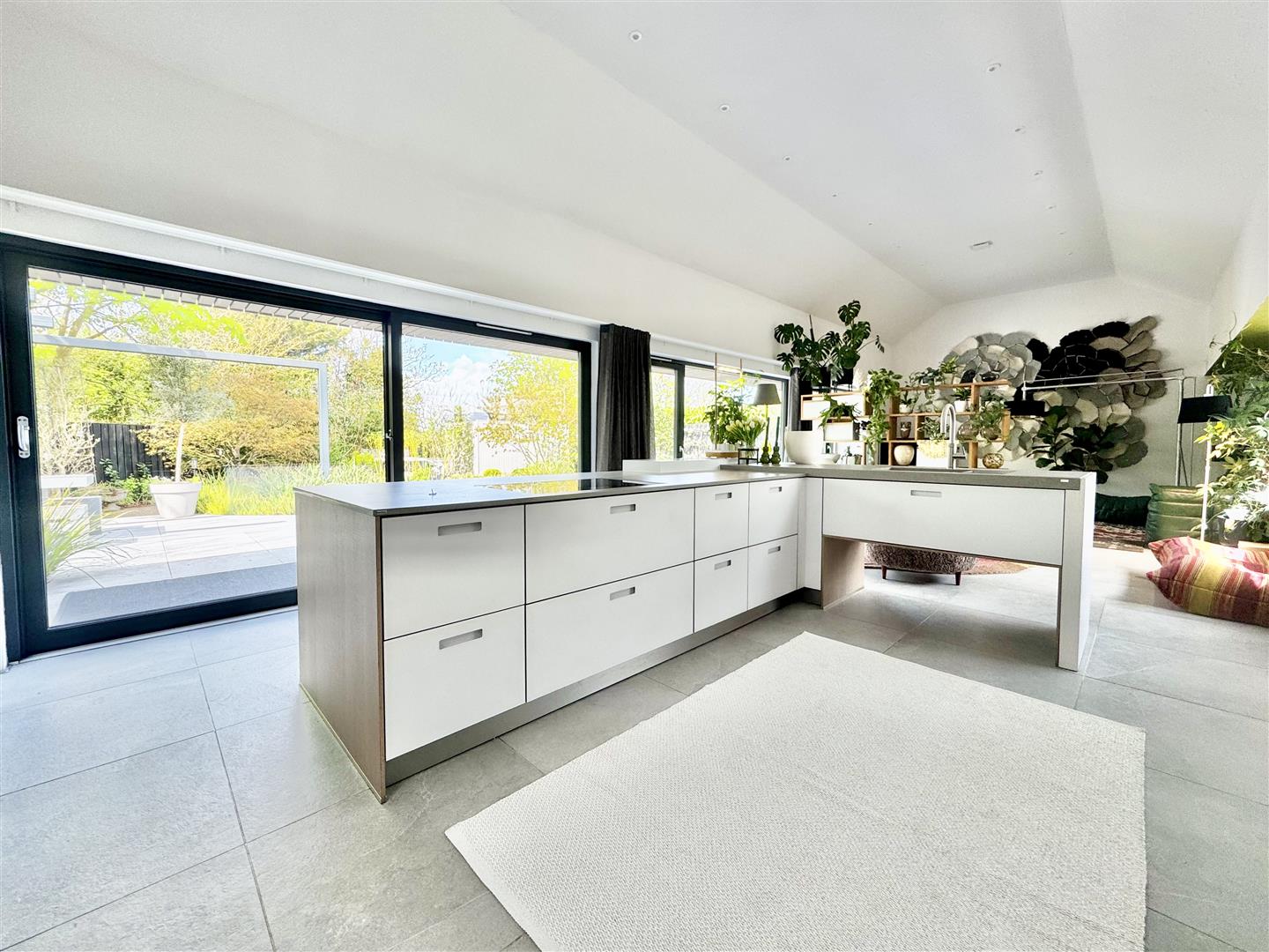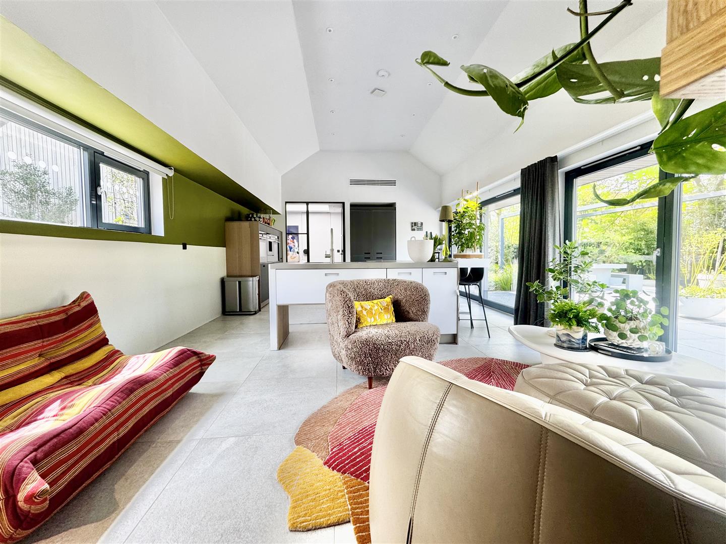 A full-height glazed wall overlooking the garden floods the space with natural light and offers uninterrupted views of the beautifully landscaped grounds. A partially enclosed snug area provides a more intimate setting for evening relaxation, while remaining connected to the overall open-plan environment, ideal for both everyday living and entertaining.