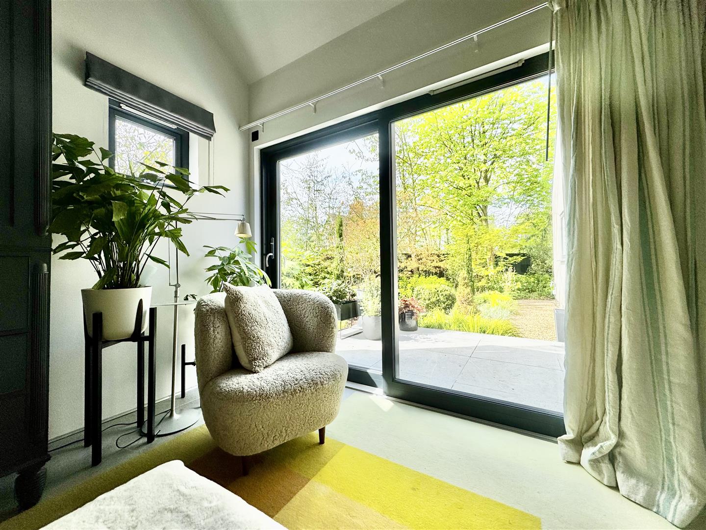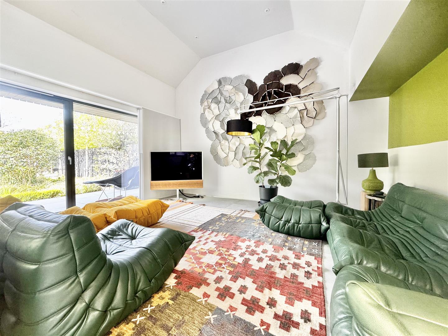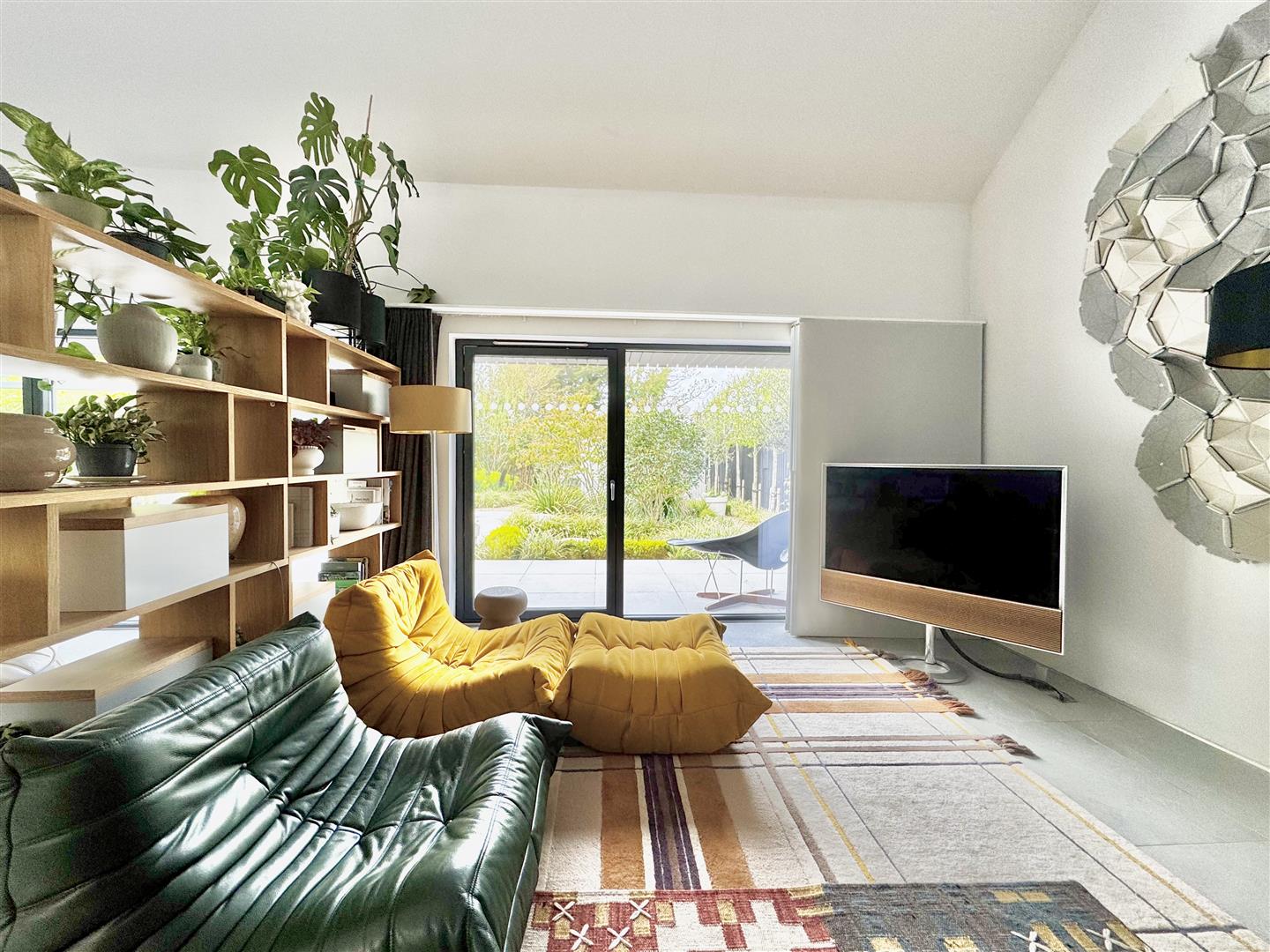 A full-height glazed wall overlooking the garden floods the space with natural light and offers uninterrupted views of the beautifully landscaped grounds. A partially enclosed snug area provides a more intimate setting for evening relaxation, while remaining connected to the overall open-plan environment, ideal for both everyday living and entertaining.