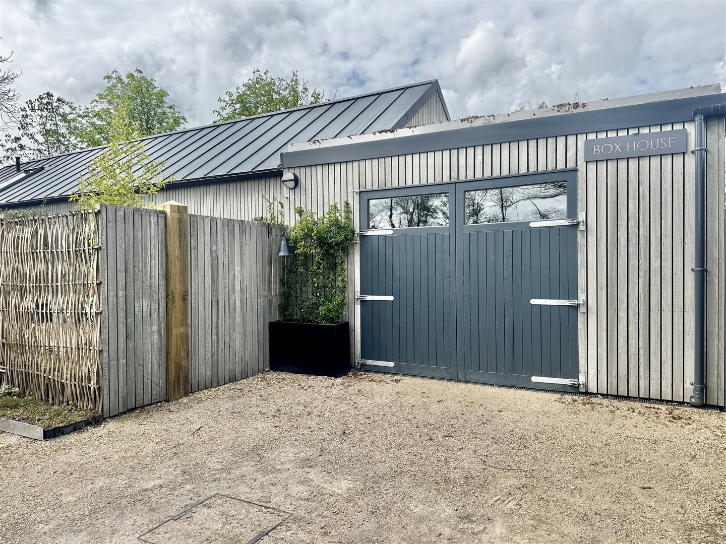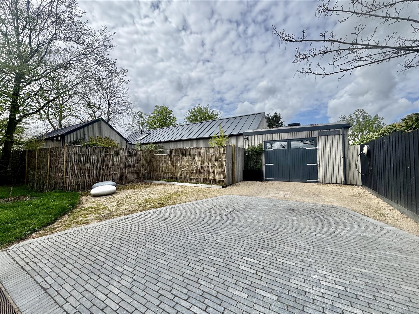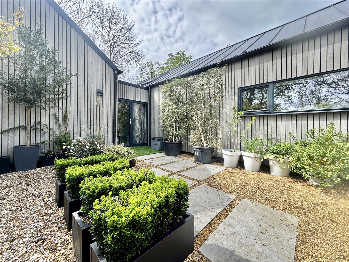 Inspired by a traditional Scottish longhouse, this architecturally outstanding home is beautifully clad in cedar and crowned with an attractive zinc roof. Discreetly set back from the road and screened by elegant willow fencing, the property enjoys a high degree of privacy and a striking first impression. A gate opens into a thoughtfully landscaped front garden, setting the tone for the design-led accommodation beyond.