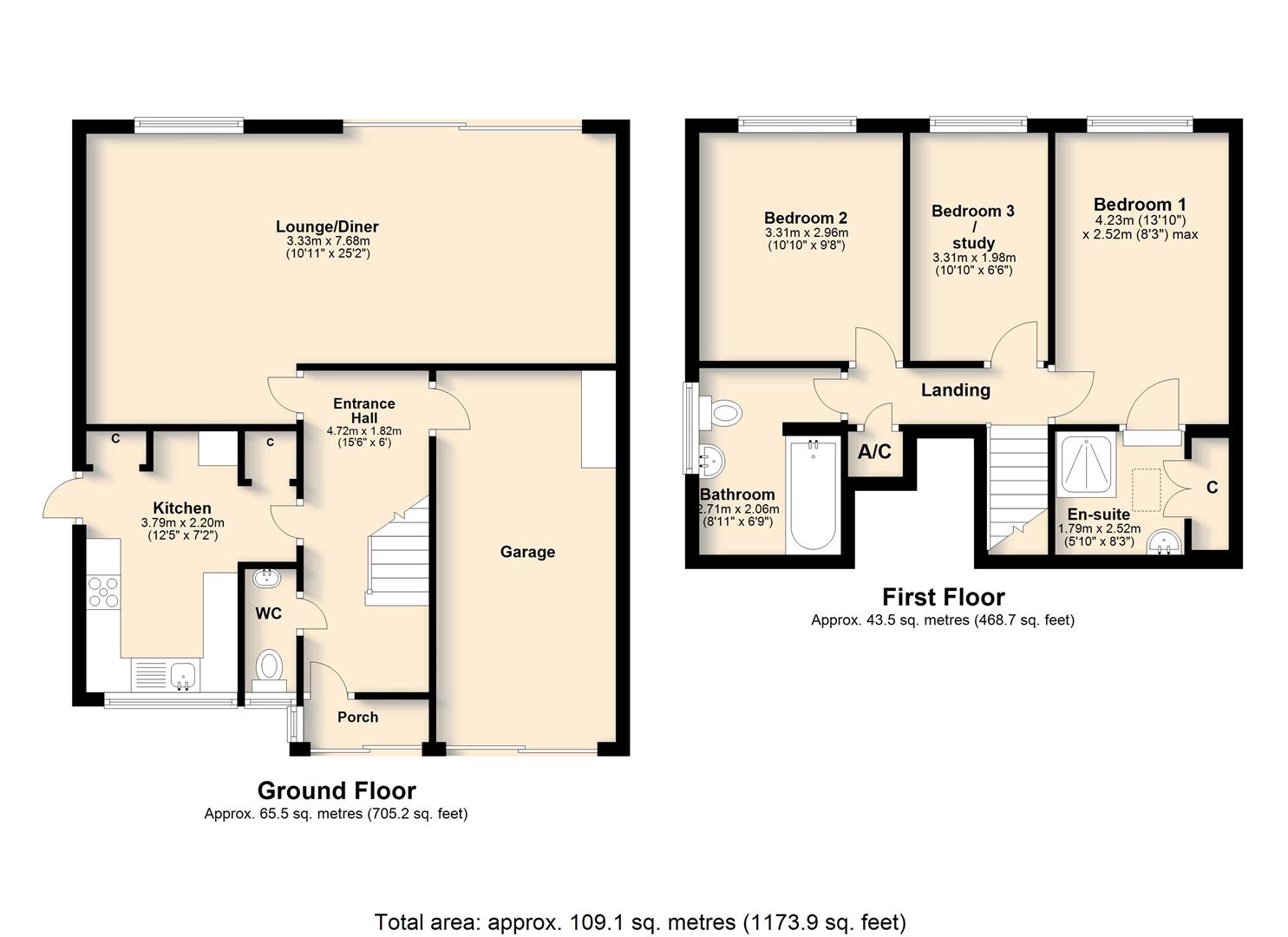 The accommodation in total comprises; hallway, ground floor WC, fitted kitchen, living/dining room, internal door to garage, first floor landing, 3 bedrooms, en-suite shower room and further bathroom.