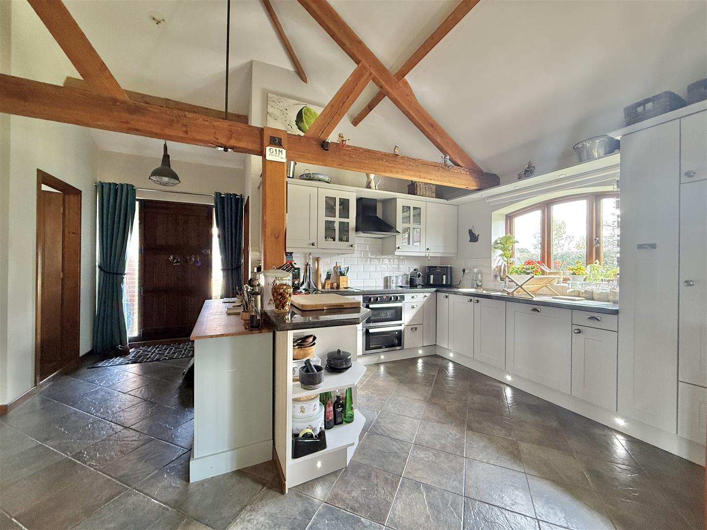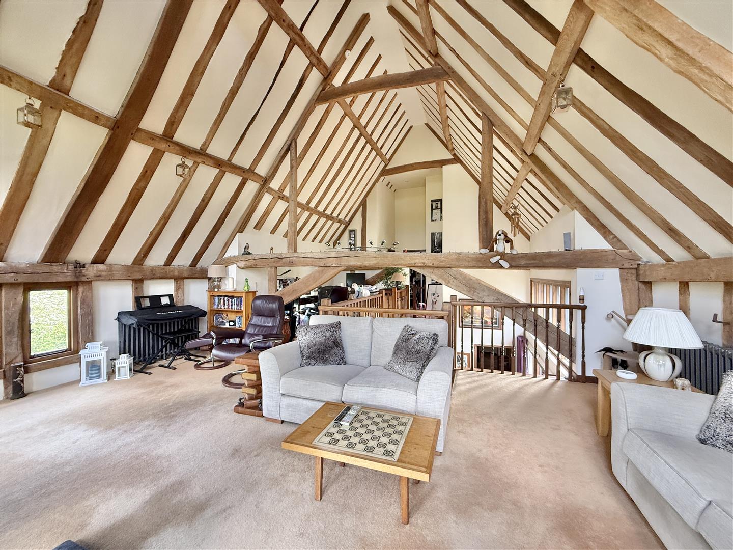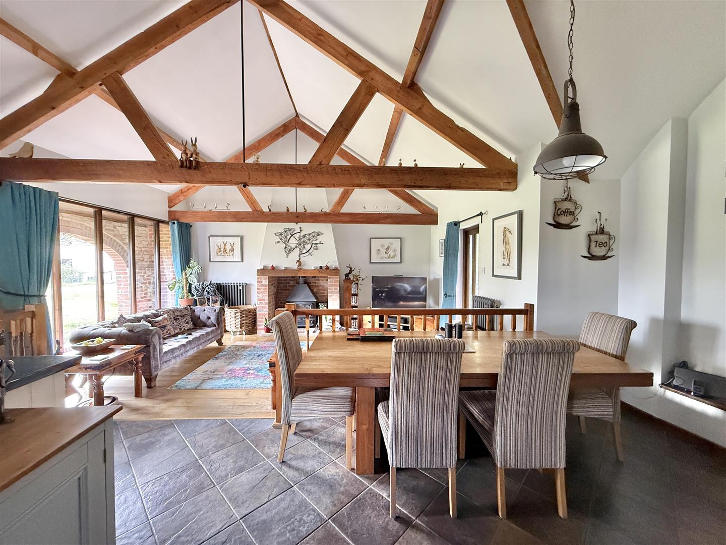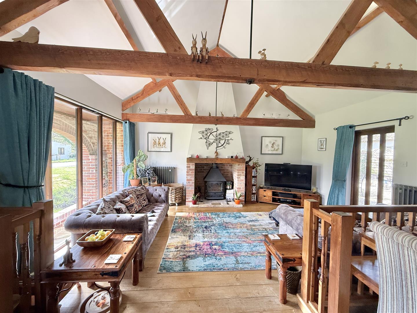 This impressive barn offers flexible and spacious living accommodation amounting to around 204.3sqm (2,200 sqft) with potential to convert the attached stable yard, subject to the necessary planning consents being obtained. The layout has been designed to cater for modern family living with a large open plan kitchen/dining/living room which is ideal for social and family gatherings and a warming wood burning stove ideal for the chilly evenings. The kitchen features an integrated dishwasher, wine rack and integrated fridge and there is space for additional appliances in the utility room. The boot room provides a useful space for storing coats and shoes and also for airing washing as it houses a recently installed combi-boiler. The accommodation also includes a day-room, which could easily be used as a formal dining room, in turn leading through to an impressive glazed hallway with stairs leading up to the galleried first floor sitting room. This vaulted room features the tie beams and a wood burning stove and has windows to three aspects, allowing plenty of natural light and displaying views across the garden and the fields beyond. The space even incorporates an area which could be used as a study/office. Immediately below is the main bedroom with two sets of fitted wardrobes and an en-suite shower room. There are two bedrooms and bathroom on the first floor accessed from the other hallway stairs, with a fourth bedroom below, benefitting from a 'Jack and Jill' en-suite shower room.