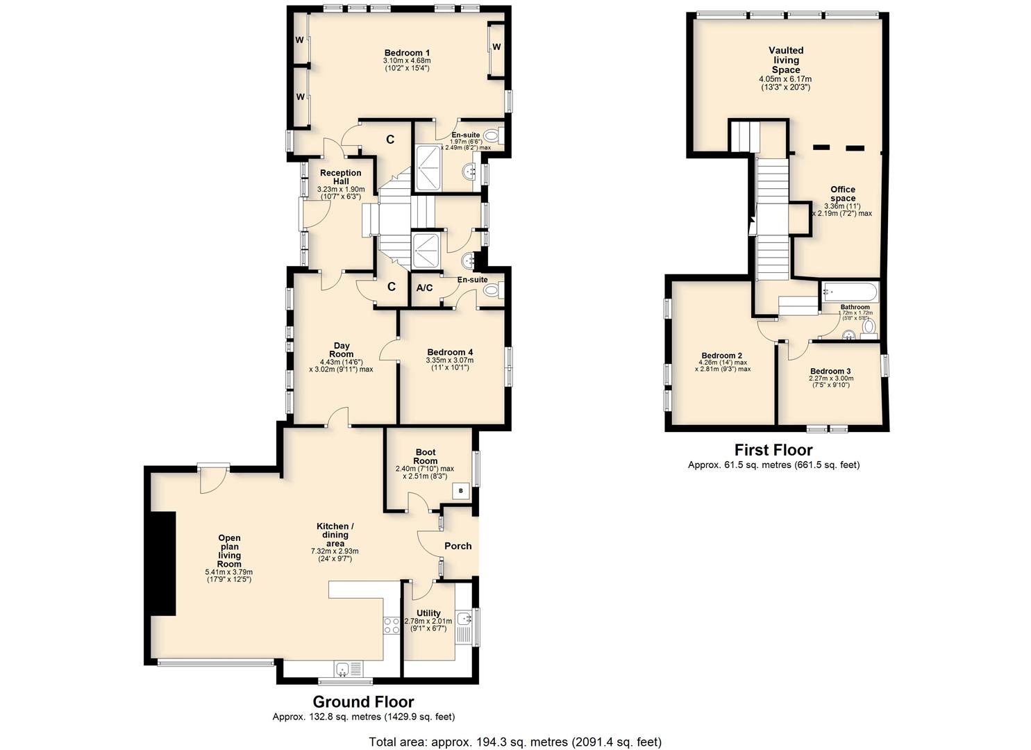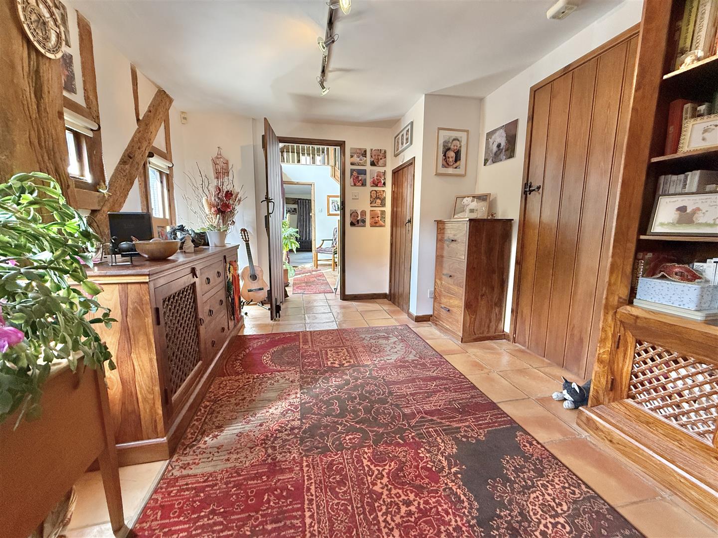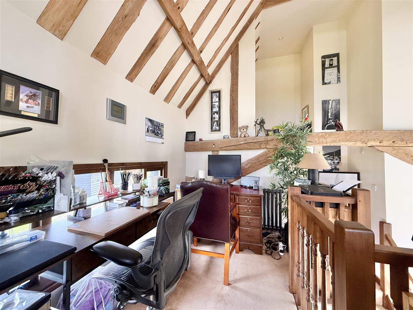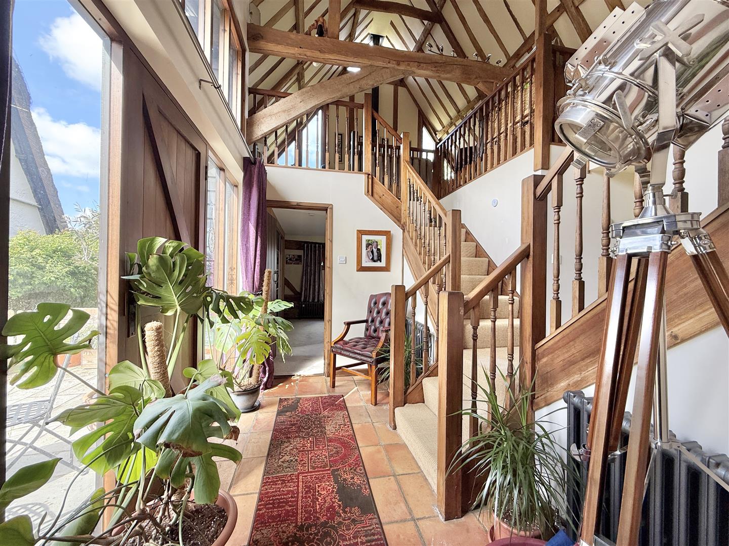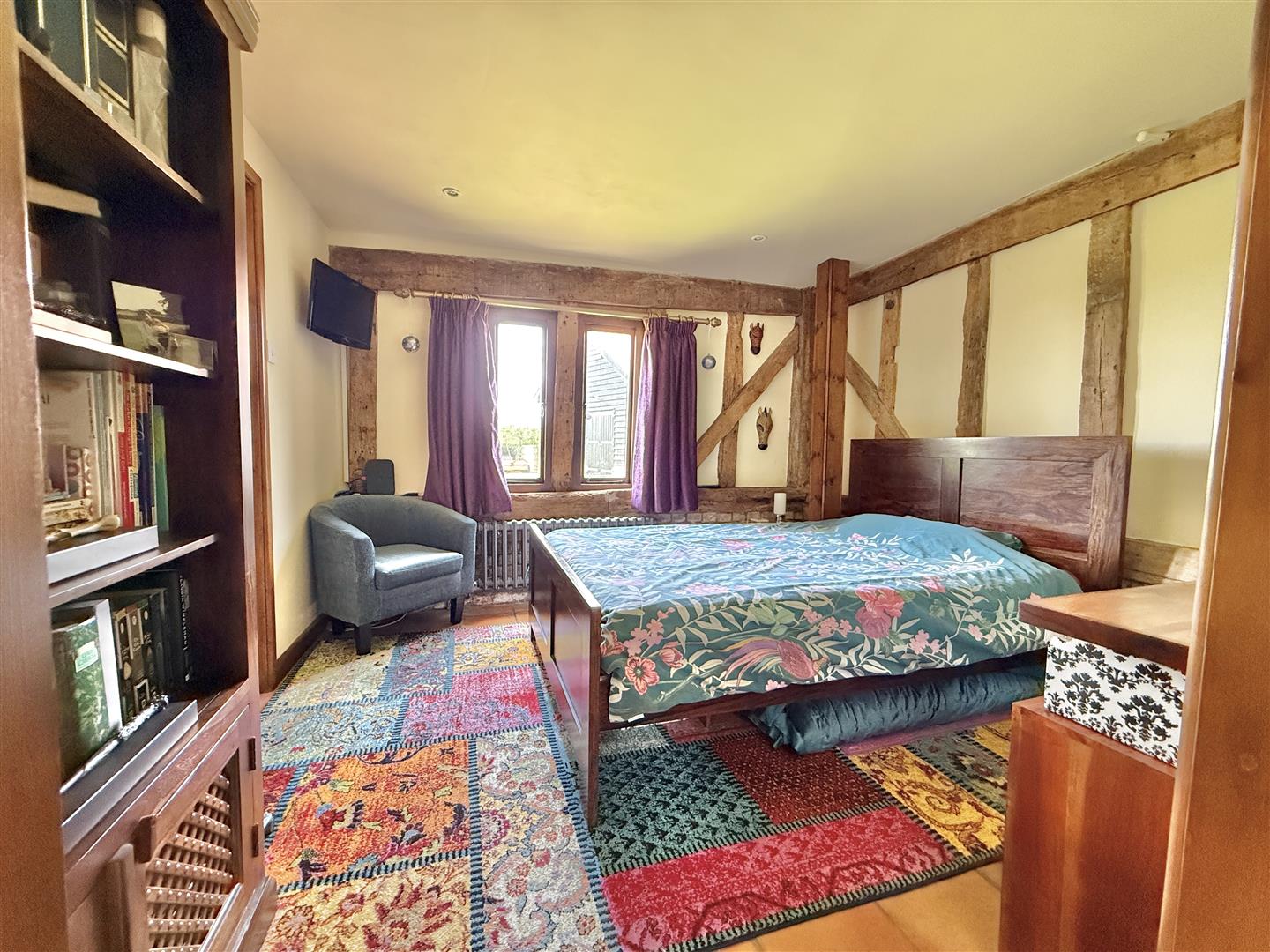 This impressive barn offers flexible and spacious living accommodation amounting to around 204.3sqm (2,200 sqft) with potential to convert the attached stable yard, subject to the necessary planning consents being obtained. The layout has been designed to cater for modern family living with a large open plan kitchen/dining/living room which is ideal for social and family gatherings and a warming wood burning stove ideal for the chilly evenings. The kitchen features an integrated dishwasher, wine rack and integrated fridge and there is space for additional appliances in the utility room. The boot room provides a useful space for storing coats and shoes and also for airing washing as it houses a recently installed combi-boiler. The accommodation also includes a day-room, which could easily be used as a formal dining room, in turn leading through to an impressive glazed hallway with stairs leading up to the galleried first floor sitting room. This vaulted room features the tie beams and a wood burning stove and has windows to three aspects, allowing plenty of natural light and displaying views across the garden and the fields beyond. The space even incorporates an area which could be used as a study/office. Immediately below is the main bedroom with two sets of fitted wardrobes and an en-suite shower room. There are two bedrooms and bathroom on the first floor accessed from the other hallway stairs, with a fourth bedroom below, benefitting from a 'Jack and Jill' en-suite shower room.