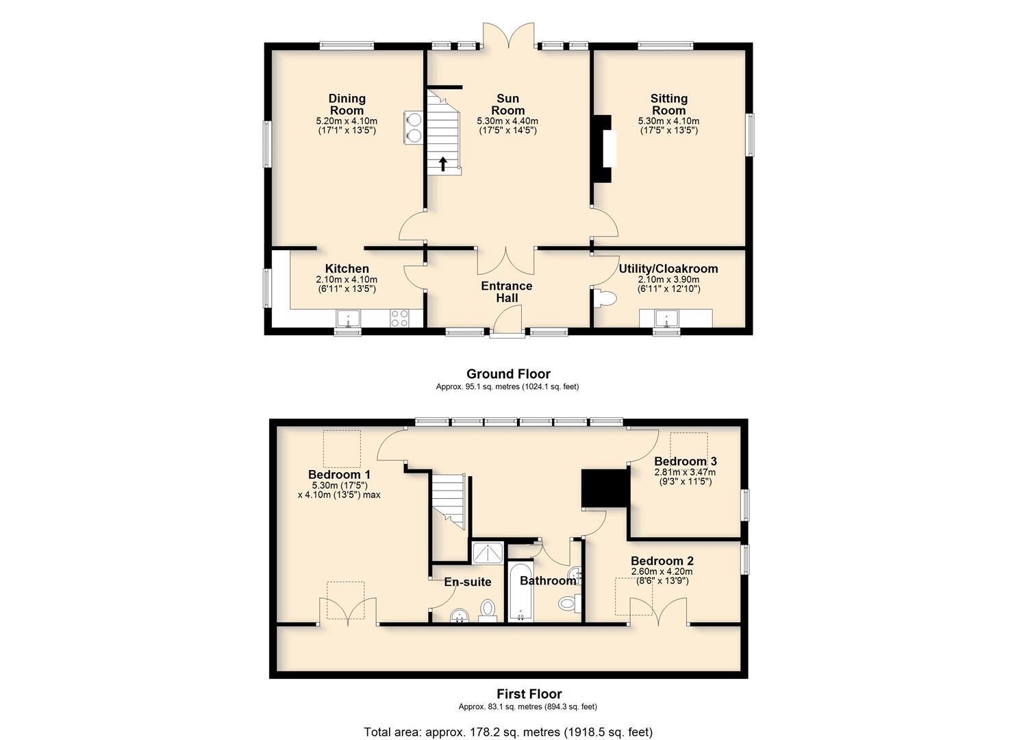 Upstairs, three double bedrooms are arranged around a spacious and partially vaulted landing, which doubles as a study area and enjoys elevated views through large windows. The principal bedroom benefits from fitted wardrobes and an en-suite shower room, whilst the remaining bedrooms are served by a well-appointed family bathroom.
