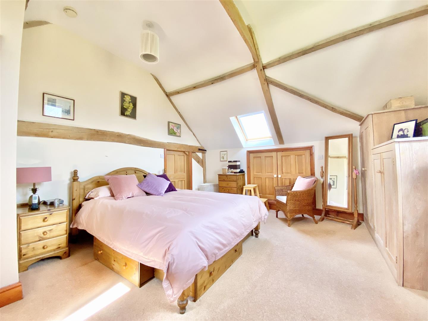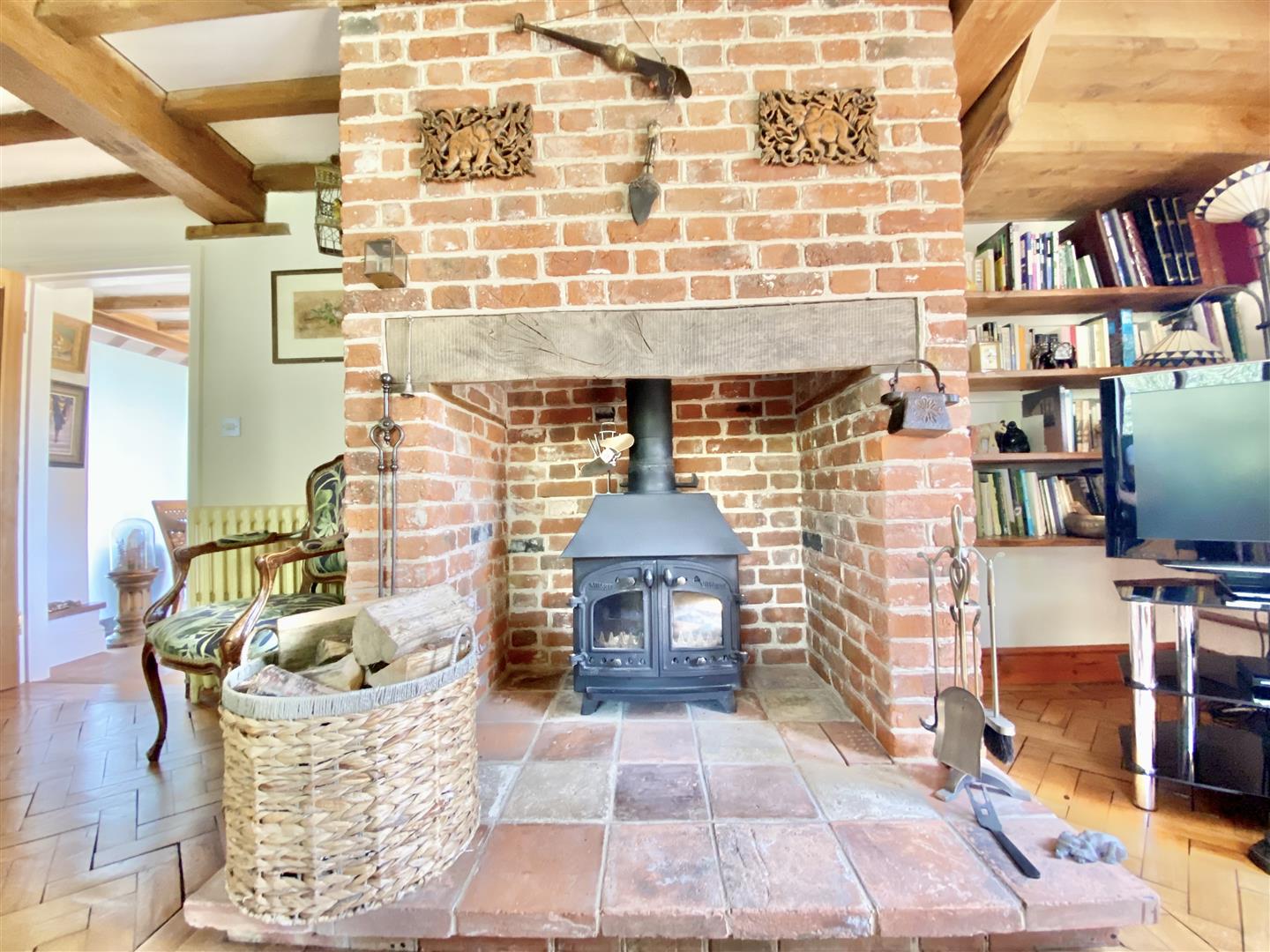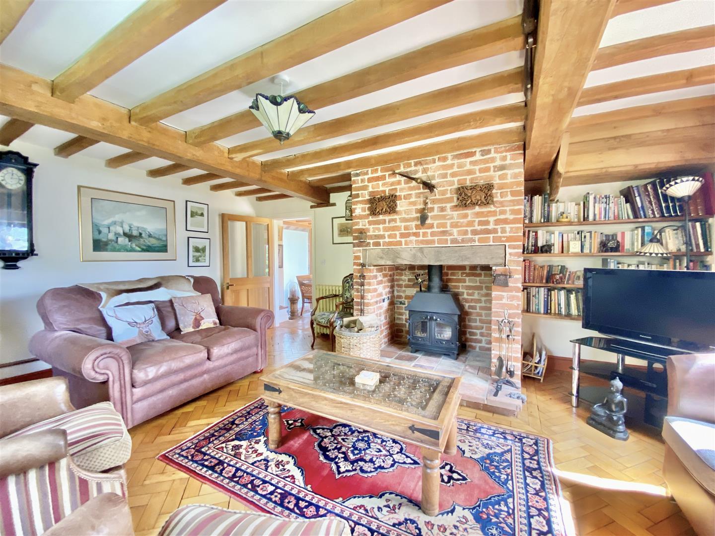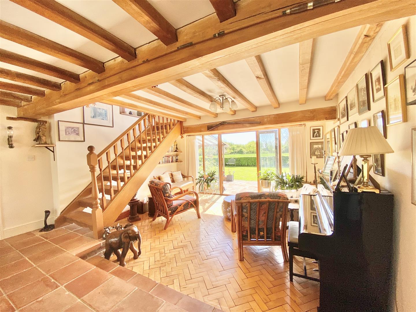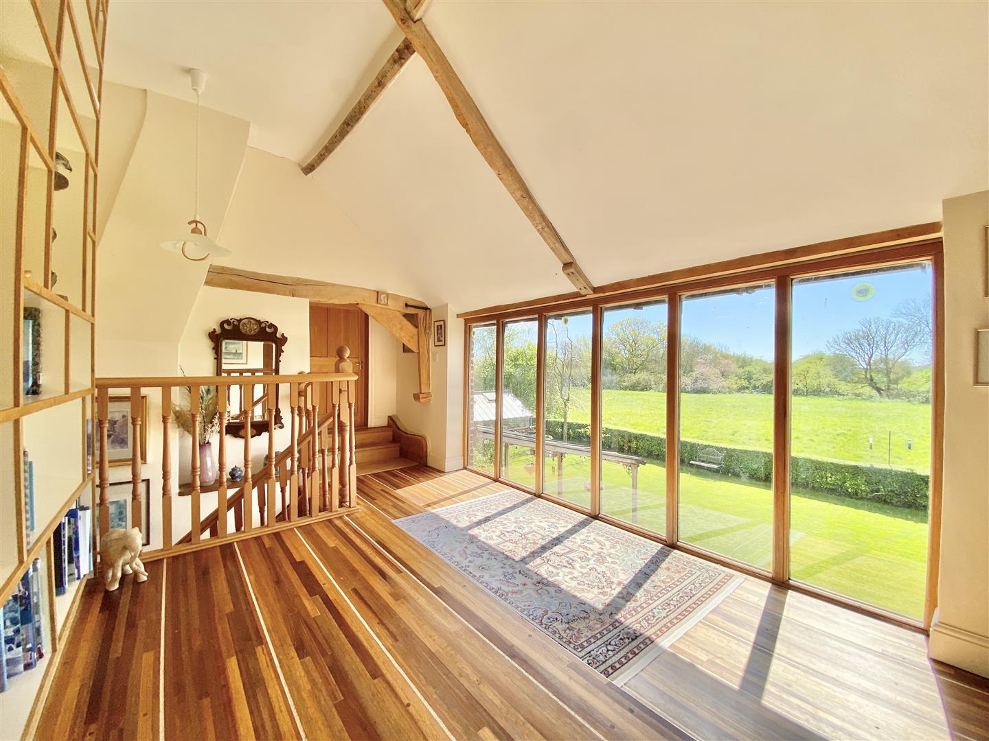 The accommodation is both spacious and characterful, with the ground floor centred around an impressive vaulted entrance hall, flooded with natural light from full-height glazing. From here, double doors lead through to the main living space, a striking split-level room with exposed oak beams, an oak staircase, and large windows and doors framing views across the garden and surrounding countryside. The formal sitting room offers a more intimate setting, featuring dual aspects and an inglenook fireplace with wood-burning stove, creating a warm and inviting atmosphere.