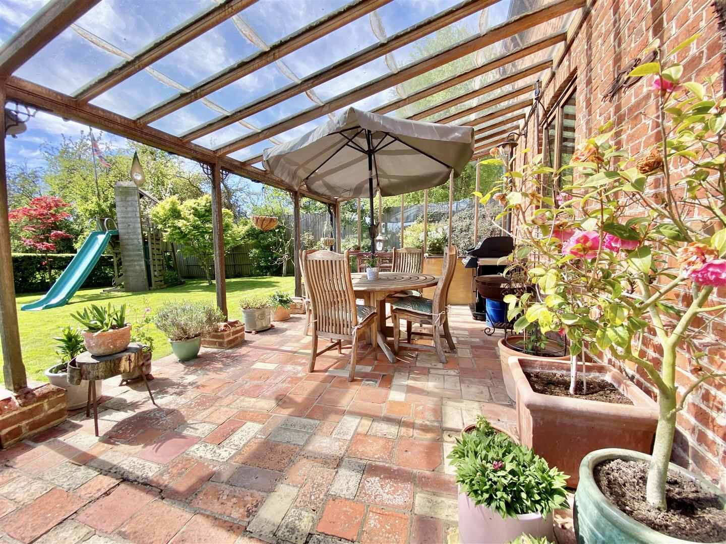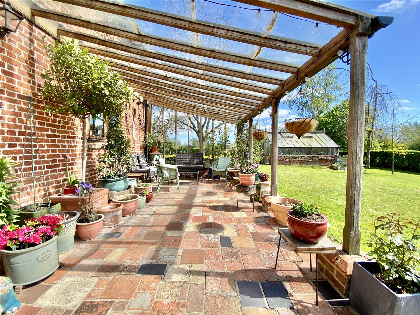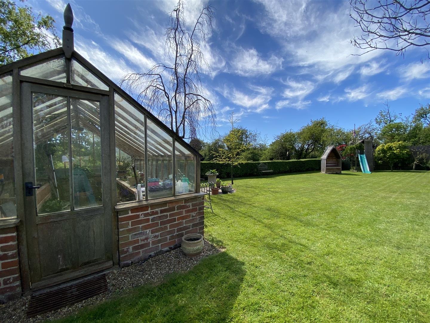 The rear garden enjoys a southerly aspect and is predominantly laid to lawn, enclosed by mature hedging and interspersed with established trees and planting. A covered terrace provides a superb space for outdoor dining and entertaining throughout the year. Additional features include a Victorian-style greenhouse and a side garden planted with fruit trees.