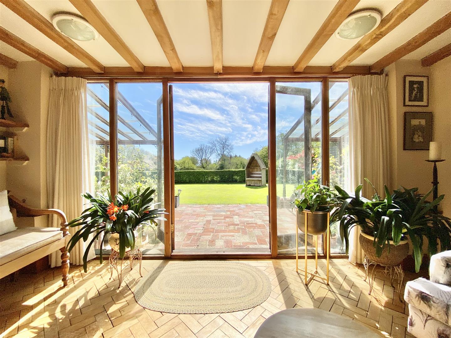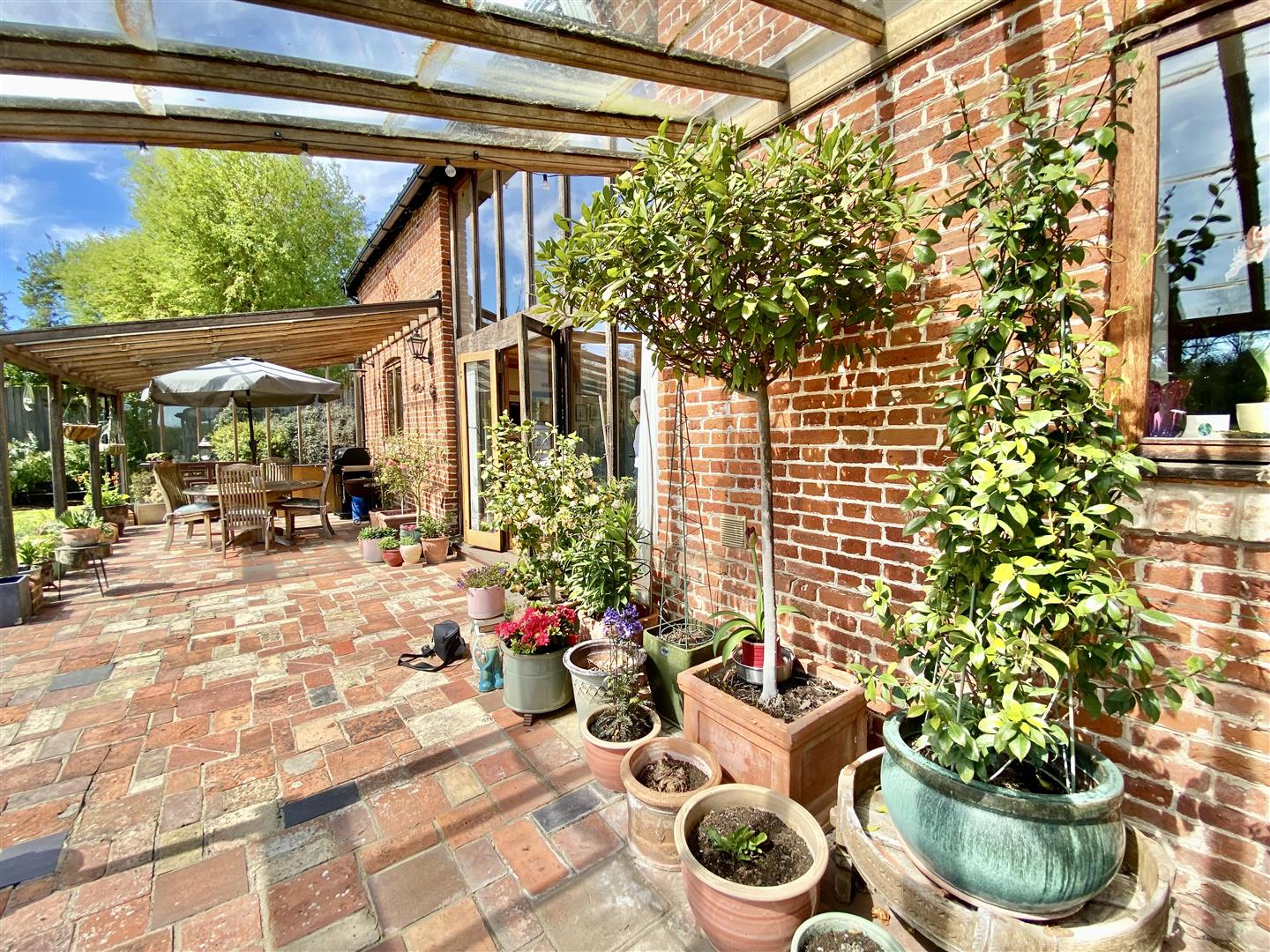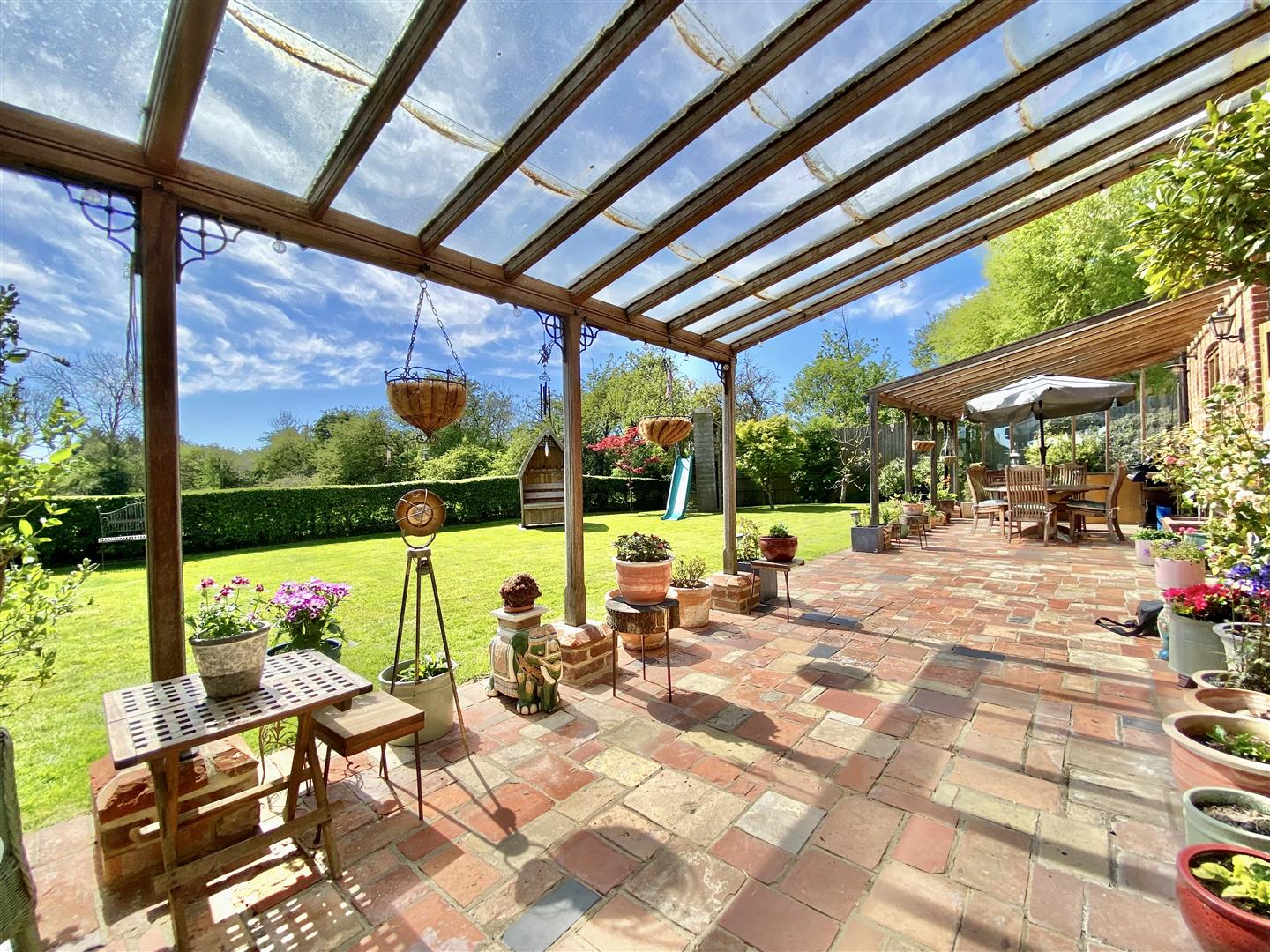 The rear garden enjoys a southerly aspect and is predominantly laid to lawn, enclosed by mature hedging and interspersed with established trees and planting. A covered terrace provides a superb space for outdoor dining and entertaining throughout the year. Additional features include a Victorian-style greenhouse and a side garden planted with fruit trees.