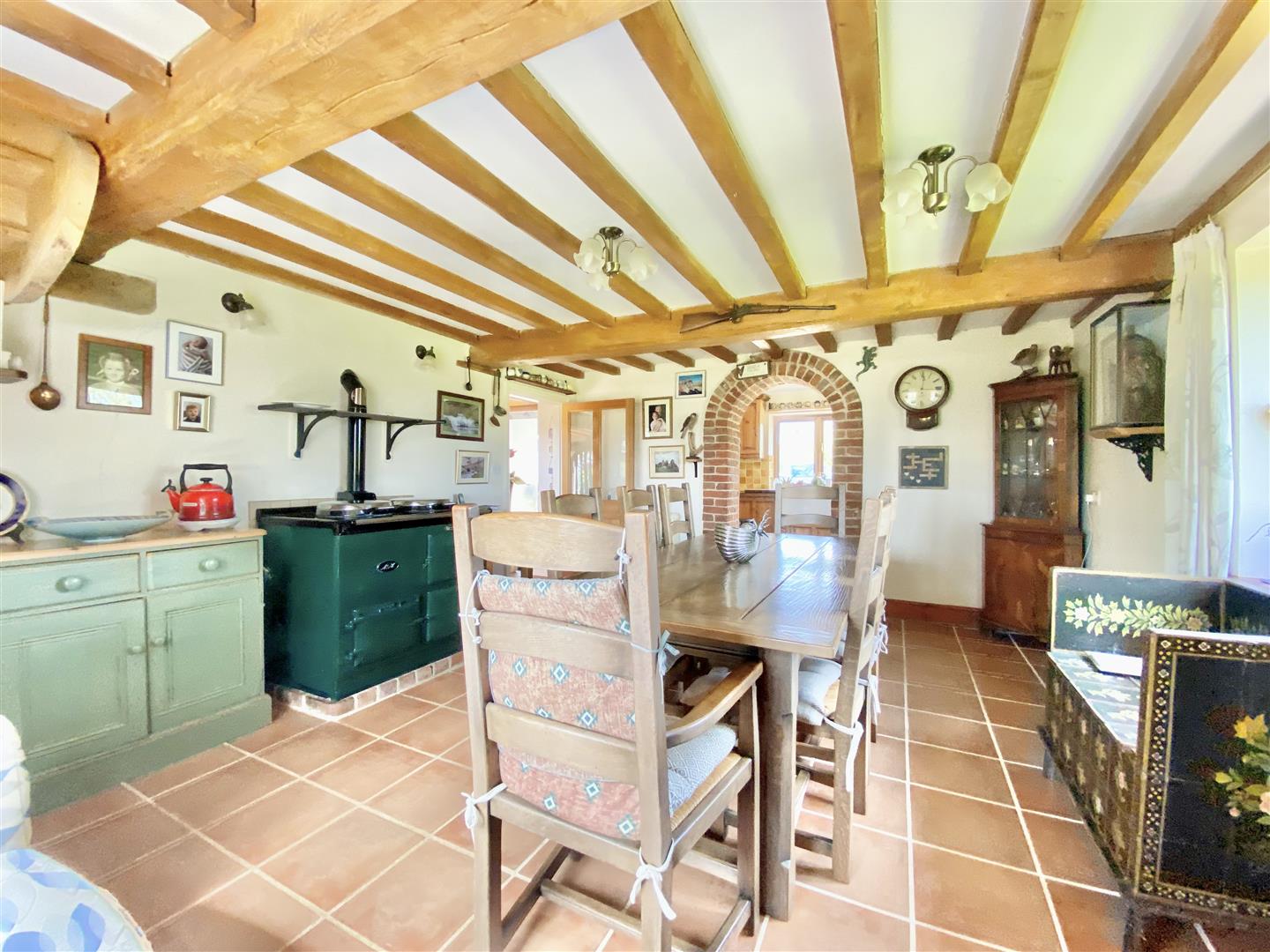 The kitchen is fitted with a range of solid wood units complemented by timber work surfaces, alongside a butler sink, integral appliances, and a four-ring hob with extractor. An opening leads through to the dining room, a generously proportioned space capable of accommodating a large dining table and additional seating. The inclusion of an oil-fired Aga adds both character and practicality. There is clear potential here to create a more open-plan arrangement, should one wish. Additional ground floor space includes a useful utility/cloakroom with further storage and laundry facilities.