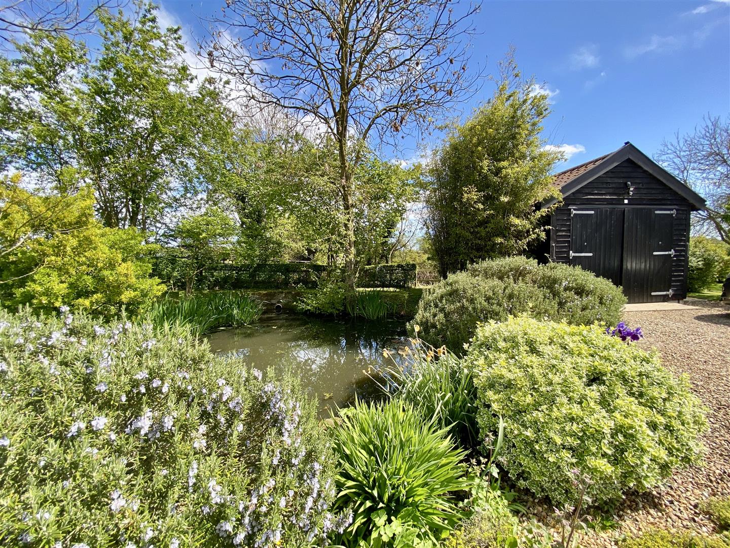 To the front, a gated driveway offers ample parking and access to the well equipped fully functioning workshop, along with two further timber-framed detached garages. The frontage is well landscaped, incorporating a pond, planting beds and a variety of trees, creating an attractive approach to the property.